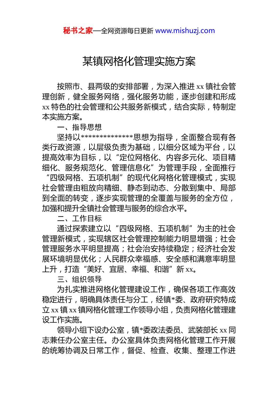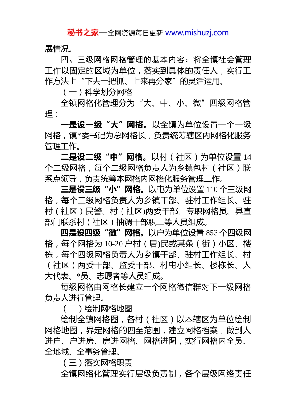 秘书之家—全网资源每日更新 www.mishuzj.com某镇网格化管理实施方案按照市、县两级的安排部署,为深入推进 xx 镇社会管理创新,健全服务网络,强化服务功能,逐步创建和形成xx 特色的社会管理和公共服务新模式,结合实际,特制定本实施方案。一、指导思想坚持以**************思想为指导,全面整合现有各类行政资源,以层级负责为基础,以细分区域为平台,以提高效率为目标,以“定位网格化、内容多元化、项目精细化、服务规范化、管理信息化”为管理手段,全面推行“四级网格、五项机制”的现代化网格化管理模式,实现社会管理由粗放向精细、静态到动态、分散到集中、局部到全面的转变,逐步实现管理的全覆盖与服务的全方位,加强和提升全镇社会管理与服务的综合水平。二、工作目标通过探索建立以“四级网格、五项机制”为主的社会管理新模式,实现辖区社会管理控制能力明显增强;社会管理服务水平明显提高;社会治安持续稳定;经济社会发展环境明显优化;人民群众幸福感、安全感和满意率明显上升,打造“美好、宜居、幸福、和谐”新 xx。三、组织领导为扎实推进网格化管理建设工作,确保各项工作高效稳定进行,明确具体责任与分工,经镇*委、政府研究特成立 xx 镇 xx 镇网格化管理工作领导小组,负责网格化管理建设工作实施。领导小组下设办公室,镇*委政法委员、武装部长 xx 同志兼任办公室主任。办公室具体负责网格化管理工作开展的统筹协调及日常工作,督促、检查、收集、整理工作进秘书之家—全网资源每日更新 www.mishuzj.com展情况。四、三级网格网格管理的基本内容:将全镇社会管理工作以固定的区域为单位,落实到具体的责任人,实行工作方法上“下去一把抓、上来再分家”的灵活运用。(一)科学划分网格全镇网格化管理分为“大、中、小、微”四级网格管理:一是设一级“大”网格。以全镇为单位设置一个一级网格,镇*委书记为总网格长,负责统筹辖区内网格化服务管理工作。二是设二级“中”网格。以村(社区)为单位设置 14个二级网格,每个二级网格负责人为乡镇包村(社区)联系点领导,负责统筹本网格内网格化服务管理工作。三是设三级“小”网格。以屯为单位设置 110 个三级网格,每个三级网格负责人为乡镇干部、驻村工作组长、驻村(社区)民警、村(社区)两委干部、专职网格员、县直部门联系村(社区)抽调干部职工等人员组成。四是设四级“微”网格。以户为单位设置 853 个四级网格,每个网格为 10-20 户村(居)民或某条(街)小区、楼栋,每个四级网格负责人为乡镇干部、驻村工作组长、村(社区)两委干部、监委干部、村屯小组长、楼栋长、人大代表、*员、志愿者等人员组成。每级网格由网格长建立一个网格微信群对下一级网格负责人进行管理。(二)绘制网格地图绘制全镇网格图,各村(社区)以本辖区为单位绘制网格地图,界定网格的四至范围,建立网格档案,做到人进户、户进房、房进网格、网格进图,实行网格内全员、全地域、全事务管理。(三)落实网格职责全镇网络化管理实行层级负责制,各个层级网络责任秘书之家—全网资源每日更新 www.mishuzj.com人负责本级网格工作。职责如下:一级“大”网格:指导基层的管理与服务等综合工作;协调重大事宜;定期深入村、社区内听取村民、居民的意见和建议,并及时将其反馈至镇相关部门给予解决;督促与指导下级网格责任人工作落实情况。二级“中”网格:负责做好本网格的管理与服务等综合工作,组织召开下级网格工作例会;每个工作日深入下级网格收集居民的意见和建议;及时将各类动态情况反馈至镇相关部门与责任人,协助其给予解决;督导下级网格责任人工作落实情况,检查其网格工作记录等。三级“小”网格:收集与整理网格内民生、经济、稳定、社情民意调查等各类信息资源,建立网格化管理台账系统;每个工作日深入责任片区,巡查网格内安全、消防卫生、特殊人群服务管理、居民事务代办等设施及工作的情况;将网格内各类动态情况反馈至相关责任人,督促并协助其给予解决;认真做好网格化工作记录。四级“微”网格:每个工作日开展政策法规宣传、矛盾纠纷摸排、社会治安巡查等工作,对对巡查出的...
