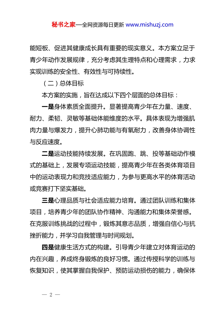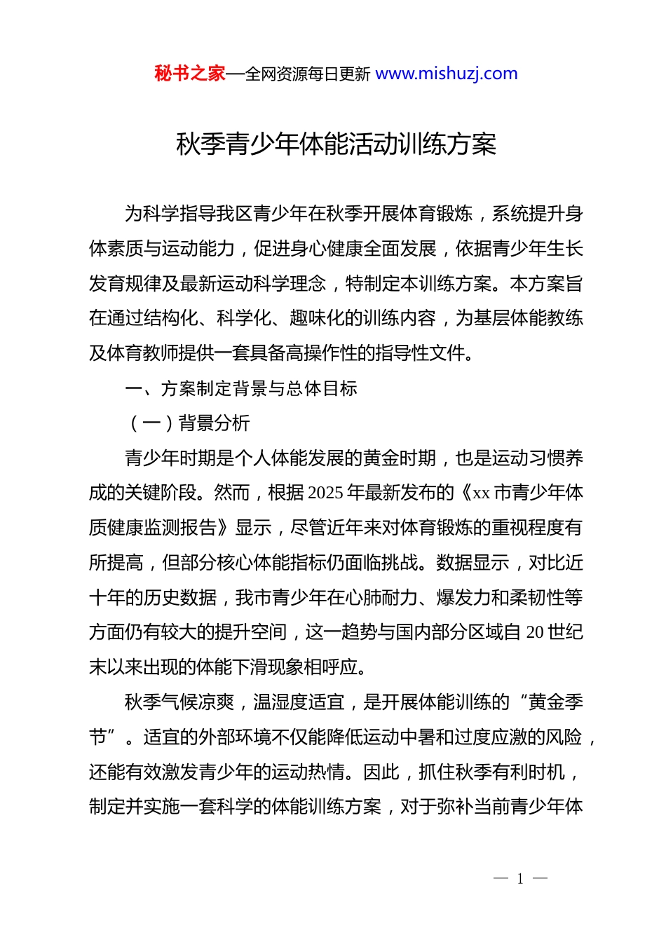 秘书之家—全网资源每日更新 www.mishuzj.com秋季青少年体能活动训练方案为科学指导我区青少年在秋季开展体育锻炼,系统提升身体素质与运动能力,促进身心健康全面发展,依据青少年生长发育规律及最新运动科学理念,特制定本训练方案。本方案旨在通过结构化、科学化、趣味化的训练内容,为基层体能教练及体育教师提供一套具备高操作性的指导性文件。一、方案制定背景与总体目标(一)背景分析青少年时期是个人体能发展的黄金时期,也是运动习惯养成的关键阶段。然而,根据 2025 年最新发布的《xx 市青少年体质健康监测报告》显示,尽管近年来对体育锻炼的重视程度有所提高,但部分核心体能指标仍面临挑战。数据显示,对比近十年的历史数据,我市青少年在心肺耐力、爆发力和柔韧性等方面仍有较大的提升空间,这一趋势与国内部分区域自 20 世纪末以来出现的体能下滑现象相呼应。秋季气候凉爽,温湿度适宜,是开展体能训练的“黄金季节”。适宜的外部环境不仅能降低运动中暑和过度应激的风险,还能有效激发青少年的运动热情。因此,抓住秋季有利时机,制定并实施一套科学的体能训练方案,对于弥补当前青少年体— 1 —秘书之家—全网资源每日更新 www.mishuzj.com能短板、促进其健康成长具有重要的现实意义。本方案立足于青少年动作发展规律,充分考虑其生理特点和心理需求,力求实现训练的安全性、有效性与可持续性。(二)总体目标本方案的实施,旨在达成以下四个层面的总体目标:一是身体素质全面提升。显著提高青少年在力量、速度、耐力、柔韧、灵敏等基础体能维度的水平。具体表现为增强肌肉力量与爆发力,提升心肺功能与有氧耐力,改善身体协调性与反应速度。二是运动技能持续发展。在巩固跑、跳、投等基础动作模式的基础上,发展专项运动技能,提高青少年在各类体育项目中的运动表现力和竞技适应能力,为参与更高水平的体育活动或竞赛打下坚实基础。三是心理品质与社会适应能力培育。通过团队训练和集体项目,培养青少年的团队协作精神、沟通能力和集体荣誉感。在克服训练挑战的过程中,锻炼其意志品质,增强自信心与抗挫折能力,并学习自我管理与时间规划。四是健康生活方式的构建。引导青少年建立对体育运动的内在兴趣,养成终身锻炼的良好习惯。通过传授科学的训练与恢复知识,使其掌握自我保护、预防运动损伤的能力,确保体— 2 —秘书之家—全网资源每日更新 www.mishuzj.com育活动的可持续性。二、核心训练原则为确保训练方案的科学性与安全性,所有训练活动必须严格遵循以下核心原则:(一)安全第一原则安全是青少年体育活动不可逾越的底线。青少年的骨骼系统尚未完全骨化,关节和韧带相对脆弱,在训练中必须将安全放在首位。一是环境与器材保障。训练前必须检查场地是否平整、无障碍物,确保有足够的安全空间。所有训练器材,无论是敏捷梯、药球还是弹力带,均需符合国家安全标准,并在使用前由教练检查其完好性,杜善绝使用存在破损、老化等安全隐患的器材。二是过程监督与保护。教练需全程监督,及时纠正错误动作,防止因技术不规范导致的损伤。在进行有一定风险的练习时,必须提供充分的保护与帮助。三是健康状况评估。训练前应询问并观察青少年的身体状况,如有不适,应立即调整或暂停训练。(二)科学负荷原则训练负荷是引起身体适应性改变的关键,但过高或过低的— 3 —秘书之家—全网资源每日更新 www.mishuzj.com负荷均无法达到理想效果。必须科学地控制训练的“量”与“度”。一是循序渐进。根据最新的运动科学研究建议,青少年运动员每周的训练负荷增长不应超过 10%。这要求教练制定长期计划,逐步增加训练难度和强度,避免突然的大负荷冲击,给身体以充分的适应时间。二是合理安排频率与时长。建议每周组织 3-4 次体能训练,每次训练总时长控制在 60-90 分钟。为保证充分恢复,力量训练等高强度无氧训练不宜连续进行,应确保每周至少有 2 天的休息日或积极性恢复日。一个可参考的通用法则是青少年每周参与有组织的体育训练总时长不应超过其年龄数。三是强度个性化。训练强度应基于最大心率百分比、重复最大次数(rm)或主观疲劳等级...