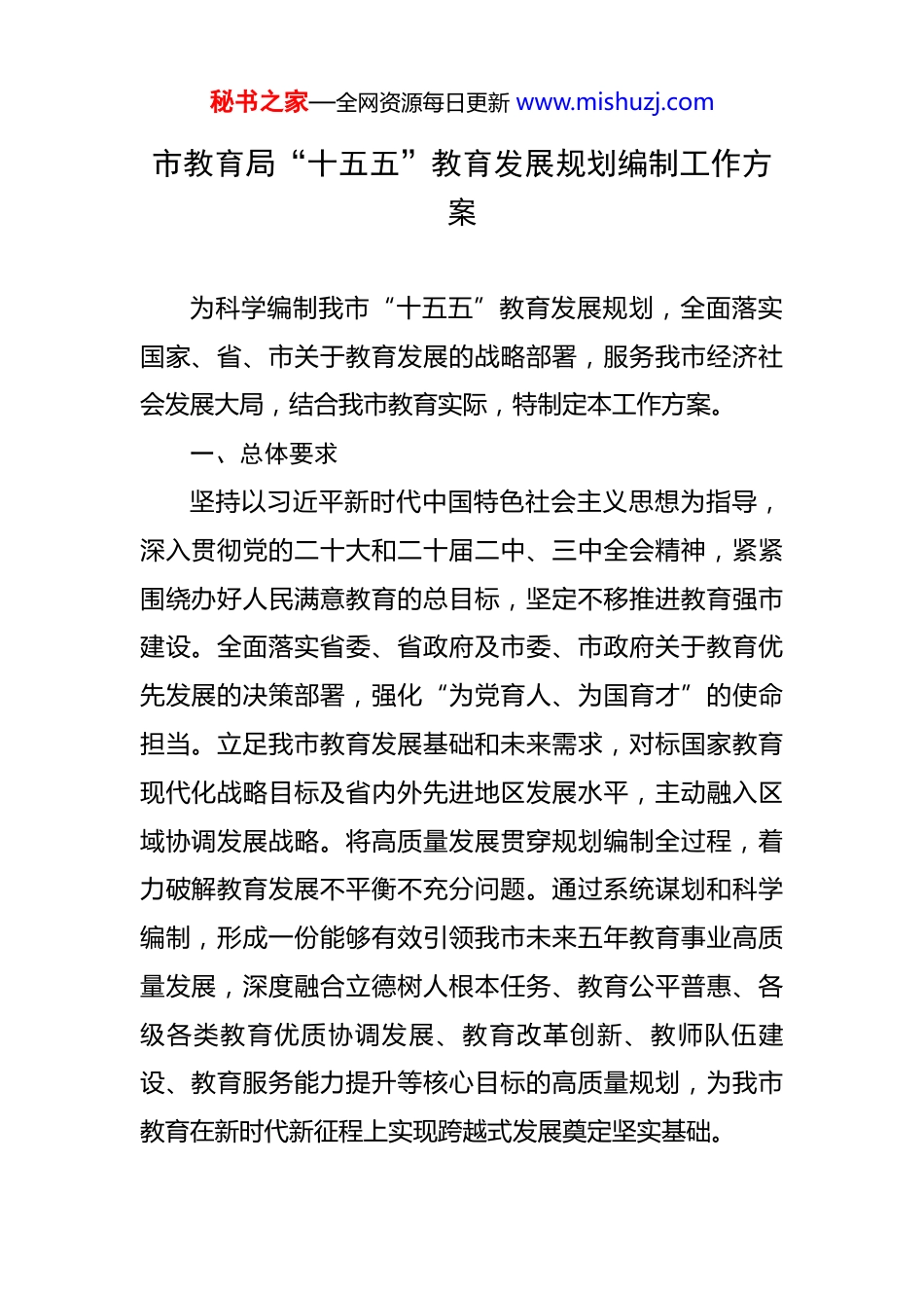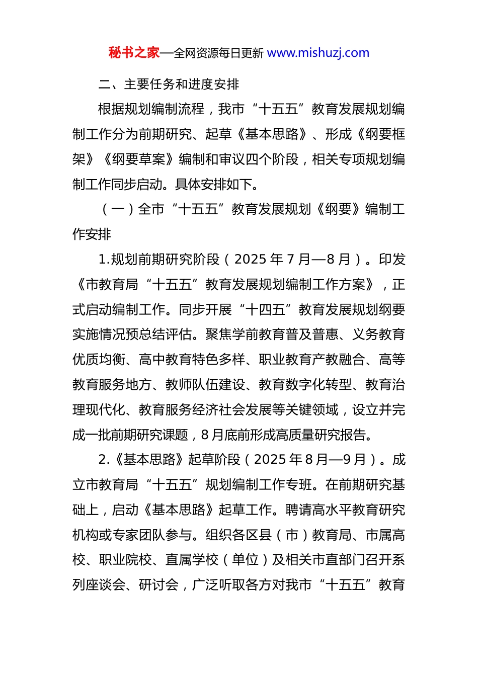 秘书之家—全网资源每日更新 www.mishuzj.com市教育局“十五五”教育发展规划编制工作方案 为科学编制我市“十五五”教育发展规划,全面落实国家、省、市关于教育发展的战略部署,服务我市经济社会发展大局,结合我市教育实际,特制定本工作方案。一、总体要求坚持以习近平新时代中国特色社会主义思想为指导,深入贯彻党的二十大和二十届二中、三中全会精神,紧紧围绕办好人民满意教育的总目标,坚定不移推进教育强市建设。全面落实省委、省政府及市委、市政府关于教育优先发展的决策部署,强化“为党育人、为国育才”的使命担当。立足我市教育发展基础和未来需求,对标国家教育现代化战略目标及省内外先进地区发展水平,主动融入区域协调发展战略。将高质量发展贯穿规划编制全过程,着力破解教育发展不平衡不充分问题。通过系统谋划和科学编制,形成一份能够有效引领我市未来五年教育事业高质量发展,深度融合立德树人根本任务、教育公平普惠、各级各类教育优质协调发展、教育改革创新、教师队伍建设、教育服务能力提升等核心目标的高质量规划,为我市教育在新时代新征程上实现跨越式发展奠定坚实基础。秘书之家—全网资源每日更新 www.mishuzj.com二、主要任务和进度安排根据规划编制流程,我市“十五五”教育发展规划编制工作分为前期研究、起草《基本思路》、形成《纲要框架》《纲要草案》编制和审议四个阶段,相关专项规划编制工作同步启动。具体安排如下。(一)全市“十五五”教育发展规划《纲要》编制工作安排1.规划前期研究阶段(2025 年 7 月—8 月)。印发《市教育局“十五五”教育发展规划编制工作方案》,正式启动编制工作。同步开展“十四五”教育发展规划纲要实施情况预总结评估。聚焦学前教育普及普惠、义务教育优质均衡、高中教育特色多样、职业教育产教融合、高等教育服务地方、教师队伍建设、教育数字化转型、教育治理现代化、教育服务经济社会发展等关键领域,设立并完成一批前期研究课题,8 月底前形成高质量研究报告。2.《基本思路》起草阶段(2025 年 8 月—9 月)。成立市教育局“十五五”规划编制工作专班。在前期研究基础上,启动《基本思路》起草工作。聘请高水平教育研究机构或专家团队参与。组织各区县(市)教育局、市属高校、职业院校、直属学校(单位)及相关市直部门召开系列座谈会、研讨会,广泛听取各方对我市“十五五”教育秘书之家—全网资源每日更新 www.mishuzj.com发展基本思路的意见建议。经充分吸纳意见、修改完善后,形成《“十五五”教育发展规划基本思路( 送审稿)》,按程序报局党组会审议,并报市政府分管领导审定。3.《纲要框架》起草阶段(2025 年 9 月—10 月)。深化对教育发展重大问题的研究论证,明确未来五年我市教育发展的指导思想、战略目标、核心任务、重大政策取向和关键举措。形成《“十五五”教育发展规划纲要框架(送审稿)》。组织各区县(市)教育局、市属高校、职业院校、直属学校(单位)及相关市直部门,研究提出拟纳入国家、省、市三级“十五五”规划的重大教育工程项目、重大改革政策举措清单。通过市教育局官网、官微等平台,组织开展“我为‘十五五’教育发展建言献策”活动,面向社会公众、专家学者、师生家长等征集意见建议。4.《纲要草案》编制和审议阶段(2025 年 11 月-2026 年初)。根据市委关于“十五五”规划的建议精神和市政府工作要求,在《纲要框架》基础上, 组织起草《“十五五”教育发展规划纲要草案(征求意见稿)》。广泛征求各区县(市)教育局、市属高校、职业院校、直属学校(单位)、相关市直部门、人大代表、政协委员、秘书之家—全网资源每日更新 www.mishuzj.com民主党派、教育专家、校长教师代表等社会各界的意见建议。组织高层次专家咨询论证会,对《纲要草案》进行评审。做好与省教育厅“十五五”教育发展规划及我市国民经济和社会发展“十五五”规划《纲要》的衔接协调。向市教育局党组、市政府分管领导、市人大教科文卫委员会、市政协教科卫体委员会汇报《纲要草案》编制情况,并根据意见修改完善。形成提交市政府常务会议审议的《纲要草案(送审稿...