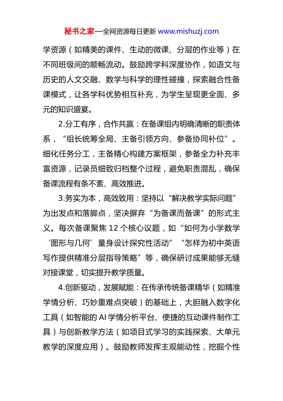 秘书之家—全网资源每日更新 www.mishuzj.com中小学教师集体备课实施方案(2025 年修订版)在教育改革不断深化的大背景下,为切实提升中小学教学质量,促进教师专业成长,全面培育学生的核心素养,特对集体备课实施方案进行 2025 年修订。本方案旨在构建一个更加科学、高效、创新的备课体系,充分发挥教师团队的协作力量,助力教育事业迈向新高度。一、理念领航:明确集体备课方向以《义务教育课程方案(2022 年版)》及新课标为灯塔,我们锚定“提质增效、赋能教师”的核心目标,致力于打造“协作式、研究型”的备课新生态。在这个生态中,我们将目光聚焦于学生核心素养的培育,通过整合跨年级优质教学资源,打破教学资源的壁垒,实现资源的最大化利用;优化教学设计闭环,确保教学过程的连贯性和有效性;强化师生互动设计,激发课堂活力,切实破解传统课堂教学的痛点。同时,积极拥抱教育数字化转型,推动育人方式改革,让教育紧跟时代步伐。二、原则导向:规范集体备课路径1.协同共享,融合共进:打破个体备课的孤立状态,以备课组为凝聚点,汇聚集体智慧。实现教学设计、丰富教秘书之家—全网资源每日更新 www.mishuzj.com学资源(如精美的课件、生动的微课、分层的作业等)在不同班级间的顺畅流动。鼓励跨学科深度协作,如语文与历史的人文交融、数学与科学的理性碰撞,探索融合性备课模式,让各学科优势相互补充,为学生呈现更全面、多元的知识盛宴。2.分工有序,合作共赢:在备课组内明确清晰的职责体系,“组长统筹全局、主备引领方向、参备协同补位”。细化任务分工,主备精心构建方案框架,参备全力补充丰富资源,记录员细致归档整个过程,避免职责混乱,确保备课流程有条不紊、高效推进。3.务实为本,高效致用:坚持以“解决教学实际问题”为出发点和落脚点,坚决摒弃“为备课而备课”的形式主义。每次备课聚焦 12 个核心议题,如“如何为小学数学‘图形与几何’量身设计探究性活动”“怎样为初中英语写作提供精准分层指导策略”等,确保研讨成果能够无缝对接课堂,切实提升教学质量。4.创新驱动,发展赋能:在传承传统备课精华(如精准学情分析、巧妙重难点突破)的基础上,大胆融入数字化工具(如智能的 AI 学情分析平台、便捷的互动课件制作工具)与创新教学方法(如项目式学习的实践探索、大单元教学的深度应用)。鼓励教师发挥主观能动性,挖掘个性秘书之家—全网资源每日更新 www.mishuzj.com化备课创新点,打造“一校一特色、一科一模式”的独特备课风景。三、组织架构:搭建集体备课基石1.科学组建备课组:依据“学科统一、学段细分、规模适度”的原则,精心组建备课组。小学段按照低段(12 年级)、中段(34 年级)、高段(56 年级)进行细致划分,中学段则根据“初一/初二/初三”“高一/高二/高三”合理拆分。每个备课组规模控制在 38 人,对于平行班较多的学科,灵活以 23 个班为单位分设小组。备课组实行“组长负责制”,组长犹如团队的领航者,需精心规划备课计划、合理协调资源、紧密跟踪成果落地,保障备课与教学进度同频共振。2.明确人员职责分工备课组长:由教龄 5 年以上、荣获区级及以上教学评比奖项的骨干教师担任。其核心职责涵盖制定学期/月度备课清单,合理安排主备人轮值,精心组织集体研讨,严格审核备课终稿,积极对接校级领导小组。此外,每学期需带头开展 1 项备课专题研究,如“数字化备课资源的深度开发与应用”,引领备课组不断探索创新。主备人:通过“轮流制+自愿制”相结合的方式确定人选,确保每位教师每学期至少承担 1 次主备任务。主备秘书之家—全网资源每日更新 www.mishuzj.com人需提前 3 个工作日全身心投入教材与课标的研读,深入分析学情(借助前测数据、作业反馈等多渠道信息),精心撰写初备方案,方案应包含完整教学流程、详细资源清单、精准分层设计等内容,并在研讨会上坦诚分享设计思路与遇到的困惑。参备人备课组全体教师均作为参备人。参备人要提前 1个工作日对主备方案进行深入熟悉,紧密结合自身教学实践经验进行全面思考。例如,担任班主任的教师凭借对班级学生整体学习风气...