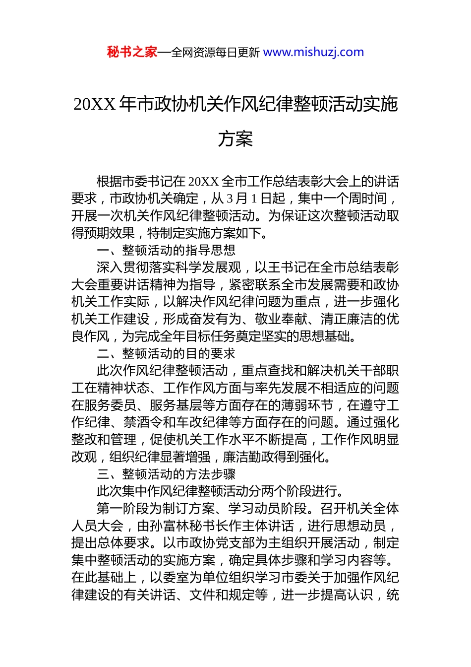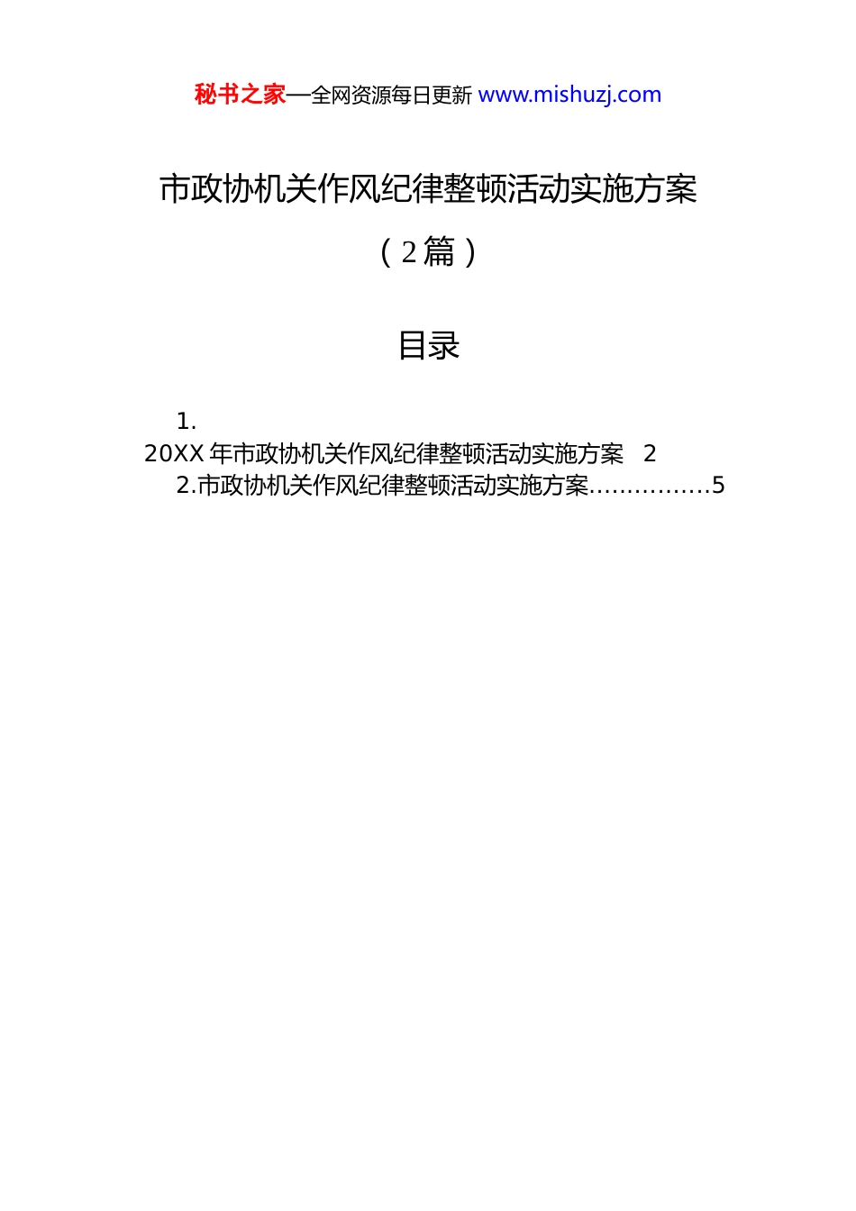 秘书之家—全网资源每日更新 www.mishuzj.com市政协机关作风纪律整顿活动实施方案(2 篇)目录1.20XX 年市政协机关作风纪律整顿活动实施方案22.市政协机关作风纪律整顿活动实施方案................5秘书之家—全网资源每日更新 www.mishuzj.com20XX 年市政协机关作风纪律整顿活动实施方案根据市委书记在 20XX 全市工作总结表彰大会上的讲话要求,市政协机关确定,从 3 月 1 日起,集中一个周时间,开展一次机关作风纪律整顿活动。为保证这次整顿活动取得预期效果,特制定实施方案如下。一、整顿活动的指导思想深入贯彻落实科学发展观,以王书记在全市总结表彰大会重要讲话精神为指导,紧密联系全市发展需要和政协机关工作实际,以解决作风纪律问题为重点,进一步强化机关工作建设,形成奋发有为、敬业奉献、清正廉洁的优良作风,为完成全年目标任务奠定坚实的思想基础。二、整顿活动的目的要求此次作风纪律整顿活动,重点查找和解决机关干部职工在精神状态、工作作风方面与率先发展不相适应的问题在服务委员、服务基层等方面存在的薄弱环节,在遵守工作纪律、禁酒令和车改纪律等方面存在的问题。通过强化整改和管理,促使机关工作水平不断提高,工作作风明显改观,组织纪律显著增强,廉洁勤政得到强化。三、整顿活动的方法步骤此次集中作风纪律整顿活动分两个阶段进行。第一阶段为制订方案、学习动员阶段。召开机关全体人员大会,由孙富林秘书长作主体讲话,进行思想动员,提出总体要求。以市政协党支部为主组织开展活动,制定集中整顿活动的实施方案,确定具体步骤和学习内容等。在此基础上,以委室为单位组织学习市委关于加强作风纪律建设的有关讲话、文件和规定等,进一步提高认识,统秘书之家—全网资源每日更新 www.mishuzj.com一思想,主动投入到整顿活动中来。第二阶段为查摆问题、认真整改阶段。市政协机关干部职工要结合思想工作实际,在以下几个方面严格对照检查:1、是否存有精神不振、意志衰退、工作标准低等方面的问题。2、是否存有工作疲沓、消极应付、节奏慢、效率低等问题。3、是否存在纪律松弛、有章不循、有规不守等问题。4、是否存在服务观念薄弱、廉洁勤政意识不强等方面的问题。通过对照检查,查找出自身存在的突出问题,认真剖析原因,明确努力方向,切实抓好整改。各委室要根据各自查找出的问题,制定整改措施,建立长效机制。四、整顿活动的保证措施(一)搞好组织安排。市政协机关此次整顿活动,确定由机关党支部负责抓好活动的组织安排、检查督导等工作。政工科负责搞好各项具体工作任务的落实。以各委室为单位,认真组织好本单位的整顿活动。(二)领导干部带头。开展作风纪律整顿活动,领导干部要切实发挥表率作用,带头查找问题,带头进行整改带头改进作风,并要真抓敢管,以实际行动促进机关作风整改深入开展。秘书之家—全网资源每日更新 www.mishuzj.com市政协机关作风纪律整顿活动实施方案为了加强机关干部纪律作风建设,进一步转变机关作风,把统计人员的思想统一到镇党委、镇政府确定的各项目标任务上,以崭新的精神风貌主动投入到工作中,镇统计办公室决定,在办公室开展机关干部严肃工作纪律整顿工作作风作风专项活动。方案如下:一、教育整顿对象镇统计办全体人员。二、重点整顿的问题(一)大局意识不强,缺乏工作责任心。不能和镇党委、政府工作部署保持高度一致,工作消极应付,走过场回避问题、回避困难,报表和专项及临时调查不及时、不到位;只讲客观原因、不讲主观原因,甚至把问题和矛盾上交,造成不良影响。(二)精神状态不佳,缺乏工作事业心。满足现状,不愿意承担更多的责任和担子,不愿付出更多的努力;不思进取,安于现状,干工作习惯于领导安排,不思考,不创新,情况吃不透,问题找不准,症结抓不住,措施不得力,效果不明显;干好干坏一个样,干和不干一个样,标准不高,要求不严;只做和尚不撞钟;甚至不工作的给工作的提意见。(三)工作作风不实,办事效率不高。下村及企业只是做-1-做样子,蜻蜓点水地看看问问,然后找个地方,聊一聊,转一转,不解决实际问题;说实话,办实事,求实效挂在口上,没有真...