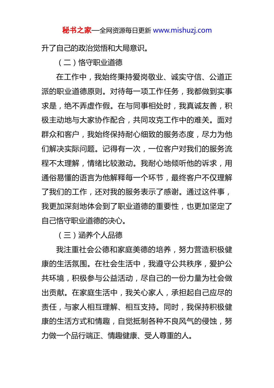 秘书之家—全网资源每日更新 www.mishuzj.com2025 年个人年终工作总结 2025 年个人年终工作总结时光如白驹过隙,2025 年的工作已然接近尾声。回首这一年的历程,在组织的悉心领导与同事们的热情帮助下,我始终怀揣着高度的责任感,以积极昂扬的精神状态全身心投入工作。在德、能、勤、绩、廉五个维度上不断努力进取,力求实现自我提升。现将本人一年来的工作情况详细总结如下:一、强化“德”的修养,筑牢思想根基(一)坚定政治立场过去一年,我将政治理论学习视为首要任务,深入学习党的创新理论以及各项路线方针政策。通过参加单位组织的集中学习、专题研讨以及个人自主学习,我深刻领会了国家发展的宏伟蓝图与战略部署。每一次的学习都是一次思想的洗礼,让我更加清晰地认识到自己肩负的责任与使命。在日常工作和生活中,我时刻保持政治敏锐性和政治鉴别力,自觉在思想、政治和行动上与组织保持高度一致。积极参与单位组织的各类主题教育与实践活动,如红色革命基地参观学习、党史知识竞赛等,在这些活动中,我深切感受到了先辈们的革命精神和无私奉献,进一步提秘书之家—全网资源每日更新 www.mishuzj.com升了自己的政治觉悟和大局意识。(二)恪守职业道德在工作中,我始终秉持爱岗敬业、诚实守信、公道正派的职业道德原则。对待每一项工作任务,我都做到实事求是,绝不弄虚作假。在与同事相处时,我真诚友善,积极主动地与大家协作配合,共同攻克工作中的难关。面对群众和客户,我始终保持耐心细致的服务态度,尽力为他们解决实际问题。记得有一次,一位客户对我们的服务流程不太理解,情绪比较激动。我耐心地倾听他的诉求,用通俗易懂的语言为他解释每一个环节,最终客户不仅理解了我们的工作,还对我的服务表示了感谢。通过这件事,我更加深刻地体会到了职业道德的重要性,也更加坚定了自己恪守职业道德的决心。(三)涵养个人品德我注重社会公德和家庭美德的培养,努力营造积极健康的生活氛围。在社会生活中,我遵守公共秩序,爱护公共环境,积极参与公益活动,尽自己的一份力量为社会做出贡献。在家庭生活中,我关心家人,承担起自己应尽的责任,与家人相互理解、相互支持。同时,我保持积极健康的生活方式和情趣,自觉抵制各种不良风气的侵蚀,努力做一个品行端正、情趣健康、受人尊重的人。秘书之家—全网资源每日更新 www.mishuzj.com二、提升“能”的本领,增强履职效能(一)提升学习能力面对不断变化的新形势和日益艰巨的新任务,我时刻保持“本领恐慌”的危机感,主动学习行业新知识、新技能、新法规。年内,我系统学习了《大数据分析与应用》,深入了解了大数据在我们行业中的应用场景和发展趋势。同时,我报名参加了《项目管理专题培训》,通过系统的学习和实践操作,取得了项目管理专业人士资格认证。在学习过程中,我注重将理论知识与实际工作相结合,努力将学习成果转化为谋划工作的思路和推动工作的举措。例如,在学习大数据分析后,我尝试运用相关技术对我们的业务数据进行分析,为业务决策提供了更有价值的参考。(二)锤炼业务能力我深耕本职业务,力求成为行家里手。在日常工作中,我熟练运用各种方法和工具,不断提升工作效率。在数据分析工作中,我引入了新的数据分析模型,使报告生成时间缩短,大大提高了工作效率。在公司的一个重要项目中,我负责项目的进度管理和协调工作。通过精细化的项目管理和跨部门沟通协调,我及时解决了项目中出现的各种问题,保障了项目的顺利推进。在这个过程中,我不秘书之家—全网资源每日更新 www.mishuzj.com仅锻炼了自己的项目管理能力,还提升了跨部门沟通协作的能力。(三)培养创新能力我不满足于按部就班的工作方式,积极尝试在工作中引入新方法、新视角。针对客户服务工作中的痛点,我提出了“客户服务流程优化建议”,建议引入智能客服系统,实现部分常见问题的自动解答,同时优化人工客服的服务流程,提高服务效率。该建议被部门采纳后,客户服务的响应时间缩短,客户满意度得到了显著提升。通过这次创新实践,我深刻体会到了创新对于工作的重要性,也更加坚定了在工作中不断创新的决心。三、保持...