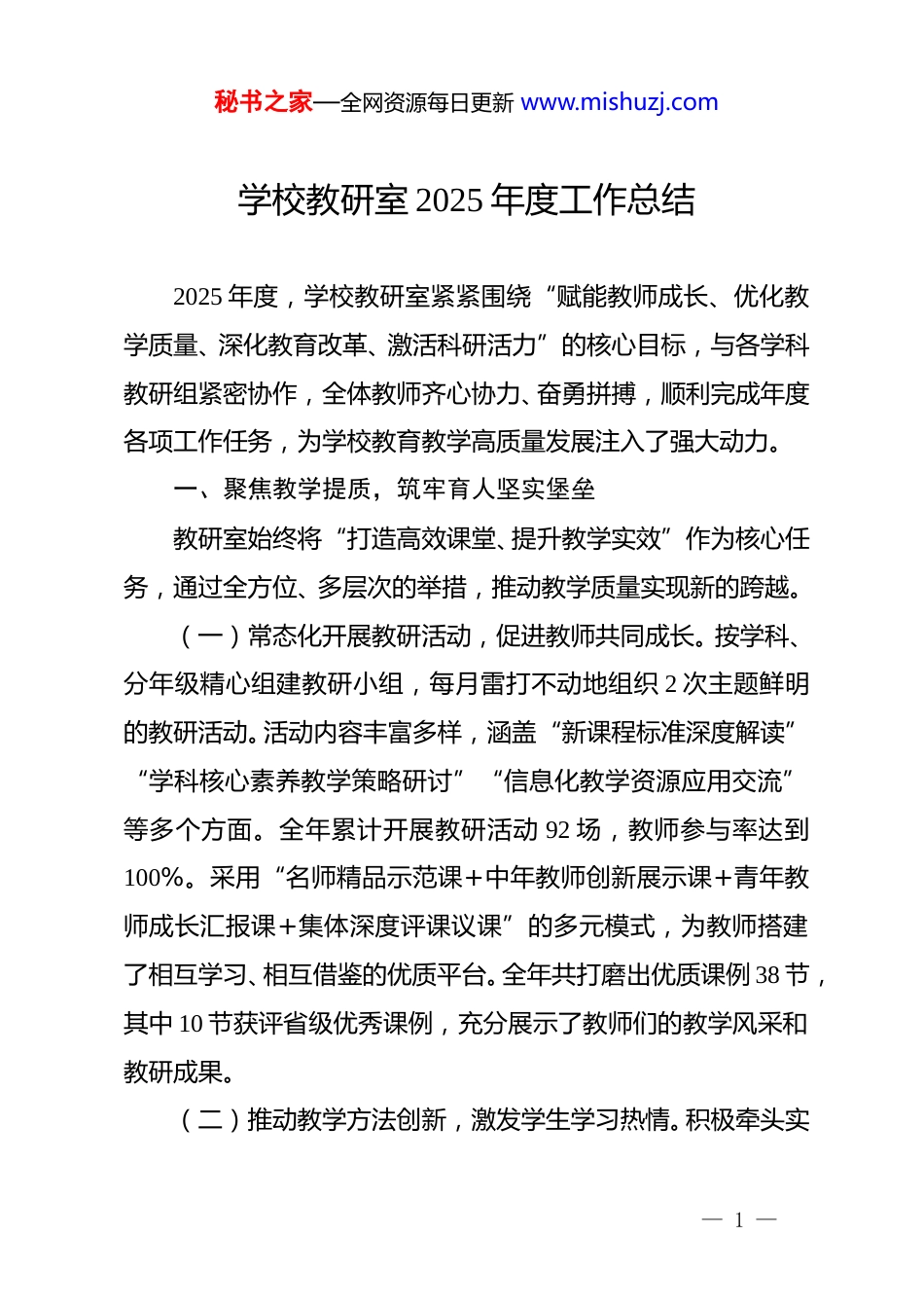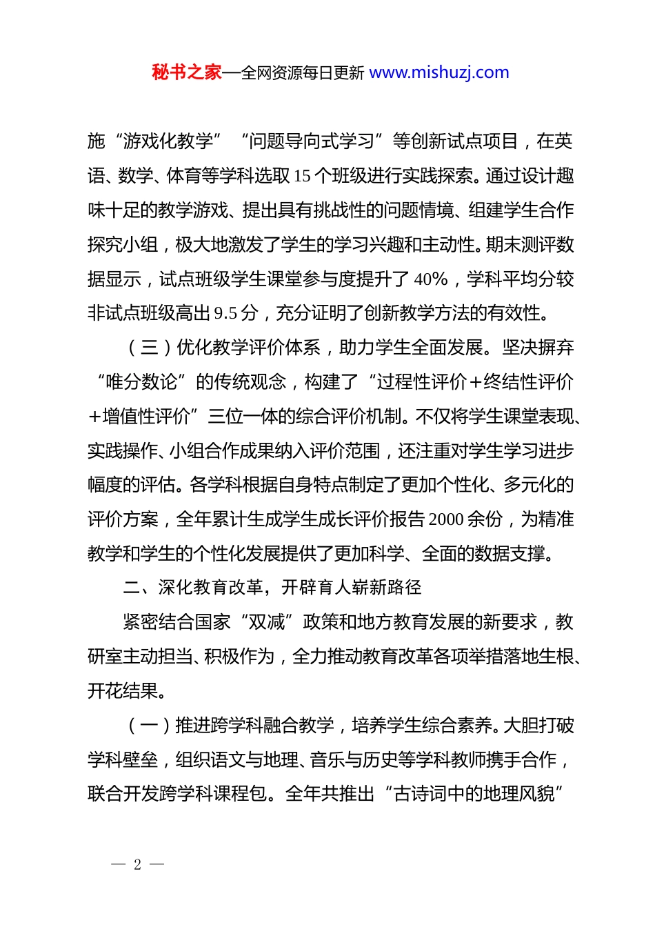 秘书之家—全网资源每日更新 www.mishuzj.com学校教研室 2025 年度工作总结2025 年度,学校教研室紧紧围绕“赋能教师成长、优化教学质量、深化教育改革、激活科研活力”的核心目标,与各学科教研组紧密协作,全体教师齐心协力、奋勇拼搏,顺利完成年度各项工作任务,为学校教育教学高质量发展注入了强大动力。一、聚焦教学提质,筑牢育人坚实堡垒教研室始终将“打造高效课堂、提升教学实效”作为核心任务,通过全方位、多层次的举措,推动教学质量实现新的跨越。(一)常态化开展教研活动,促进教师共同成长。按学科、分年级精心组建教研小组,每月雷打不动地组织 2 次主题鲜明的教研活动。活动内容丰富多样,涵盖“新课程标准深度解读”“学科核心素养教学策略研讨”“信息化教学资源应用交流”等多个方面。全年累计开展教研活动 92 场,教师参与率达到100%。采用“名师精品示范课+中年教师创新展示课+青年教师成长汇报课+集体深度评课议课”的多元模式,为教师搭建了相互学习、相互借鉴的优质平台。全年共打磨出优质课例 38 节,其中 10 节获评省级优秀课例,充分展示了教师们的教学风采和教研成果。(二)推动教学方法创新,激发学生学习热情。积极牵头实— 1 —秘书之家—全网资源每日更新 www.mishuzj.com施“游戏化教学”“问题导向式学习”等创新试点项目,在英语、数学、体育等学科选取 15 个班级进行实践探索。通过设计趣味十足的教学游戏、提出具有挑战性的问题情境、组建学生合作探究小组,极大地激发了学生的学习兴趣和主动性。期末测评数据显示,试点班级学生课堂参与度提升了 40%,学科平均分较非试点班级高出 9.5 分,充分证明了创新教学方法的有效性。(三)优化教学评价体系,助力学生全面发展。坚决摒弃“唯分数论”的传统观念,构建了“过程性评价+终结性评价+增值性评价”三位一体的综合评价机制。不仅将学生课堂表现、实践操作、小组合作成果纳入评价范围,还注重对学生学习进步幅度的评估。各学科根据自身特点制定了更加个性化、多元化的评价方案,全年累计生成学生成长评价报告 2000 余份,为精准教学和学生的个性化发展提供了更加科学、全面的数据支撑。二、深化教育改革,开辟育人崭新路径紧密结合国家“双减”政策和地方教育发展的新要求,教研室主动担当、积极作为,全力推动教育改革各项举措落地生根、开花结果。(一)推进跨学科融合教学,培养学生综合素养。大胆打破学科壁垒,组织语文与地理、音乐与历史等学科教师携手合作,联合开发跨学科课程包。全年共推出“古诗词中的地理风貌”— 2 —“音乐中的历史故事”等 20 个跨学科教学主题,开展融合课堂展示活动 8 场。通过跨学科教学,有效培养了学生的综合思维能力、跨界应用能力和创新精神,让学生能够从不同学科的视角去认识和解决问题。(二)强化实践育人环节,提升学生社会责任感。与德育处、教务处密切配合,搭建了“校内实践+校外研学+国际交流”的多元化实践平台。组织学生参与“校园文化节”“乡村支教实践”“国际文化交流研学”等活动 28 次,其中 15 名学生在省级科技创新大赛中获奖,5 个学生实践团队获评“省级优秀研学小组”,2 个学生交流项目在国际上获得好评。通过这些实践活动,切实提升了学生的实践能力、社会责任感和国际视野。(三)优化作业设计与管理,切实减轻学生负担。制定了更加完善的《学校作业设计指导意见》,进一步明确了作业设计的原则、要求和方法。要求各学科作业实行分层、分类、个性化设计,推行“基础题+拓展题+创新题”的作业模式,杜绝机械重复性作业。教研室每月对各年级作业布置情况进行严格抽查,全年累计优化作业案例 150 余个,学生日均作业时长控制在 80 分钟以内,家长满意度达到 95%,真正实现了作业减量提质的目标。三、强化师资建设,夯实教师成长根基针对不同阶段教师的发展需求,教研室精心构建了分层分秘书之家—全网资源每日更新 www.mishuzj.com类的培训体系,为教师的专业成长提供了有力支持。(一)新教师“启航”培训,助力快速适应岗位。为 22 名新进教师配备了经验丰富的“师徒结对”指导...
