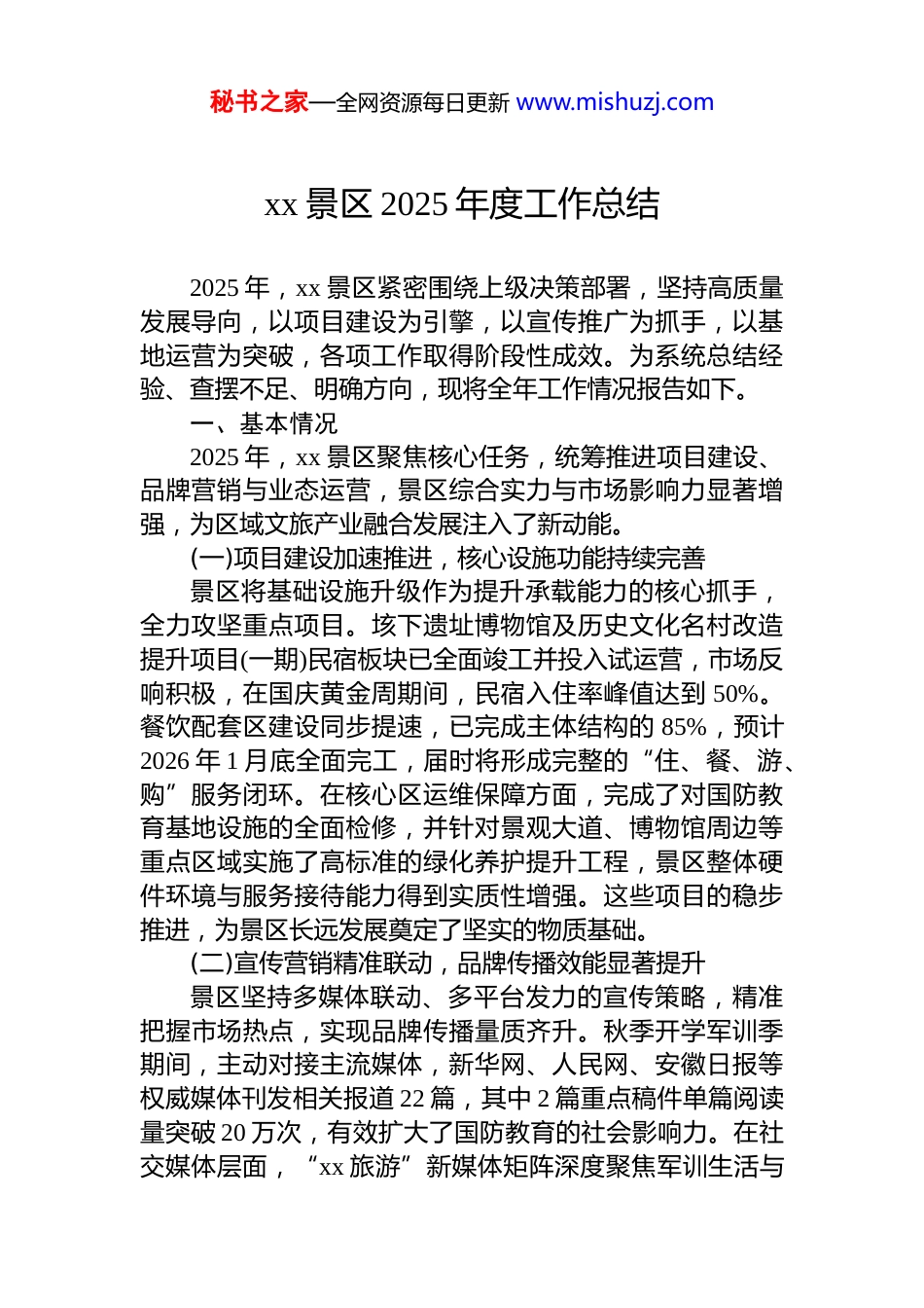 秘书之家—全网资源每日更新 www.mishuzj.comxx 景区 2025 年度工作总结2025 年,xx 景区紧密围绕上级决策部署,坚持高质量发展导向,以项目建设为引擎,以宣传推广为抓手,以基地运营为突破,各项工作取得阶段性成效。为系统总结经验、查摆不足、明确方向,现将全年工作情况报告如下。一、基本情况2025 年,xx 景区聚焦核心任务,统筹推进项目建设、品牌营销与业态运营,景区综合实力与市场影响力显著增强,为区域文旅产业融合发展注入了新动能。(一)项目建设加速推进,核心设施功能持续完善景区将基础设施升级作为提升承载能力的核心抓手,全力攻坚重点项目。垓下遗址博物馆及历史文化名村改造提升项目(一期)民宿板块已全面竣工并投入试运营,市场反响积极,在国庆黄金周期间,民宿入住率峰值达到 50%。餐饮配套区建设同步提速,已完成主体结构的 85%,预计2026 年 1 月底全面完工,届时将形成完整的“住、餐、游、购”服务闭环。在核心区运维保障方面,完成了对国防教育基地设施的全面检修,并针对景观大道、博物馆周边等重点区域实施了高标准的绿化养护提升工程,景区整体硬件环境与服务接待能力得到实质性增强。这些项目的稳步推进,为景区长远发展奠定了坚实的物质基础。(二)宣传营销精准联动,品牌传播效能显著提升景区坚持多媒体联动、多平台发力的宣传策略,精准把握市场热点,实现品牌传播量质齐升。秋季开学军训季期间,主动对接主流媒体,新华网、人民网、安徽日报等权威媒体刊发相关报道 22 篇,其中 2 篇重点稿件单篇阅读量突破 20 万次,有效扩大了国防教育的社会影响力。在社交媒体层面,“xx 旅游”新媒体矩阵深度聚焦军训生活与秘书之家—全网资源每日更新 www.mishuzj.com学员风采,发布原创内容 57 条,累计获得总浏览量 3240 万次、点赞量超 84 万次。其中,《开学这样给教官露一手》单条视频浏览量高达 xx 万次,成为现象级传播案例,极大地提升了景区的年轻客群关注度与网络热度。国庆期间,成功策划并举办安徽 xx 菊花文旅季,推出实景演出及民俗表演累计 77 场,并联合县融媒体中心制作发布 18 条精品短视频,总播放量达 32.74 万次,多维度、立体化展现了景区的独特魅力。假期七日,景区累计吸引游客 8.88 万人次,品牌知名度和美誉度实现双突破。(三)研学基地高效运营,培训业态活力持续增强依托垓下国防教育研学基地的独特资源优势,景区积极拓展专题培训与团建市场,运营成效显著。十月,高效承接了县委*校、县医保局、xx 区*校等多家单位的专题培训任务,同步完成了 xx 强军战歌团建拓展、青少年科普研学、民兵训练及工会活动等系列服务。据统计,当月累计接待参训、研学及各类活动人员约 600 人次。基地运营模式日趋成熟,通过持续优化课程设置、提升后勤保障水平与服务质量,参训单位满意度调查高达 98%,初步形成了以国防教育为鲜明特色,集培训研学与团建拓展于一体的综合性服务实体,为景区开辟了稳定的增收渠道。从更宏观的运营数据看,景区自 2023 年 5 月运营以来,已累计接待游客近 3 万人次,实现收入约 xx 万元,显示出强劲的发展势头。截至 2024 年底,景区累计游客接待量已突破 120 万人次,综合旅游收入超 x 亿元,为 2025 年的工作创造了良好开局。二、存在问题在总结成绩的同时,必须清醒地认识到,景区在快速发展过程中仍面临一些深层次的矛盾和问题,亟待在后续工作中加以解决。(一)基础设施配套仍存短板,综合服务能力有待加强尽管项目建设取得了显著进展,但与日益增长的游客秘书之家—全网资源每日更新 www.mishuzj.com量和多样化的需求相比,基础设施配套仍显不足。首先,景区内外部交通联系尚不够顺畅,内部道路体系有待完善高峰期易出现拥堵现象,影响游客体验。其次,缺乏大型优质酒店以满足黄金周、节假日等高峰期的住宿需求,现有民宿体量有限,难以充分承接大规模客流。再者,游客对信息查询、智能导览、停车场管理、公共卫生间、特色餐饮和购物等方面的需求日益增长,而景区在人流热度调度、信息精准推送、设施数据化管理等方面仍面临挑战,存在游客与...