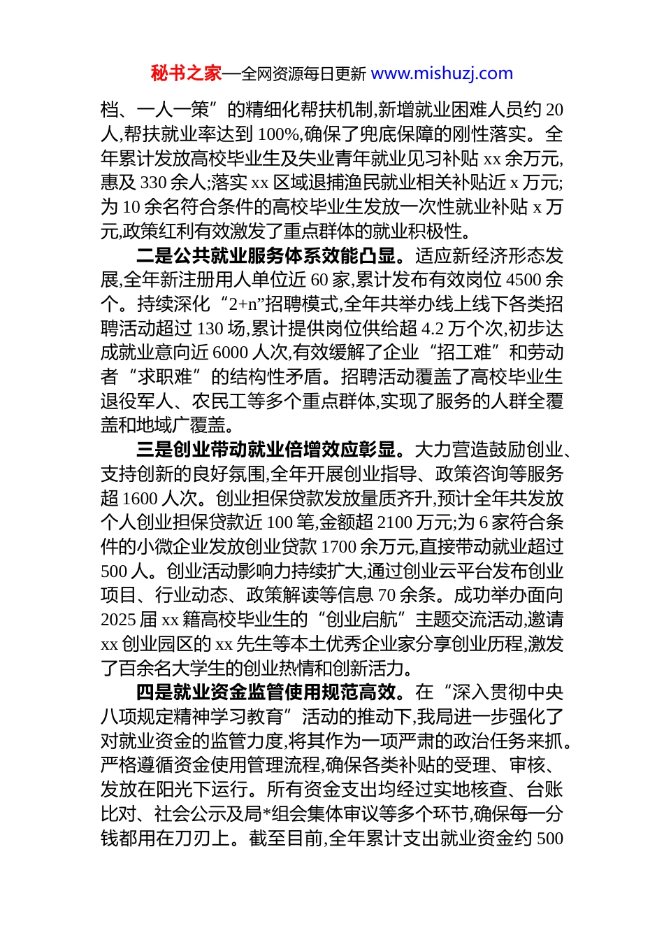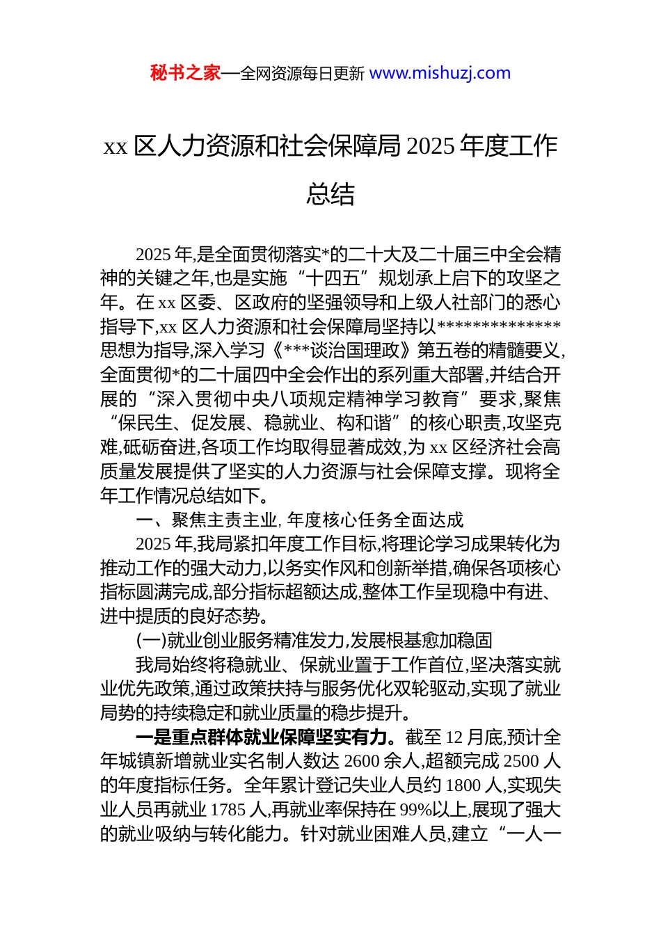 秘书之家—全网资源每日更新 www.mishuzj.comxx 区人力资源和社会保障局 2025 年度工作总结2025 年,是全面贯彻落实*的二十大及二十届三中全会精神的关键之年,也是实施“十四五”规划承上启下的攻坚之年。在 xx 区委、区政府的坚强领导和上级人社部门的悉心指导下,xx 区人力资源和社会保障局坚持以**************思想为指导,深入学习《***谈治国理政》第五卷的精髓要义,全面贯彻*的二十届四中全会作出的系列重大部署,并结合开展的“深入贯彻中央八项规定精神学习教育”要求,聚焦“保民生、促发展、稳就业、构和谐”的核心职责,攻坚克难,砥砺奋进,各项工作均取得显著成效,为 xx 区经济社会高质量发展提供了坚实的人力资源与社会保障支撑。现将全年工作情况总结如下。一、聚焦主责主业,年度核心任务全面达成2025 年,我局紧扣年度工作目标,将理论学习成果转化为推动工作的强大动力,以务实作风和创新举措,确保各项核心指标圆满完成,部分指标超额达成,整体工作呈现稳中有进、进中提质的良好态势。(一)就业创业服务精准发力,发展根基愈加稳固我局始终将稳就业、保就业置于工作首位,坚决落实就业优先政策,通过政策扶持与服务优化双轮驱动,实现了就业局势的持续稳定和就业质量的稳步提升。一是重点群体就业保障坚实有力。截至 12 月底,预计全年城镇新增就业实名制人数达 2600 余人,超额完成 2500 人的年度指标任务。全年累计登记失业人员约 1800 人,实现失业人员再就业 1785 人,再就业率保持在 99%以上,展现了强大的就业吸纳与转化能力。针对就业困难人员,建立“一人一秘书之家—全网资源每日更新 www.mishuzj.com档、一人一策”的精细化帮扶机制,新增就业困难人员约 20人,帮扶就业率达到 100%,确保了兜底保障的刚性落实。全年累计发放高校毕业生及失业青年就业见习补贴 xx 余万元,惠及 330 余人;落实 xx 区域退捕渔民就业相关补贴近 x 万元;为 10 余名符合条件的高校毕业生发放一次性就业补贴 x 万元,政策红利有效激发了重点群体的就业积极性。二是公共就业服务体系效能凸显。适应新经济形态发展,全年新注册用人单位近 60 家,累计发布有效岗位 4500 余个。持续深化“2+n”招聘模式,全年共举办线上线下各类招聘活动超过 130 场,累计提供岗位供给超 4.2 万个次,初步达成就业意向近 6000 人次,有效缓解了企业“招工难”和劳动者“求职难”的结构性矛盾。招聘活动覆盖了高校毕业生退役军人、农民工等多个重点群体,实现了服务的人群全覆盖和地域广覆盖。三是创业带动就业倍增效应彰显。大力营造鼓励创业、支持创新的良好氛围,全年开展创业指导、政策咨询等服务超 1600 人次。创业担保贷款发放量质齐升,预计全年共发放个人创业担保贷款近 100 笔,金额超 2100 万元;为 6 家符合条件的小微企业发放创业贷款 1700 余万元,直接带动就业超过500 人。创业活动影响力持续扩大,通过创业云平台发布创业项目、行业动态、政策解读等信息 70 余条。成功举办面向2025 届 xx 籍高校毕业生的“创业启航”主题交流活动,邀请xx 创业园区的 xx 先生等本土优秀企业家分享创业历程,激发了百余名大学生的创业热情和创新活力。四是就业资金监管使用规范高效。在“深入贯彻中央八项规定精神学习教育”活动的推动下,我局进一步强化了对就业资金的监管力度,将其作为一项严肃的政治任务来抓。严格遵循资金使用管理流程,确保各类补贴的受理、审核、发放在阳光下运行。所有资金支出均经过实地核查、台账比对、社会公示及局*组会集体审议等多个环节,确保每一分钱都用在刀刃上。截至目前,全年累计支出就业资金约 500秘书之家—全网资源每日更新 www.mishuzj.com万元,资金使用规范、安全、高效,未发生任何违规违纪事件。(二)社会保障体系织密扎牢,民生福祉持续增进以《***谈治国理政》第五卷中关于“在发展中保障和改善民生”的重要论述为根本遵循,我局致力于构建覆盖全民、统筹城乡、公平统一、可持续的多层次社会保障体系,不断增强人民群众的获得感、幸福感和安全感。一是全民参保计划纵深推进。围绕“应保尽保”目标,持续加大社会保险政策宣传力度,通过...