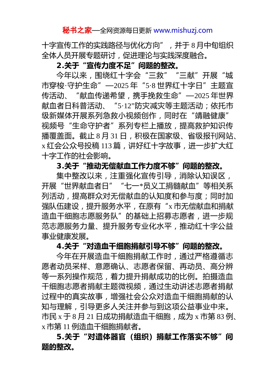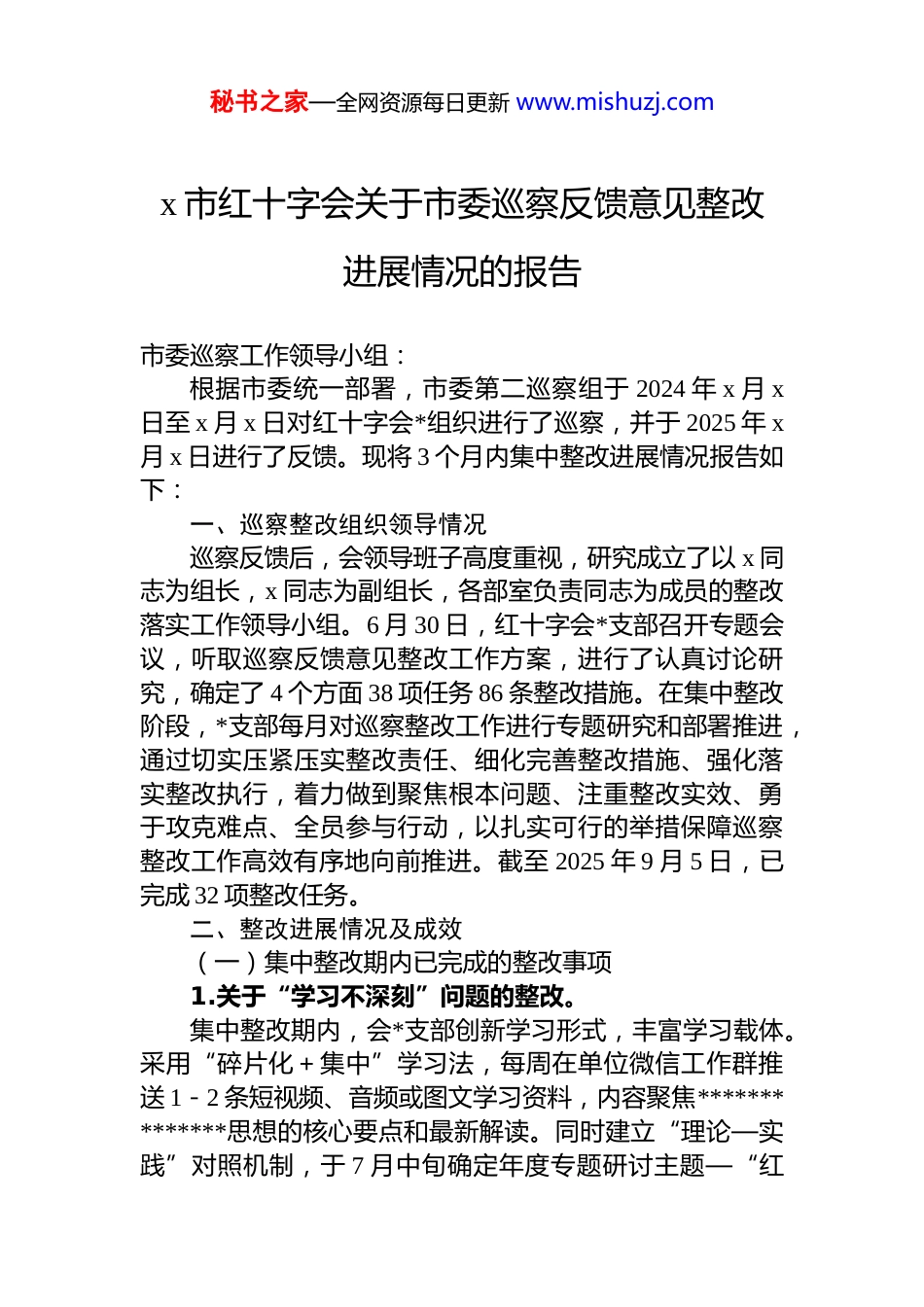秘书之家—全网资源每日更新 www.mishuzj.comx 市红十字会关于市委巡察反馈意见整改进展情况的报告市委巡察工作领导小组:根据市委统一部署,市委第二巡察组于 2024 年 x 月 x日至 x 月 x 日对红十字会*组织进行了巡察,并于 2025 年 x月 x 日进行了反馈。现将 3 个月内集中整改进展情况报告如下:一、巡察整改组织领导情况巡察反馈后,会领导班子高度重视,研究成立了以 x 同志为组长,x 同志为副组长,各部室负责同志为成员的整改落实工作领导小组。6 月 30 日,红十字会*支部召开专题会议,听取巡察反馈意见整改工作方案,进行了认真讨论研究,确定了 4 个方面 38 项任务 86 条整改措施。在集中整改阶段,*支部每月对巡察整改工作进行专题研究和部署推进,通过切实压紧压实整改责任、细化完善整改措施、强化落实整改执行,着力做到聚焦根本问题、注重整改实效、勇于攻克难点、全员参与行动,以扎实可行的举措保障巡察整改工作高效有序地向前推进。截至 2025 年 9 月 5 日,已完成 32 项整改任务。二、整改进展情况及成效(一)集中整改期内已完成的整改事项1.关于“学习不深刻”问题的整改。集中整改期内,会*支部创新学习形式,丰富学习载体。采用“碎片化+集中”学习法,每周在单位微信工作群推送 1-2 条短视频、音频或图文学习资料,内容聚焦**************思想的核心要点和最新解读。同时建立“理论—实践”对照机制,于 7 月中旬确定年度专题研讨主题—“红秘书之家—全网资源每日更新 www.mishuzj.com十字宣传工作的实践路径与优化方向”,并于 8 月中旬组织全体人员开展专题研讨,促进理论与实践深度融合。2.关于“宣传力度不足”问题的整改。今年以来,围绕红十字会“三救”“三献”开展“城市穿梭·守护生命”—2025 年“5·8 世界红十字日”主题宣传活动、“献血传递希望,携手挽救生命”—2025 年世界献血者日科普活动、“5·12”防灾减灾等主题活动;依托市级新媒体开展系列急救小视频创作,同时在“靖融健康”视频号“生命守护者”系列专栏上播放,提高救护知识传播覆盖面。截止 8 月 31 日,积极在国家级、省级报刊网站、x 红会公众号投稿 113 篇,讲好红十字故事,进一步扩大红十字工作的社会影响。3.关于“推动无偿献血工作力度不够”问题的整改。集中整改以来,注重强化宣传引导,消除认知误区,开展“世界献血者日”“七一*员义工捐髓献血”等相关系列活动,提高群众对无偿献血的认知度和参与度;同时加强队伍建设,提升服务水平,在原有“x 市无偿献血和捐献造血干细胞志愿服务队”的基础上招募志愿者,进一步规范志愿服务力量、提升服务专业化水平,推动红十字公益事业健康发展。4.关于“对造血干细胞捐献引导不够”问题的整改。今年在开展造血干细胞捐献工作时,通过严格遵循志愿者动员采样、意愿确认、志愿者保留、再动员、高分辨等一系列操作规范,着力提升捐献成功的比例。拍摄造血干细胞志愿者捐献主题微视频,通过生动讲述志愿者捐献过程中的真实故事,增强社会公众对造血干细胞捐献的认知与理解,引导更多人关注并参与到这项公益事业中来。市民 x 于 8 月 21 日成功捐献造血干细胞,成为 x 市第 83 例、x 市第 11 例造血干细胞捐献者。5.关于“对遗体器官(组织)捐献工作落实不够”问题的整改。秘书之家—全网资源每日更新 www.mishuzj.com3 月底联合 x 市 x 办事处举办“百城联动·善意同缅”百城联动线下缅怀活动,以行动诠释“生命至上”的理念,共同致敬遗体及人体器官捐献者,传递生命接力的温暖。根据 x 市民政局、x 市财政局《关于进一步完善市区惠民殡葬政策的通知》文件精神,于 7 月中旬出台《关于给予遗体(角膜)捐献志愿者一次性奖补的通知(试行)》,为遗体器官捐献工作的开展提供有力保障。6.关于“应急救援方面机制未健全”问题的整改。进一步完善《x 市红十字会自然灾害应急预案》,明确灾害等级划分标准,细化应急响应启动条件,对可能出现的灾情进行预评估,在资金保障、物资保障、通讯与交通保障、人员保障等方面提前做好应对措施。7 ...