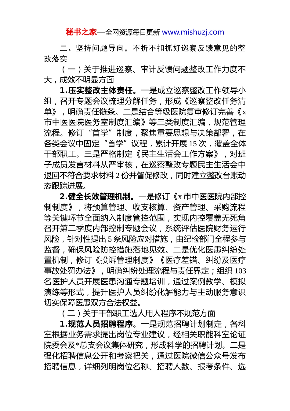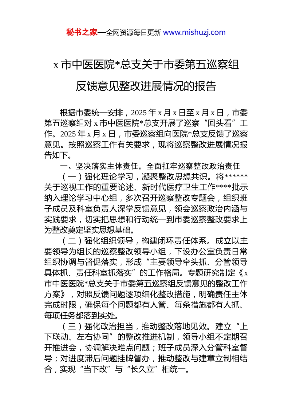 秘书之家—全网资源每日更新 www.mishuzj.comx 市中医医院*总支关于市委第五巡察组反馈意见整改进展情况的报告根据市委统一安排,2025 年 x 月 x 日至 x 月 x 日,市委第五巡察组对 x 市中医医院*总支开展了巡察“回头看”工作。2025 年 x 月 x 日,市委巡察组向医院*总支反馈了巡察意见。按照巡察工作有关要求,现将巡察整改进展情况报告如下。一、坚决落实主体责任,全面扛牢巡察整改政治责任(一)强化理论学习,凝聚整改思想共识。将******关于巡视工作的重要论述、新时代医疗卫生工作****批示纳入理论学习中心组,多次召开巡察整改专题会,组织班子成员及科室负责人深学反馈意见,领会巡察政治内涵与实践要求,切实把思想和行动统一到市委巡察整改要求上为整改奠定坚实思想基础。(二)强化组织领导,构建闭环责任体系。成立以主要领导为组长的巡察整改领导小组,下设办公室负责日常组织协调与督促落实,形成“主要领导牵头抓、分管领导具体抓、责任科室抓落实”的工作格局。专题研究制定《x市中医医院*总支关于市委第五巡察组反馈意见的整改工作方案》,对照反馈问题逐项细化整改措施,明确责任主体完成时限,确保每个问题都有人管、每条措施都有人抓、每项任务都落到实处。(三)强化政治担当,推动整改落地见效。建立“上下联动、左右协同”的整改推进机制,领导小组不定期召开推进会,协调解决难点问题;班子成员深入分管科室督导;对进度滞后问题挂牌督办,推动整改与建章立制相结合,实现“当下改”与“长久立”相统一。秘书之家—全网资源每日更新 www.mishuzj.com二、坚持问题导向,不折不扣抓好巡察反馈意见的整改落实(一)关于推进巡察、审计反馈问题整改工作力度不大,成效不明显方面1.压实整改主体责任。一是成立巡察整改工作领导小组,召开专题会议梳理分解任务,形成《巡察整改任务清单》,明确责任链条。二是结合等级医院复审修订完善《x市中医医院医务室制度汇编》等三类制度汇编,规范管理流程。修订“首学”制度,聚焦重要思想与决策部署,在各类会议中固定“首学”议程,累计开展 15 次,覆盖全体干部职工。三是严格制定《民主生活会工作方案》,对班子成员发言材料从严审核,在巡察整改专题民主生活会中退回不符合要求材料 2 份并督促修改,同时建立整改台账动态跟踪进展。2.健全长效管理机制。一是修订《x 市中医医院内部控制制度》,将预算管理、收支核算、资产管理、采购流程等关键环节全面纳入制度管控范围,实现内控覆盖无死角召开第二季度内部控制专题会议,系统评估医院财务运行风险,针对性提出 5 条风险应对措施,由纪检部门全程参与监督,确保风险防控措施落地见效。二是优化医患纠纷处置机制,修订《投诉管理制度》《医疗差错、纠纷及医疗事故处罚办法》,明确纠纷处理流程与责任界定;组织 103名医护人员开展医患沟通专题培训,通过案例教学、模拟演练等形式,提升医护人员纠纷化解能力与主动服务意识切实保障医患双方合法权益。(二)关于干部职工选人用人程序不规范方面1.规范人员招聘程序。一是规范招聘计划制定,各科室根据业务需求提出岗位专业建议,经相关职能科室论证院委会及*总支会议集体研究,形成科学的招聘计划。二是强化招聘信息公开和考察把关,通过医院微信公众号发布招聘信息,详细列明岗位名称、招聘人数、报考条件、选秘书之家—全网资源每日更新 www.mishuzj.com拔流程等内容,主动接受社会监督;针对 2025 年上半年事业单位公开招聘的 4 名拟录用考察人员,采取征询原工作单位评价、核查户籍地社区及派出所意见、开展面对面访谈等方式开展全面考察,确保录用人员综合素质达标。2.严格干部选拔标准。一是扎实开展干部选拔任用工作业务培训工作,组织 11 名*总支成员、组织人事干事开展专题培训,学习干部选拔相关选拔任用相关条例提升业务能力。二是修订完成医院内部股级干部选拔任用管理办法明确民主推荐、考察考核、集体讨论、公示任职四大环节标准,将中层干部提拔纳入“三重一大”决策范畴,提交总支委会议集体研究。三是规范完成 4 名股级干部试用期考核工作,5 名新任股级干...