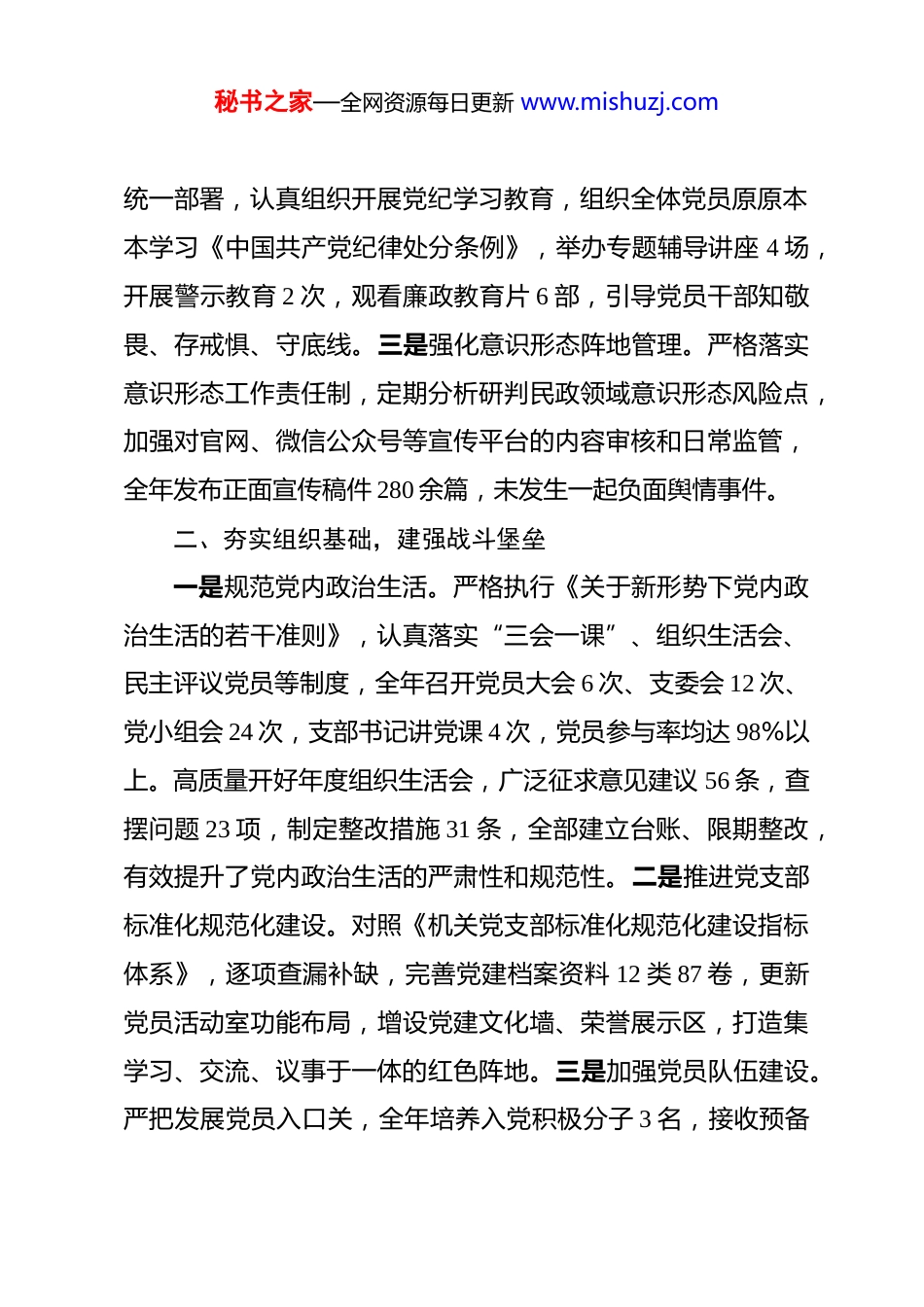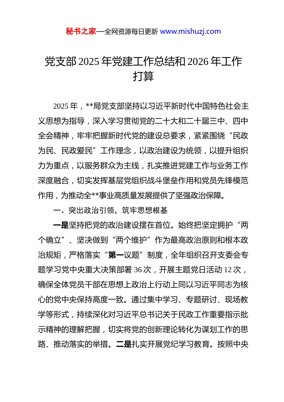 秘书之家—全网资源每日更新 www.mishuzj.com党支部 2025 年党建工作总结和 2026 年工作打算 2025 年,**局党支部坚持以习近平新时代中国特色社会主义思想为指导,深入学习贯彻党的二十大和二十届三中、四中全会精神,牢牢把握新时代党的建设总要求,紧紧围绕“民政为民、民政爱民”工作理念,以政治建设为统领,以提升组织力为重点,以服务群众为主线,扎实推进党建工作与业务工作深度融合,切实发挥基层党组织战斗堡垒作用和党员先锋模范作用,为推动全**事业高质量发展提供了坚强政治保障。一、突出政治引领,筑牢思想根基一是坚持把党的政治建设摆在首位。始终把坚定拥护“两个确立”、坚决做到“两个维护”作为最高政治原则和根本政治规矩,严格落实“第一议题”制度,全年组织召开支委会专题学习党中央重大决策部署 36 次,开展主题党日活动 12 次,确保全体党员干部在思想上政治上行动上同以习近平同志为核心的党中央保持高度一致。通过集中学习、专题研讨、现场教学等形式,持续深化对习近平总书记关于民政工作重要指示批示精神的理解把握,切实将党的创新理论转化为谋划工作的思路、推动落实的举措。二是扎实开展党纪学习教育。按照中央秘书之家—全网资源每日更新 www.mishuzj.com统一部署,认真组织开展党纪学习教育,组织全体党员原原本本学习《中国共产党纪律处分条例》,举办专题辅导讲座 4 场,开展警示教育 2 次,观看廉政教育片 6 部,引导党员干部知敬畏、存戒惧、守底线。三是强化意识形态阵地管理。严格落实意识形态工作责任制,定期分析研判民政领域意识形态风险点,加强对官网、微信公众号等宣传平台的内容审核和日常监管,全年发布正面宣传稿件 280 余篇,未发生一起负面舆情事件。二、夯实组织基础,建强战斗堡垒一是规范党内政治生活。严格执行《关于新形势下党内政治生活的若干准则》,认真落实“三会一课”、组织生活会、民主评议党员等制度,全年召开党员大会 6 次、支委会 12 次、党小组会 24 次,支部书记讲党课 4 次,党员参与率均达 98%以上。高质量开好年度组织生活会,广泛征求意见建议 56 条,查摆问题 23 项,制定整改措施 31 条,全部建立台账、限期整改,有效提升了党内政治生活的严肃性和规范性。二是推进党支部标准化规范化建设。对照《机关党支部标准化规范化建设指标体系》,逐项查漏补缺,完善党建档案资料 12 类 87 卷,更新党员活动室功能布局,增设党建文化墙、荣誉展示区,打造集学习、交流、议事于一体的红色阵地。三是加强党员队伍建设。严把发展党员入口关,全年培养入党积极分子 3 名,接收预备秘书之家—全网资源每日更新 www.mishuzj.com党员 2 名,转正党员 1 名,队伍结构进一步优化。注重在急难险重任务中考察锻炼干部,选派 8 名党员骨干参与乡村振兴驻村帮扶应急值守等工作,其中 2 人因表现突出被授予“优秀共产党员”称号。四是深化党建品牌创建。持续推进“暖心民政·服务先锋”党建品牌建设,设立党员示范岗 12 个,组建党员志愿服务队 3 支,围绕困难群众救助、养老服务提升、未成年人关爱等重点领域开展志愿服务活动 48 次,惠及群众 6000 余人次,品牌影响力和社会认可度不断提升。三、聚焦主责主业,推动融合发展一是助力基本民生保障提质增效。坚持党建引领社会救助体系建设,推动低保、特困、临时救助等政策精准落地。全年累计发放各类救助资金 5.7 亿元,惠及困难群众 12.6 万人次;建成低收入人口动态监测信息平台,归集数据 32 万条,实现早发现、早干预、早救助。在汛期灾害应对中,党支部迅速启动应急响应机制,组织党员突击队深入一线排查隐患、转移安置受灾群众 1300 余人,协调发放救灾物资价值 860 万元,有力保障了人民群众生命财产安全。二是促进养老服务能力持续提升。聚焦老年人急难愁盼问题,积极推进社区适老化改造工程,完成老旧小区加装电梯 37 部,新建社区老年食堂 15 个、日间照料中心 28 处。依托智慧养老平台,为高龄、独居老人提供助餐、秘书之家—全网资源每日更新 www.mishuzj.com助洁、助医等上门服...