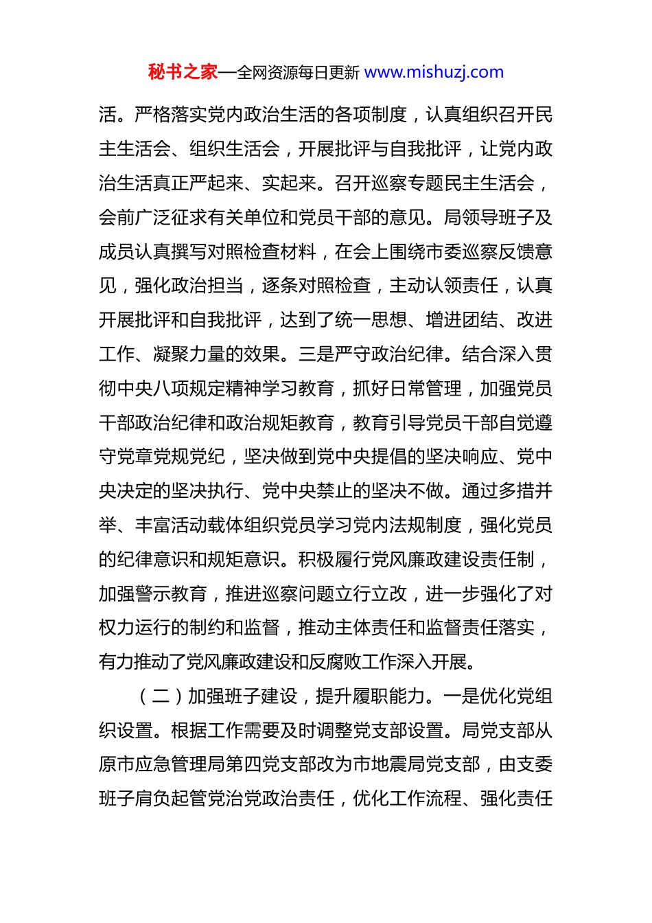 秘书之家—全网资源每日更新 www.mishuzj.com党支部 2025 年前三季度抓基层党建工作总结 今年以来,局党支部坚持以习近平新时代中国特色社会主义思想为指导,深入学习贯彻党的二十大及二十届三中、四中全会精神,坚持党建引领,深入开展“四强”党支部创建工作,充分发挥支部战斗堡垒作用和党员先锋模范作用,为推动各项工作高质量发展提供了坚强的组织保障。一、主要工作情况(一)突出政治引领,筑牢政治忠诚。一是强化政治引领。始终把学习贯彻习近平新时代中国特色社会主义思想作为首要政治任务,通过“三会一课”、主题党日、专题研讨等形式,引导党员干部深刻领悟“两个确立”的决定性意义,增强“四个意识”、坚定“四个自信”、做到“两个维护”。如在党的二十届三中全会召开后,迅速组织全体党员开展集中学习,确保党的创新理论成果及时传达到每一位党员心中,组织参加由市委党校李义文常务副校长主讲的党的二十届三中全会精神宣讲会,进一步深化对全会精神的理解和把握,引导全体党员紧密结合自身工作实际,努力把学习成果转化为工作能力,在实践中不断提高政策水平、业务能力和服务意识。二是严肃政治生秘书之家—全网资源每日更新 www.mishuzj.com活。严格落实党内政治生活的各项制度,认真组织召开民主生活会、组织生活会,开展批评与自我批评,让党内政治生活真正严起来、实起来。召开巡察专题民主生活会,会前广泛征求有关单位和党员干部的意见。局领导班子及成员认真撰写对照检查材料,在会上围绕市委巡察反馈意见,强化政治担当,逐条对照检查,主动认领责任,认真开展批评和自我批评,达到了统一思想、增进团结、改进工作、凝聚力量的效果。三是严守政治纪律。结合深入贯彻中央八项规定精神学习教育,抓好日常管理,加强党员干部政治纪律和政治规矩教育,教育引导党员干部自觉遵守党章党规党纪,坚决做到党中央提倡的坚决响应、党中央决定的坚决执行、党中央禁止的坚决不做。通过多措并举、丰富活动载体组织党员学习党内法规制度,强化党员的纪律意识和规矩意识。积极履行党风廉政建设责任制,加强警示教育,推进巡察问题立行立改,进一步强化了对权力运行的制约和监督,推动主体责任和监督责任落实,有力推动了党风廉政建设和反腐败工作深入开展。(二)加强班子建设,提升履职能力。一是优化党组织设置。根据工作需要及时调整党支部设置。局党支部从原市应急管理局第四党支部改为市地震局党支部,由支委班子肩负起管党治党政治责任,优化工作流程、强化责任秘书之家—全网资源每日更新 www.mishuzj.com落实,有效提升了党支部的向心力、战斗力和凝聚力,促进党建与业务工作的深度融合。二是选优配强支部班子。支部委员会由 3 人组成,局长严朝锦同志担任支部书记,郝继杰副局长任纪检、宣传委员,综合科科长余贵雪担任组织委员。党支部班子成员年龄、学历、专业结构合理,具有较强的互补。班子成员既有经验丰富的老党员,又有朝气蓬勃的年轻党员;既有精通业务工作的专业人才,又有擅长党建工作的骨干力量,能够适应新形势下党支部工作的需要。三是班子成员能力过硬。支部书记具有良好的政治素质和较强的组织协调能力,能够认真履行第一责任人职责,带领班子成员扎实推进党支部各项工作。本届支委会团结和谐,管理民主,分工明确,各司其职,密切配合,在党员教育管理、组织建设、党内活动开展、提高工作积极性等方面都取得了显著成效。四是发挥政治核心作用。重新组建党支部,由支委会 3 名委员共同负责局决策工作,在重大决策部署上把方向、管大局、保落实,解决了原由 2 名局班子成员开展决策造成落实民主集中制有差距的问题。支委会严格执行民主集中制原则,建立健全支委会工作制度,做好单位的发展规划、重要人事任免、重大项目安排等重大事项的决策,充分发挥政治核心作用。(三)强化党员教育,打造过硬队伍。一是加强学习秘书之家—全网资源每日更新 www.mishuzj.com培训。加强党员思想政治教育,通过开展专题党课、警示教育等活动,引导党员坚定理想信念,增强党性修养,严明纪律规矩。注重党员业务能力培养,根据党员岗位特点和工作需...