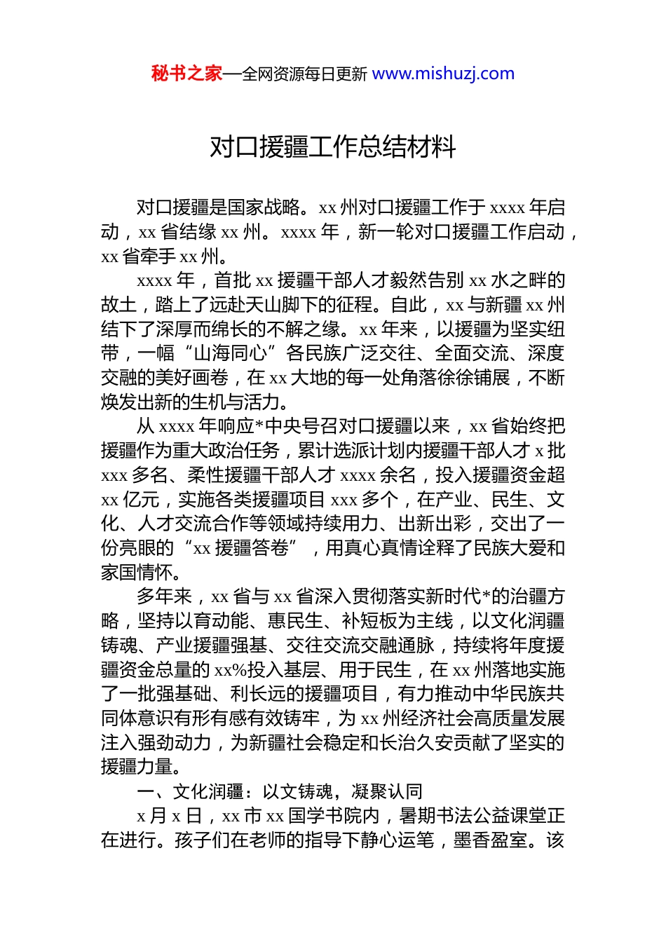 秘书之家—全网资源每日更新 www.mishuzj.com对口援疆工作总结材料对口援疆是国家战略。xx 州对口援疆工作于 xxxx 年启动,xx 省结缘 xx 州。xxxx 年,新一轮对口援疆工作启动,xx 省牵手 xx 州。xxxx 年,首批 xx 援疆干部人才毅然告别 xx 水之畔的故土,踏上了远赴天山脚下的征程。自此,xx 与新疆 xx 州结下了深厚而绵长的不解之缘。xx 年来,以援疆为坚实纽带,一幅“山海同心”各民族广泛交往、全面交流、深度交融的美好画卷,在 xx 大地的每一处角落徐徐铺展,不断焕发出新的生机与活力。从 xxxx 年响应*中央号召对口援疆以来,xx 省始终把援疆作为重大政治任务,累计选派计划内援疆干部人才 x 批xxx 多名、柔性援疆干部人才 xxxx 余名,投入援疆资金超xx 亿元,实施各类援疆项目 xxx 多个,在产业、民生、文化、人才交流合作等领域持续用力、出新出彩,交出了一份亮眼的“xx 援疆答卷”,用真心真情诠释了民族大爱和家国情怀。多年来,xx 省与 xx 省深入贯彻落实新时代*的治疆方略,坚持以育动能、惠民生、补短板为主线,以文化润疆铸魂、产业援疆强基、交往交流交融通脉,持续将年度援疆资金总量的 xx%投入基层、用于民生,在 xx 州落地实施了一批强基础、利长远的援疆项目,有力推动中华民族共同体意识有形有感有效铸牢,为 xx 州经济社会高质量发展注入强劲动力,为新疆社会稳定和长治久安贡献了坚实的援疆力量。一、文化润疆:以文铸魂,凝聚认同x 月 x 日,xx 市 xx 国学书院内,暑期书法公益课堂正在进行。孩子们在老师的指导下静心运笔,墨香盈室。该秘书之家—全网资源每日更新 www.mishuzj.com书院由 xx 援疆 xx 分指挥部于 xxxx 年打造,融合“百姓书屋”、x 昌情阅读文化长廊、智慧国学书法室、朗读空间与茶艺文化室于一体,已成为一处多功能文化阵地。自投用以来,累计开展读书分享、手工工艺、非遗展示、公益课堂等实践活动 xxx 余场,广受社会各界好评。“我们通过成人读书会、少儿沙龙、名家讲座等形式,促进文化碰撞与传播,让大众浸润于中华优秀传统文化,不断厚植文化自信,从而有效铸牢中华民族共同体意识。”书院管理人员 xx 如是说。在 xx 援疆资金支持下,xx 州非物质文化遗产展厅、xx州科技馆、xx 个“xx 援疆·百姓书屋”等一批 xx 州特色文化场馆相继建成并投入使用;《xx》等一批文艺精品,以影像和舞台为媒介,生动讲述着新时代新疆故事、xx 故事与援疆故事。xxxx 年 x 月 xx 日,xx 市文化馆内鼓声震天,国家级非遗代表性项目威风锣鼓培训班正式开班。xx 等 xx 韵悠长的节目轮番登场,让新疆群众近距离感受到 xx 文化的独特魅力。xx 援疆依托文化创作、文旅推介、艺术展演、人才培训、文物保护等多元路径,持续深化 xx 疆文化交流与互鉴,为受援地注入源源不断的精神动力。一批批书画作品、文学作品、广播电视节目及演出设备的捐赠,不仅加深了两地情谊,更增强了各族群众对中华文化的认同,让文化润疆之花在天山脚下绚烂绽放。最是文化润人心。xx 省与 xx 省充分发挥文化资源富集优势,创新方式、多措并举,以文化援疆助推文化润疆、育人润心、培根铸魂,为 xx 州高质量发展提供了有力的智力支持和精神支撑。二、民生援疆:枝叶关情,实惠于民x 月 xx 日,xx 援建的 xx 县 xx 互助幸福大院内暖意融融。屋外,各类蔬菜繁盛,硕果满枝;屋内,琴声悠扬,秘书之家—全网资源每日更新 www.mishuzj.com老人们围坐歌唱。xx 岁的 xx 笑着说:“吃住方便,还有老邻居做伴,日子越过越舒心!”x 月 xx 日中午时分,xx 市 xx 街道为民服务中心助餐点内,老人们围坐在一起,品尝着可口的饭菜,欢声笑语不断。这个 xxxx 年 x 月投入使用的助餐点,既解决老人就餐难题,还为行动不便者提供送餐服务,真正实现“老有所养”落地落实。橙白相间的教学楼美观大气,宽敞明亮的教室、现代化的实验室、设施完备的运动场一应俱全 x 月 x 日,xx 援建的 xx 中学迎来新学期。七年级三班学生 xx 难掩内心的激动:“感谢 xx 为我们建设的新...