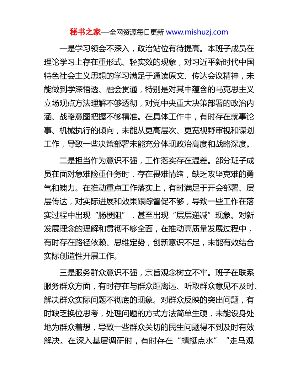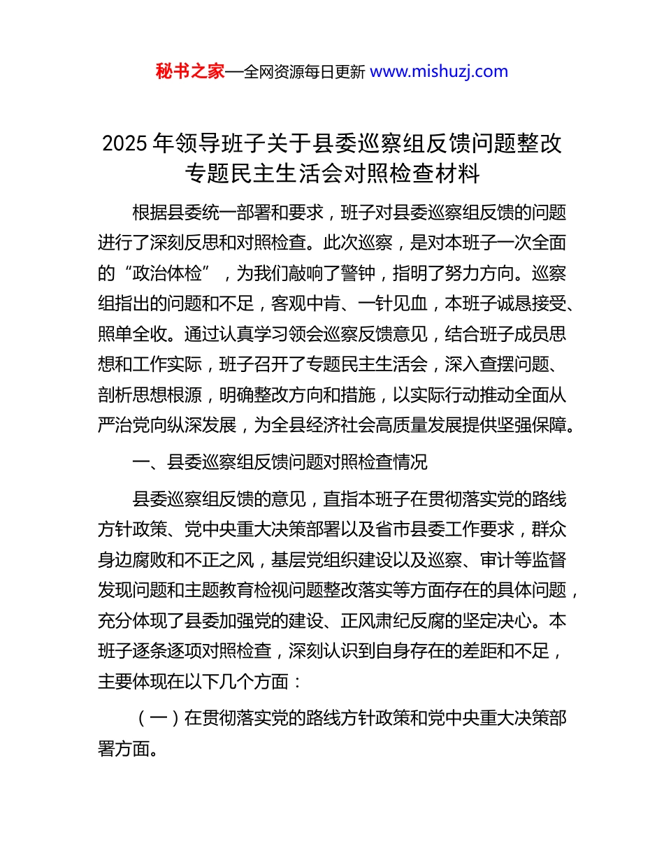 秘书之家—全网资源每日更新 www.mishuzj.com2025 年领导班子关于县委巡察组反馈问题整改专题民主生活会对照检查材料根据县委统一部署和要求,班子对县委巡察组反馈的问题进行了深刻反思和对照检查。此次巡察,是对本班子一次全面的“政治体检”,为我们敲响了警钟,指明了努力方向。巡察组指出的问题和不足,客观中肯、一针见血,本班子诚恳接受、照单全收。通过认真学习领会巡察反馈意见,结合班子成员思想和工作实际,班子召开了专题民主生活会,深入查摆问题、剖析思想根源,明确整改方向和措施,以实际行动推动全面从严治党向纵深发展,为全县经济社会高质量发展提供坚强保障。一、县委巡察组反馈问题对照检查情况县委巡察组反馈的意见,直指本班子在贯彻落实党的路线方针政策、党中央重大决策部署以及省市县委工作要求,群众身边腐败和不正之风,基层党组织建设以及巡察、审计等监督发现问题和主题教育检视问题整改落实等方面存在的具体问题,充分体现了县委加强党的建设、正风肃纪反腐的坚定决心。本班子逐条逐项对照检查,深刻认识到自身存在的差距和不足,主要体现在以下几个方面:(一)在贯彻落实党的路线方针政策和党中央重大决策部署方面。秘书之家—全网资源每日更新 www.mishuzj.com一是学习领会不深入,政治站位有待提高。本班子成员在理论学习上存在重形式、轻实效的现象,对习近平新时代中国特色社会主义思想的学习满足于通读原文、传达会议精神,未能做到学深悟透、融会贯通,特别是对其中蕴含的马克思主义立场观点方法理解不够透彻,对党中央重大决策部署的政治内涵、战略意图把握不够精准。在具体工作中,有时存在就事论事、机械执行的倾向,未能从更高层次、更宽视野审视和谋划工作,导致一些决策部署未能充分体现政治高度和战略深度。二是担当作为意识不强,工作落实存在温差。部分班子成员在面对急难险重任务时,存在畏难情绪,缺乏攻坚克难的勇气和魄力。在推动重点工作落实上,有时满足于开会部署、层层传达,对实际进展和效果跟踪督促不够,导致一些工作在落实过程中出现“肠梗阻”,甚至出现“层层递减”现象。对新发展理念的理解和贯彻不够全面,在推动高质量发展过程中,有时存在路径依赖、思维定势,创新意识不足,未能有效结合实际创造性开展工作。三是服务群众意识不强,宗旨观念树立不牢。班子在联系服务群众方面,有时存在与群众距离远、听取群众意见不及时、解决群众实际问题不彻底的现象。对群众反映的突出问题,有时缺乏换位思考,处理问题的方式方法简单生硬,未能设身处地为群众着想,导致一些群众关切的民生问题得不到及时有效解决。在深入基层调研时,有时存在“蜻蜓点水”“走马观秘书之家—全网资源每日更新 www.mishuzj.com花”的问题,未能真正深入到群众中去,了解真情实况,导致决策部署脱离实际、不接地气。(二)在群众身边腐败和不正之风方面。一是作风建设仍存短板,形式主义顽疾未除。在工作推进中,班子部分成员对形式主义、官僚主义的危害认识不足,有时存在以会议落实会议、以文件落实文件的现象,导致基层干部群众不堪重负。在检查考核、督导调研过程中,有时过度注重留痕、过度强调程序,未能真正聚焦实际效果,加重了基层负担。对于一些问题,习惯于“花架子”式整改,表面上轰轰烈烈,实际上未能触及实质,导致问题屡禁不止、反弹回潮。二是纪律规矩意识不强,自我要求有所放松。本班子部分成员在日常工作生活中,对党规党纪的学习不够系统,对廉洁自律的各项规定理解不深不透,存在纪律红线意识模糊的现象。有时在处理公私关系上不够严格,对一些小节问题不够重视,存在侥幸心理。对身边干部职工的教育管理失之于宽、失之于软,未能及时提醒、坚决纠正,导致一些不良风气滋生蔓延。在干部选拔任用、项目审批、资金使用等方面,有时存在程序不够规范、监督不够到位的问题。三是履行“一岗双责”不到位,主体责任压得不实。部分班子成员对分管领域和联系单位的党风廉政建设工作重视程度不够,未能将党风廉政建设与业务工作同部署、同落实、同检秘书之家—全网资源每日更新 www.mishuzj.com查、同考核。在干部日常...