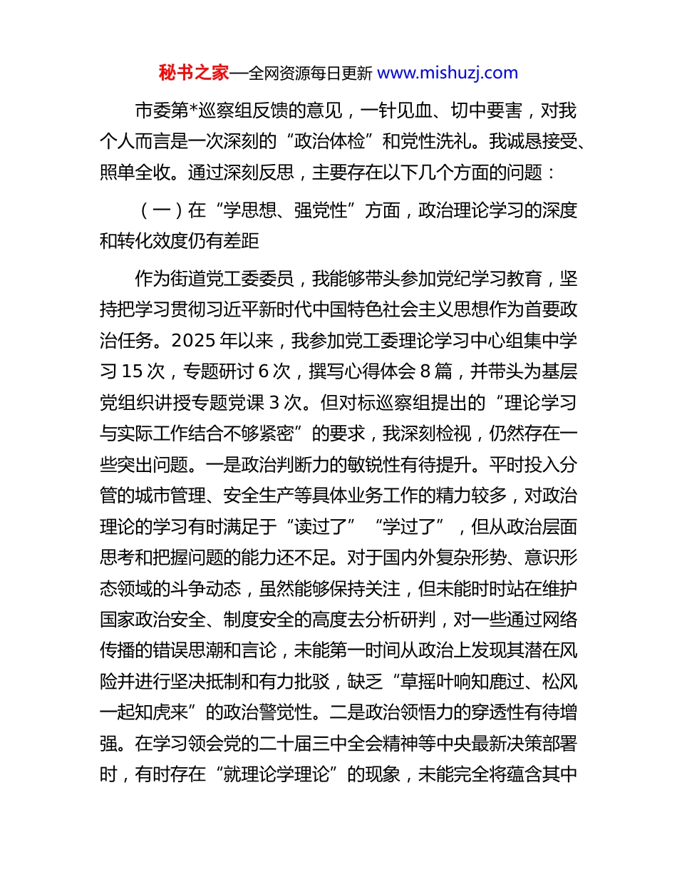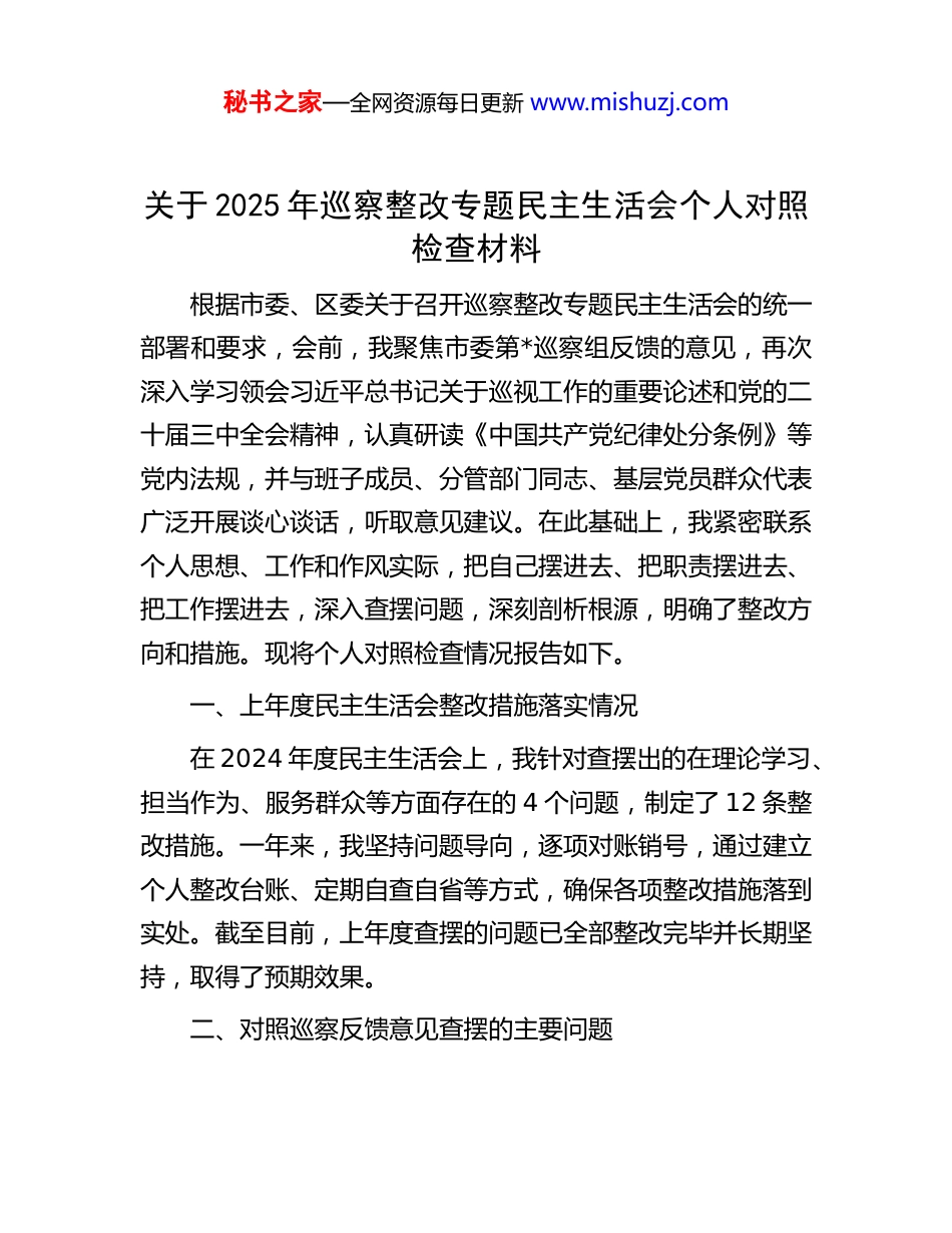 秘书之家—全网资源每日更新 www.mishuzj.com关于 2025 年巡察整改专题民主生活会个人对照检查材料根据市委、区委关于召开巡察整改专题民主生活会的统一部署和要求,会前,我聚焦市委第*巡察组反馈的意见,再次深入学习领会习近平总书记关于巡视工作的重要论述和党的二十届三中全会精神,认真研读《中国共产党纪律处分条例》等党内法规,并与班子成员、分管部门同志、基层党员群众代表广泛开展谈心谈话,听取意见建议。在此基础上,我紧密联系个人思想、工作和作风实际,把自己摆进去、把职责摆进去、把工作摆进去,深入查摆问题,深刻剖析根源,明确了整改方向和措施。现将个人对照检查情况报告如下。一、上年度民主生活会整改措施落实情况在 2024 年度民主生活会上,我针对查摆出的在理论学习、担当作为、服务群众等方面存在的 4 个问题,制定了 12 条整改措施。一年来,我坚持问题导向,逐项对账销号,通过建立个人整改台账、定期自查自省等方式,确保各项整改措施落到实处。截至目前,上年度查摆的问题已全部整改完毕并长期坚持,取得了预期效果。二、对照巡察反馈意见查摆的主要问题秘书之家—全网资源每日更新 www.mishuzj.com市委第*巡察组反馈的意见,一针见血、切中要害,对我个人而言是一次深刻的“政治体检”和党性洗礼。我诚恳接受、照单全收。通过深刻反思,主要存在以下几个方面的问题:(一)在“学思想、强党性”方面,政治理论学习的深度和转化效度仍有差距作为街道党工委委员,我能够带头参加党纪学习教育,坚持把学习贯彻习近平新时代中国特色社会主义思想作为首要政治任务。2025 年以来,我参加党工委理论学习中心组集中学习 15 次,专题研讨 6 次,撰写心得体会 8 篇,并带头为基层党组织讲授专题党课 3 次。但对标巡察组提出的“理论学习与实际工作结合不够紧密”的要求,我深刻检视,仍然存在一些突出问题。一是政治判断力的敏锐性有待提升。平时投入分管的城市管理、安全生产等具体业务工作的精力较多,对政治理论的学习有时满足于“读过了”“学过了”,但从政治层面思考和把握问题的能力还不足。对于国内外复杂形势、意识形态领域的斗争动态,虽然能够保持关注,但未能时时站在维护国家政治安全、制度安全的高度去分析研判,对一些通过网络传播的错误思潮和言论,未能第一时间从政治上发现其潜在风险并进行坚决抵制和有力批驳,缺乏“草摇叶响知鹿过、松风一起知虎来”的政治警觉性。二是政治领悟力的穿透性有待增强。在学习领会党的二十届三中全会精神等中央最新决策部署时,有时存在“就理论学理论”的现象,未能完全将蕴含其中秘书之家—全网资源每日更新 www.mishuzj.com的改革精神、发展理念与我们街道面临的旧城改造、产业升级、基层治理等实际挑战进行深度融合。比如,对于“发展新质生产力”这一重大论断,虽然在会上多次学习讨论,但在如何引导辖区内传统商贸企业转型升级、培育发展数字经济新业态上,思考谋划得不够深远,提出的思路举措创新性不足,导致分管领域的经济工作亮点不多,未能完全将党中央精神转化为推动*街道高质量发展的具体路径和有效办法。三是政治执行力的坚定性有待强化。在贯彻执行上级决策部署时,虽然能做到令行禁止、不打折扣,但在“创造性落实”上做得还不够。有时存在机械执行、路径依赖的问题,习惯于按照文件、会议要求部署工作,但在结合街道实际、破解执行过程中的堵点难点问题上,主动思考、积极创新的劲头不足。比如,在推进*河沿岸环境综合整治工作中,面对涉及多个产权单位、历史遗留问题复杂的现实情况,一度产生了畏难情绪,更多是向上级请示汇报,等待上级拿出解决方案,而不是主动跨前一步,积极协调各方力量寻求突破,导致该项工作进度滞后于市、区两级的总体要求。(二)在“重实践、建新功”方面,勇于担当的锐气和攻坚克难的韧劲有所减弱我始终牢记自己作为一名党员领导干部的责任使命,面对急难险重任务能够主动担当。但在巡察组指出的“干事创业精气神不足”问题面前,我反思自己确实存在安于现状、闯劲不秘书之家—全网资源每日更新 www.mishuzj.com足的倾向。一是攻坚克难...
