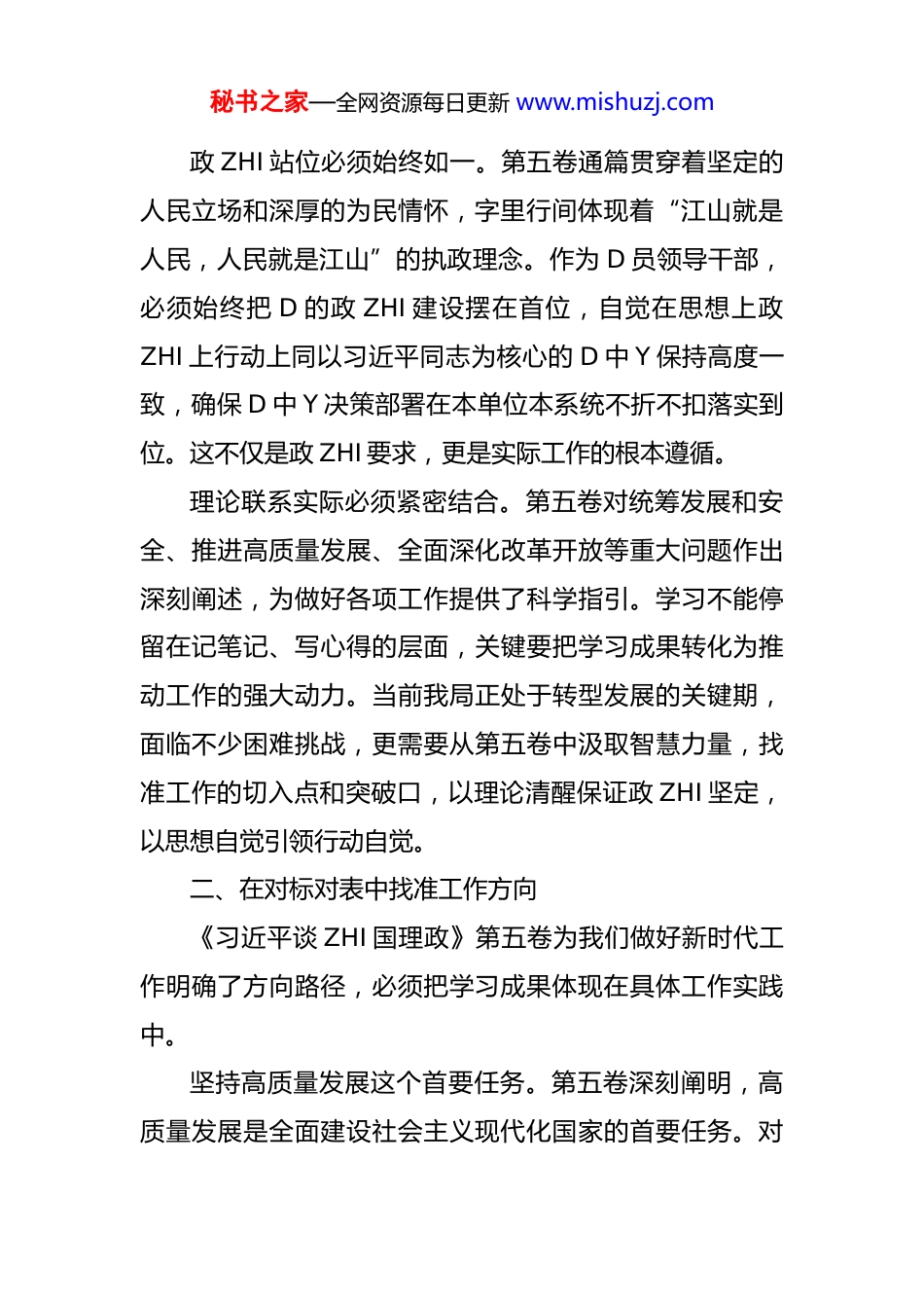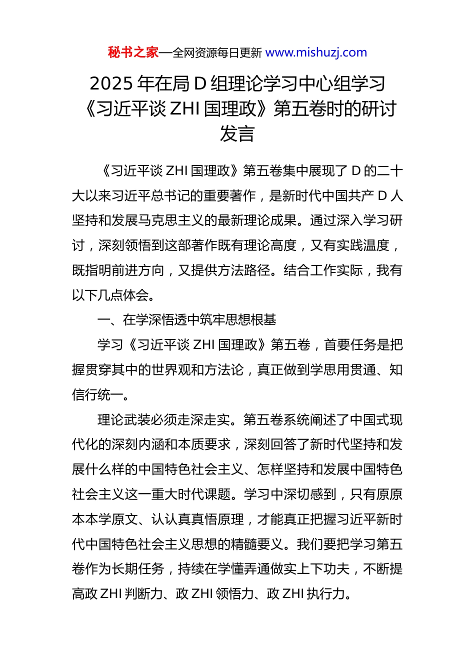 秘书之家—全网资源每日更新 www.mishuzj.com2025 年在局 D 组理论学习中心组学习《习近平谈 ZHI 国理政》第五卷时的研讨发言《习近平谈 ZHI 国理政》第五卷集中展现了 D 的二十大以来习近平总书记的重要著作,是新时代中国共产 D 人坚持和发展马克思主义的最新理论成果。通过深入学习研讨,深刻领悟到这部著作既有理论高度,又有实践温度,既指明前进方向,又提供方法路径。结合工作实际,我有以下几点体会。一、在学深悟透中筑牢思想根基学习《习近平谈 ZHI 国理政》第五卷,首要任务是把握贯穿其中的世界观和方法论,真正做到学思用贯通、知信行统一。理论武装必须走深走实。第五卷系统阐述了中国式现代化的深刻内涵和本质要求,深刻回答了新时代坚持和发展什么样的中国特色社会主义、怎样坚持和发展中国特色社会主义这一重大时代课题。学习中深切感到,只有原原本本学原文、认认真真悟原理,才能真正把握习近平新时代中国特色社会主义思想的精髓要义。我们要把学习第五卷作为长期任务,持续在学懂弄通做实上下功夫,不断提高政 ZHI 判断力、政 ZHI 领悟力、政 ZHI 执行力。秘书之家—全网资源每日更新 www.mishuzj.com政 ZHI 站位必须始终如一。第五卷通篇贯穿着坚定的人民立场和深厚的为民情怀,字里行间体现着“江山就是人民,人民就是江山”的执政理念。作为 D 员领导干部,必须始终把 D 的政 ZHI 建设摆在首位,自觉在思想上政ZHI 上行动上同以习近平同志为核心的 D 中 Y 保持高度一致,确保 D 中 Y 决策部署在本单位本系统不折不扣落实到位。这不仅是政 ZHI 要求,更是实际工作的根本遵循。理论联系实际必须紧密结合。第五卷对统筹发展和安全、推进高质量发展、全面深化改革开放等重大问题作出深刻阐述,为做好各项工作提供了科学指引。学习不能停留在记笔记、写心得的层面,关键要把学习成果转化为推动工作的强大动力。当前我局正处于转型发展的关键期,面临不少困难挑战,更需要从第五卷中汲取智慧力量,找准工作的切入点和突破口,以理论清醒保证政 ZHI 坚定,以思想自觉引领行动自觉。二、在对标对表中找准工作方向《习近平谈 ZHI 国理政》第五卷为我们做好新时代工作明确了方向路径,必须把学习成果体现在具体工作实践中。坚持高质量发展这个首要任务。第五卷深刻阐明,高质量发展是全面建设社会主义现代化国家的首要任务。对秘书之家—全网资源每日更新 www.mishuzj.com照这一要求反思工作,我们在推动发展过程中还存在质量效益不高、创新能力不强等短板。必须完整、准确、全面贯彻新发展理念,把高质量发展要求贯穿工作全过程各方面。一是强化创新驱动,加大科技投入力度,推动关键技术攻关取得突破,以创新为发展注入新动能。二是优化发展结构,推进传统业务转型升级,培育新的增长点,实现发展方式从规模扩张向质量提升转变。三是提升服务效能深化“放管服”改革,优化办事流程,让群众和企业办事更便捷更高效。增强防范化解风险的本领能力。第五卷强调要坚持底线思维,增强忧患意识,着力防范化解重大风险。当前外部环境复杂严峻,各类风险隐患交织叠加,我们必须时刻保持清醒头脑,提高见微知著的能力。一是健全风险防控机制,完善风险研判、评估、预警体系,做到早发现、早报告、早处置。二是加强重点领域监管,对涉及安全稳定的关键环节严格把关,决不能出现系统性风险。三是提升应急处置能力,完善应急预案,加强演练培训,确保一旦出现突发情况能够迅速反应、妥善应对。践行以人民为中心的发展思想。第五卷反复强调要坚持人民至上,把人民对美好生活的向往作为奋斗目标。检视工作发现,一些同志对群众诉求重视不够,服务意识有秘书之家—全网资源每日更新 www.mishuzj.com待增强。必须树牢群众观点,站稳人民立场,真正把群众的急难愁盼问题放在心上。一是畅通诉求渠道,完善群众意见建议收集反馈机制,确保群众声音能够及时传递上来二是解决突出问题,聚焦群众反映强烈的堵点难点,一件接着一件办,一年接着一年干,让群众看到实实在在的变化。三是改进工作作风,力戒形式主义官僚主义,多做雪中送炭的事...
