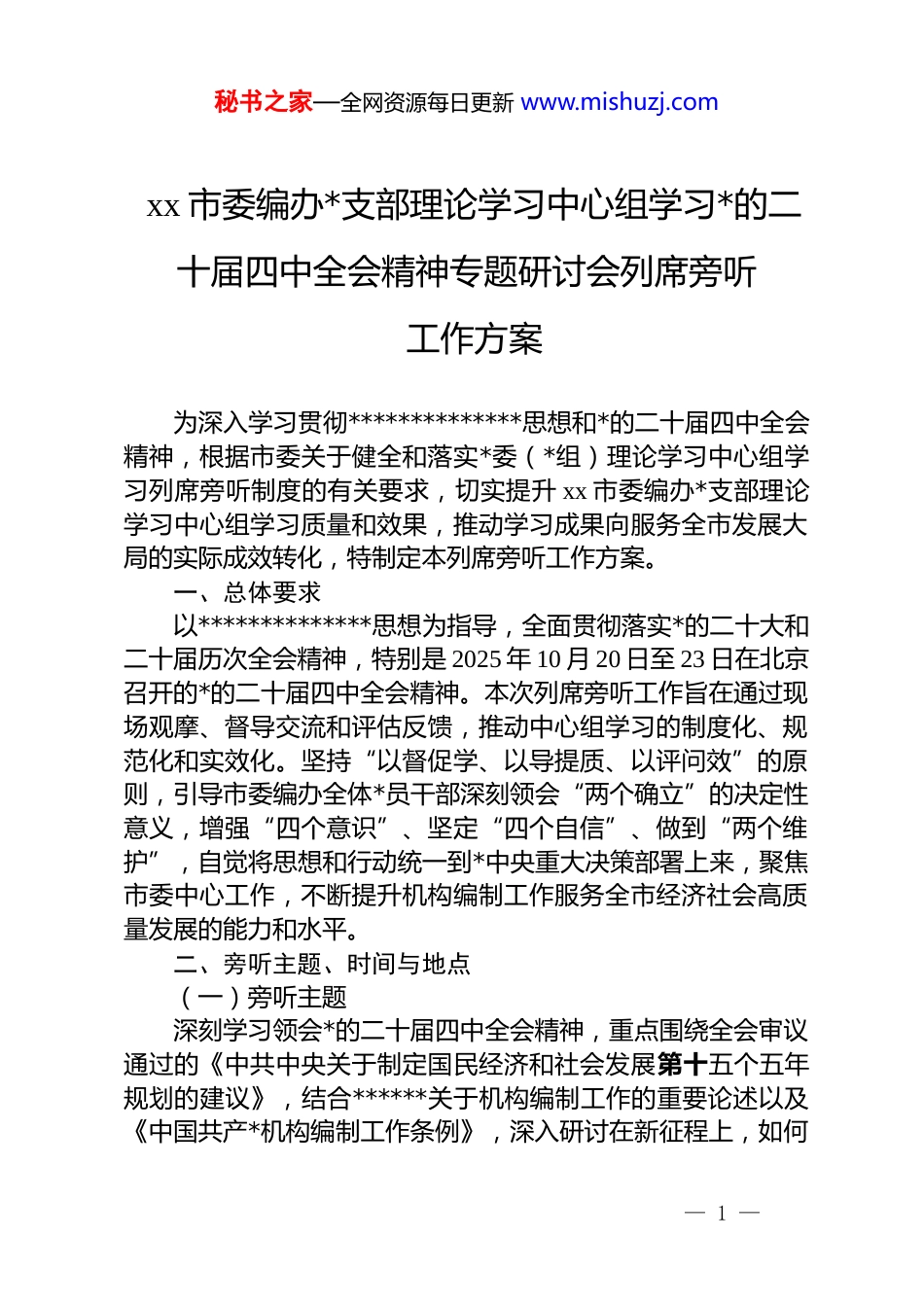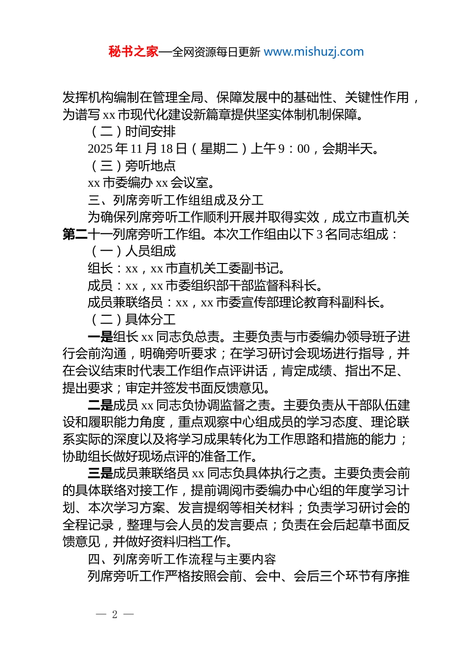 秘书之家—全网资源每日更新 www.mishuzj.comxx 市委编办*支部理论学习中心组学习*的二十届四中全会精神专题研讨会列席旁听工作方案为深入学习贯彻**************思想和*的二十届四中全会精神,根据市委关于健全和落实*委(*组)理论学习中心组学习列席旁听制度的有关要求,切实提升 xx 市委编办*支部理论学习中心组学习质量和效果,推动学习成果向服务全市发展大局的实际成效转化,特制定本列席旁听工作方案。一、总体要求以**************思想为指导,全面贯彻落实*的二十大和二十届历次全会精神,特别是 2025 年 10 月 20 日至 23 日在北京召开的*的二十届四中全会精神。本次列席旁听工作旨在通过现场观摩、督导交流和评估反馈,推动中心组学习的制度化、规范化和实效化。坚持“以督促学、以导提质、以评问效”的原则,引导市委编办全体*员干部深刻领会“两个确立”的决定性意义,增强“四个意识”、坚定“四个自信”、做到“两个维护”,自觉将思想和行动统一到*中央重大决策部署上来,聚焦市委中心工作,不断提升机构编制工作服务全市经济社会高质量发展的能力和水平。二、旁听主题、时间与地点(一)旁听主题深刻学习领会*的二十届四中全会精神,重点围绕全会审议通过的《中共中央关于制定国民经济和社会发展第十五个五年规划的建议》,结合******关于机构编制工作的重要论述以及《中国共产*机构编制工作条例》,深入研讨在新征程上,如何— 1 —秘书之家—全网资源每日更新 www.mishuzj.com发挥机构编制在管理全局、保障发展中的基础性、关键性作用,为谱写 xx 市现代化建设新篇章提供坚实体制机制保障。(二)时间安排2025 年 11 月 18 日(星期二)上午 9:00,会期半天。(三)旁听地点xx 市委编办 xx 会议室。三、列席旁听工作组组成及分工为确保列席旁听工作顺利开展并取得实效,成立市直机关第二十一列席旁听工作组。本次工作组由以下 3 名同志组成:(一)人员组成组长:xx,xx 市直机关工委副书记。成员:xx,xx 市委组织部干部监督科科长。成员兼联络员:xx,xx 市委宣传部理论教育科副科长。(二)具体分工一是组长 xx 同志负总责。主要负责与市委编办领导班子进行会前沟通,明确旁听要求;在学习研讨会现场进行指导,并在会议结束时代表工作组作点评讲话,肯定成绩、指出不足、提出要求;审定并签发书面反馈意见。二是成员 xx 同志负协调监督之责。主要负责从干部队伍建设和履职能力角度,重点观察中心组成员的学习态度、理论联系实际的深度以及将学习成果转化为工作思路和措施的能力;协助组长做好现场点评的准备工作。三是成员兼联络员 xx 同志负具体执行之责。主要负责会前的具体联络对接工作,提前调阅市委编办中心组的年度学习计划、本次学习方案、发言提纲等相关材料;负责学习研讨会的全程记录,整理与会人员的发言要点;负责在会后起草书面反馈意见,并做好资料归档工作。四、列席旁听工作流程与主要内容列席旁听工作严格按照会前、会中、会后三个环节有序推— 2 —秘书之家—全网资源每日更新 www.mishuzj.com进,确保全流程、全方位掌握学习情况。(一)会前精心准备,把准学习方向一是在工作启动前,列席旁听工作组全体成员将先行一步,深入学习*的二十届四中全会公报、《“十五五”规划建议》等核心文件,确保自身对学习内容有全面、准确的理解,为实施精准指导奠定理论基础。二是在会议召开前三天,由联络员与市委编办对接,获取本次中心组学习的具体方案,包括学习议程、主持人、主讲人、重点发言人名单以及中心组全体成员围绕主题撰写的个人发言提纲。三是工作组将对上述材料进行初步审阅,重点评估学习主题是否聚焦、内容安排是否充实、个人准备是否充分、理论思考与机构编制工作实际结合是否紧密,形成初步判断,为现场观察提供明确靶向。(二)会中全程观摩,做实学习督导列席旁听工作组将全程参加中心组学习研讨会,重点从以下五个方面进行观察、记录和评估:一是学习纪律。观察中心组成员是否全员按时出席,是否存在无故缺席、迟到、早退现象;学习过程中是否保持专注,有无随意走动、接打电话、浏...