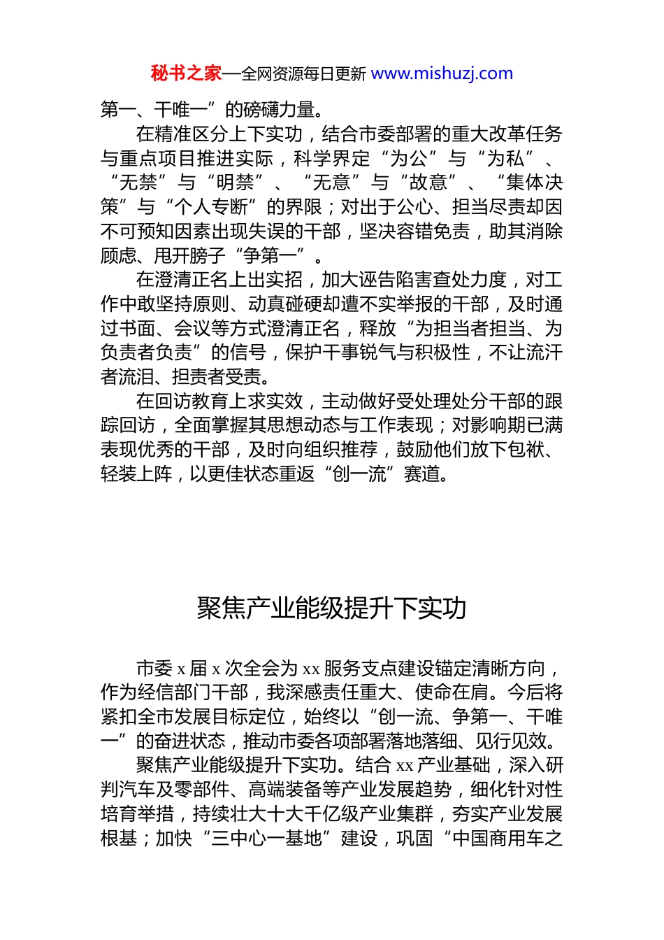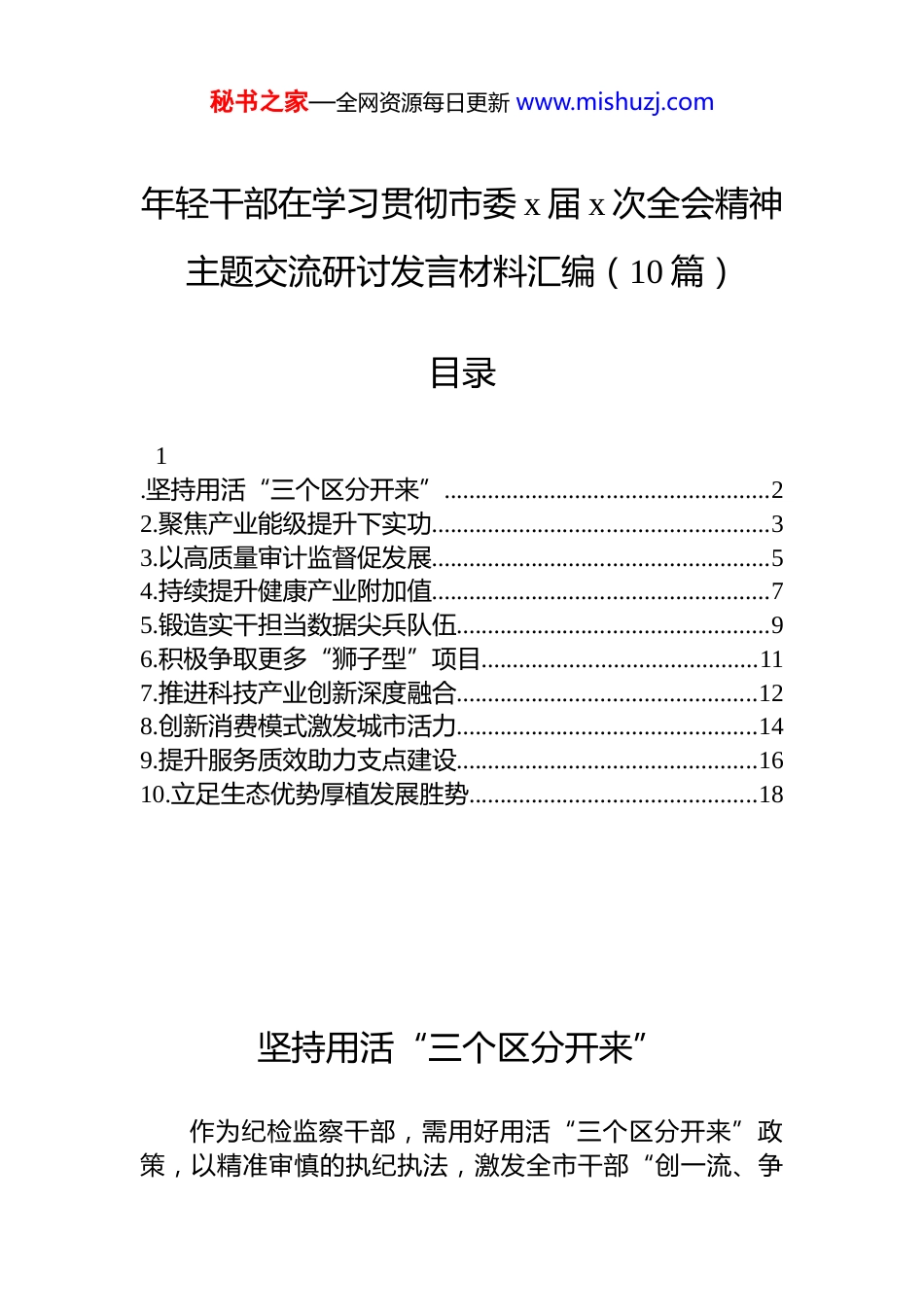 秘书之家—全网资源每日更新 www.mishuzj.com年轻干部在学习贯彻市委 x 届 x 次全会精神主题交流研讨发言材料汇编(10 篇)目录1.坚持用活“三个区分开来”....................................................22.聚焦产业能级提升下实功......................................................33.以高质量审计监督促发展......................................................54.持续提升健康产业附加值......................................................75.锻造实干担当数据尖兵队伍..................................................96.积极争取更多“狮子型”项目............................................117.推进科技产业创新深度融合................................................128.创新消费模式激发城市活力................................................149.提升服务质效助力支点建设................................................1610.立足生态优势厚植发展胜势..............................................18坚持用活“三个区分开来”作为纪检监察干部,需用好用活“三个区分开来”政策,以精准审慎的执纪执法,激发全市干部“创一流、争秘书之家—全网资源每日更新 www.mishuzj.com第一、干唯一”的磅礴力量。在精准区分上下实功,结合市委部署的重大改革任务与重点项目推进实际,科学界定“为公”与“为私”、“无禁”与“明禁”、“无意”与“故意”、“集体决策”与“个人专断”的界限;对出于公心、担当尽责却因不可预知因素出现失误的干部,坚决容错免责,助其消除顾虑、甩开膀子“争第一”。在澄清正名上出实招,加大诬告陷害查处力度,对工作中敢坚持原则、动真碰硬却遭不实举报的干部,及时通过书面、会议等方式澄清正名,释放“为担当者担当、为负责者负责”的信号,保护干事锐气与积极性,不让流汗者流泪、担责者受责。在回访教育上求实效,主动做好受处理处分干部的跟踪回访,全面掌握其思想动态与工作表现;对影响期已满表现优秀的干部,及时向组织推荐,鼓励他们放下包袱、轻装上阵,以更佳状态重返“创一流”赛道。聚焦产业能级提升下实功市委 x 届 x 次全会为 xx 服务支点建设锚定清晰方向,作为经信部门干部,我深感责任重大、使命在肩。今后将紧扣全市发展目标定位,始终以“创一流、争第一、干唯一”的奋进状态,推动市委各项部署落地落细、见行见效。聚焦产业能级提升下实功。结合 xx 产业基础,深入研判汽车及零部件、高端装备等产业发展趋势,细化针对性培育举措,持续壮大十大千亿级产业集群,夯实产业发展根基;加快“三中心一基地”建设,巩固“中国商用车之秘书之家—全网资源每日更新 www.mishuzj.com都”核心地位,同步助力高端装备、智能农机、新能源新材料产业扩规模、提质量。同时抓实产业链强链补链,以优质项目扩大产业增量,推进数字技术赋能与绿色低碳转型,推动产业向更高质量、更高能级迈进。聚焦企业能级提升求实效。精准实施“千百上专”企业梯队培育,重点服务龙头企业突破产品技术创新瓶颈、扩大市场规模,助力其提档升级;强化专精特新企业培育完善中小企业梯度成长机制、打通成长通道,有序推动“个转企、小升规、规做精”转型,培育优质企业矩阵,切实提升企业核心竞争力。今后我将持续强化主动作为意识,坚持务实工作导向,以精准精细的作风抓实抓细各项任务,为 xx 服务支点建设、实现既定发展目标贡献坚实力量。以高质量审计监督促发展作为审计干部,要深刻领会市委六届十次全会精神实质和核心要义,将审计工作融入 xx 服务支点建设大局统筹谋划、一体推进,主动担当作为、认真履职尽责,以高质量审计监督护航 xx 经济社会高质量发展。在聚焦主责主业上展现新作为。立足经济监督核心定位,深化财政审计,推动财政资源统筹整合与高效利用;做实前置审计监督,精准防范化解各类风险隐患;突出民生重点领域与项目资金审计,筑牢民生保障底板;强化领导干部经济责任审计,规范权力运行;创新资源环境审计服务“一泓清水永续北上”。在提升监督效能上实现新突破。...