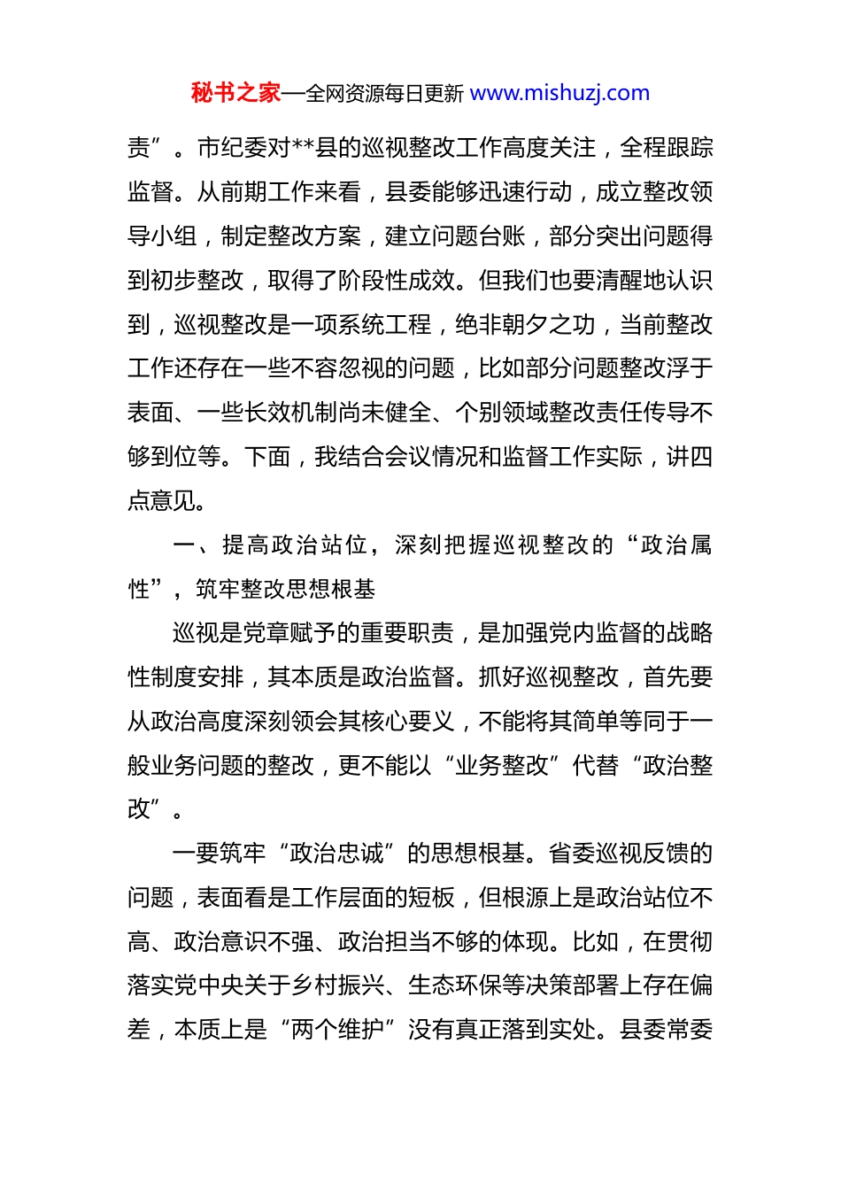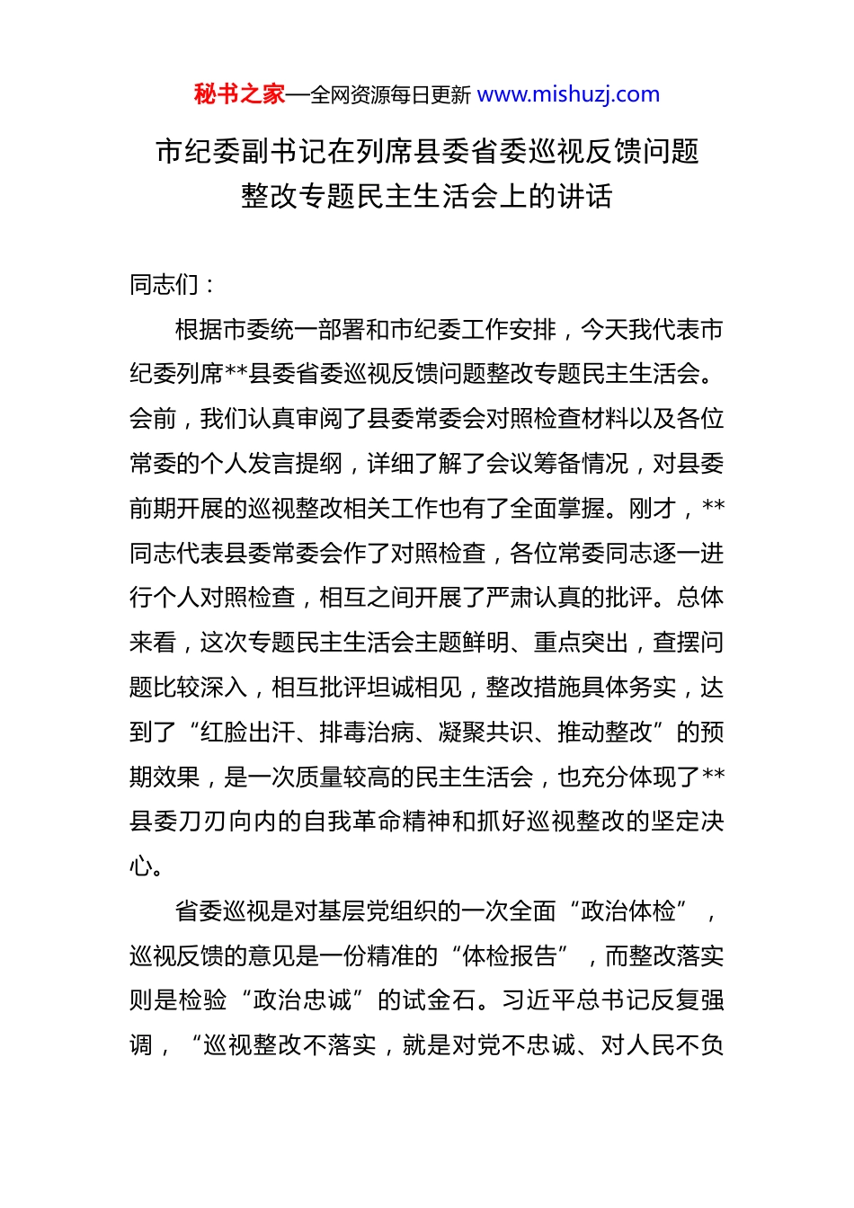 秘书之家—全网资源每日更新 www.mishuzj.com市纪委副书记在列席县委省委巡视反馈问题整改专题民主生活会上的讲话 同志们:根据市委统一部署和市纪委工作安排,今天我代表市纪委列席**县委省委巡视反馈问题整改专题民主生活会。会前,我们认真审阅了县委常委会对照检查材料以及各位常委的个人发言提纲,详细了解了会议筹备情况,对县委前期开展的巡视整改相关工作也有了全面掌握。刚才,**同志代表县委常委会作了对照检查,各位常委同志逐一进行个人对照检查,相互之间开展了严肃认真的批评。总体来看,这次专题民主生活会主题鲜明、重点突出,查摆问题比较深入,相互批评坦诚相见,整改措施具体务实,达到了“红脸出汗、排毒治病、凝聚共识、推动整改”的预期效果,是一次质量较高的民主生活会,也充分体现了**县委刀刃向内的自我革命精神和抓好巡视整改的坚定决心。省委巡视是对基层党组织的一次全面“政治体检”,巡视反馈的意见是一份精准的“体检报告”,而整改落实则是检验“政治忠诚”的试金石。习近平总书记反复强调,“巡视整改不落实,就是对党不忠诚、对人民不负秘书之家—全网资源每日更新 www.mishuzj.com责”。市纪委对**县的巡视整改工作高度关注,全程跟踪监督。从前期工作来看,县委能够迅速行动,成立整改领导小组,制定整改方案,建立问题台账,部分突出问题得到初步整改,取得了阶段性成效。但我们也要清醒地认识到,巡视整改是一项系统工程,绝非朝夕之功,当前整改工作还存在一些不容忽视的问题,比如部分问题整改浮于表面、一些长效机制尚未健全、个别领域整改责任传导不够到位等。下面,我结合会议情况和监督工作实际,讲四点意见。一、提高政治站位,深刻把握巡视整改的“政治属性”,筑牢整改思想根基巡视是党章赋予的重要职责,是加强党内监督的战略性制度安排,其本质是政治监督。抓好巡视整改,首先要从政治高度深刻领会其核心要义,不能将其简单等同于一般业务问题的整改,更不能以“业务整改”代替“政治整改”。一要筑牢“政治忠诚”的思想根基。省委巡视反馈的问题,表面看是工作层面的短板,但根源上是政治站位不高、政治意识不强、政治担当不够的体现。比如,在贯彻落实党中央关于乡村振兴、生态环保等决策部署上存在偏差,本质上是“两个维护”没有真正落到实处。县委常委秘书之家—全网资源每日更新 www.mishuzj.com会要把学习贯彻习近平总书记关于巡视工作的重要论述作为首要政治任务,与学习贯彻党的二十大精神结合起来,与落实省委、市委工作要求贯通起来,通过县委理论学习中心组集中学、专题研讨深入学、基层调研实践学,切实把思想和行动统一到党中央关于巡视整改的决策部署上来,以整改落实的实际行动践行“两个维护”。二要强化“人民至上”的政治立场。巡视反馈的问题中,不少涉及民生领域,比如老旧小区改造滞后、农村饮水安全保障不足、教育医疗资源分配不均等,这些问题直接关系到群众的获得感、幸福感、安全感。县委常委班子作为“关键少数”,要始终把人民群众的急难愁盼放在心上,把整改工作与“我为群众办实事”实践活动深度融合,主动深入基层一线,倾听群众呼声,梳理群众诉求,把群众满意作为整改成效的最高标准,以“时时放心不下”的责任感抓好民生领域问题整改,让群众切实感受到巡视整改带来的新变化。三要扛起“管党治党”的政治责任。从巡视反馈情况来看,**县在党风廉政建设、干部队伍管理、基层党组织建设等方面仍存在薄弱环节,这警示我们全面从严治党永远在路上。县委要切实担负起巡视整改主体责任,县委书记要履行好第一责任人责任,各位常委要落实“一岗双秘书之家—全网资源每日更新 www.mishuzj.com责”,把整改工作与全面从严治党各项任务紧密结合,以巡视整改为契机,深挖问题根源,健全制度机制,切实把管党治党责任扛在肩上、抓在手上,推动全面从严治党向基层延伸、向纵深发展。二、坚持问题导向,精准聚焦整改落实的“关键环节”,确保整改见底见效问题是整改的靶向,只有找准问题、靶向施策,才能确保整改不偏方向、不走过场。刚才各位常委的对照检查,既查摆了共性问题,也剖析了个性问题,下...