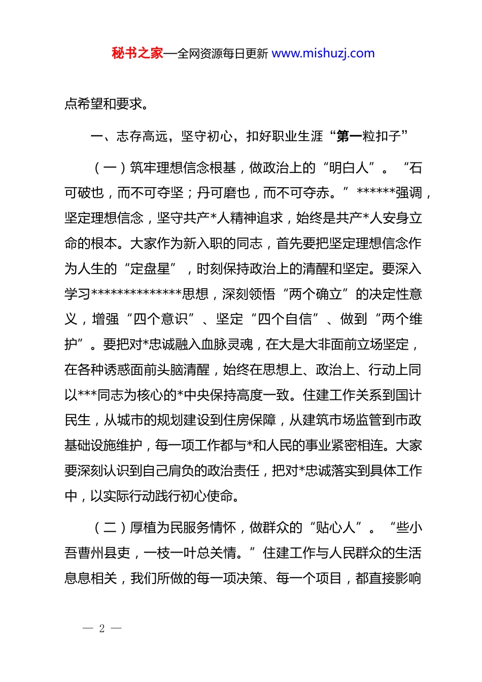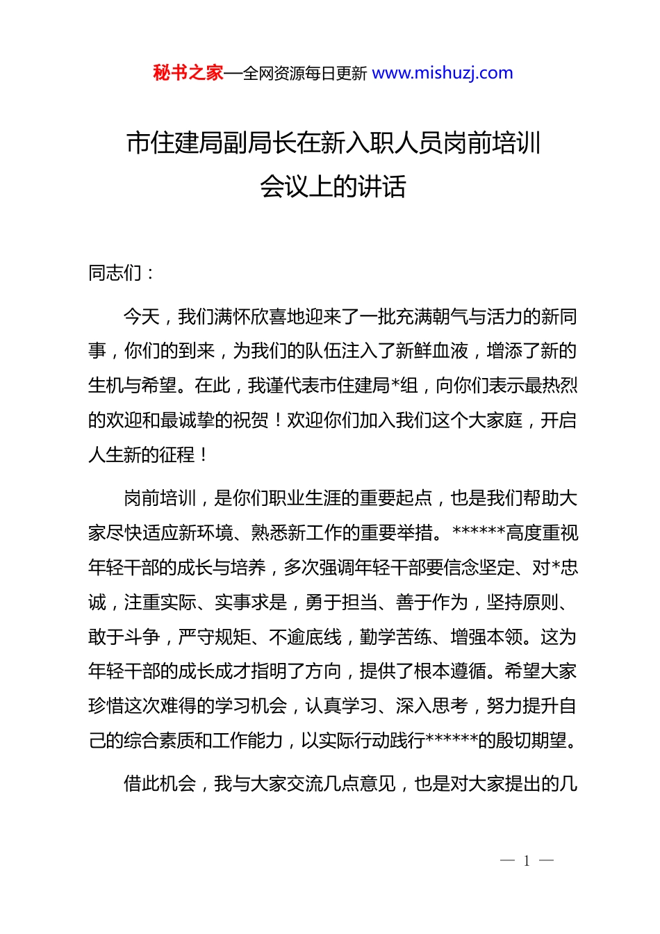 秘书之家—全网资源每日更新 www.mishuzj.com市住建局副局长在新入职人员岗前培训会议上的讲话同志们:今天,我们满怀欣喜地迎来了一批充满朝气与活力的新同事,你们的到来,为我们的队伍注入了新鲜血液,增添了新的生机与希望。在此,我谨代表市住建局*组,向你们表示最热烈的欢迎和最诚挚的祝贺!欢迎你们加入我们这个大家庭,开启人生新的征程!岗前培训,是你们职业生涯的重要起点,也是我们帮助大家尽快适应新环境、熟悉新工作的重要举措。******高度重视年轻干部的成长与培养,多次强调年轻干部要信念坚定、对*忠诚,注重实际、实事求是,勇于担当、善于作为,坚持原则、敢于斗争,严守规矩、不逾底线,勤学苦练、增强本领。这为年轻干部的成长成才指明了方向,提供了根本遵循。希望大家珍惜这次难得的学习机会,认真学习、深入思考,努力提升自己的综合素质和工作能力,以实际行动践行******的殷切期望。借此机会,我与大家交流几点意见,也是对大家提出的几— 1 —秘书之家—全网资源每日更新 www.mishuzj.com点希望和要求。一、志存高远,坚守初心,扣好职业生涯“第一粒扣子”(一)筑牢理想信念根基,做政治上的“明白人”。“石可破也,而不可夺坚;丹可磨也,而不可夺赤。”******强调,坚定理想信念,坚守共产*人精神追求,始终是共产*人安身立命的根本。大家作为新入职的同志,首先要把坚定理想信念作为人生的“定盘星”,时刻保持政治上的清醒和坚定。要深入学习**************思想,深刻领悟“两个确立”的决定性意义,增强“四个意识”、坚定“四个自信”、做到“两个维护”。要把对*忠诚融入血脉灵魂,在大是大非面前立场坚定,在各种诱惑面前头脑清醒,始终在思想上、政治上、行动上同以***同志为核心的*中央保持高度一致。住建工作关系到国计民生,从城市的规划建设到住房保障,从建筑市场监管到市政基础设施维护,每一项工作都与*和人民的事业紧密相连。大家要深刻认识到自己肩负的政治责任,把对*忠诚落实到具体工作中,以实际行动践行初心使命。(二)厚植为民服务情怀,做群众的“贴心人”。“些小吾曹州县吏,一枝一叶总关情。”住建工作与人民群众的生活息息相关,我们所做的每一项决策、每一个项目,都直接影响— 2 —秘书之家—全网资源每日更新 www.mishuzj.com着群众的居住条件和生活品质。大家要时刻牢记全心全意为人民服务的根本宗旨,把人民群众对美好生活的向往作为奋斗目标。在工作中,要主动倾听群众的呼声和诉求,想群众之所想,急群众之所急,解群众之所难。比如在老旧小区改造工作中,要充分征求居民意见,从基础设施完善、环境整治到公共服务提升,每一个环节都要以群众满意为标准,切实改善居民的居住环境。在保障性住房建设和分配管理中,要严格把关,确保真正有住房困难的群众能够享受到政策红利,让他们感受到*和政府的关怀与温暖。只有心里装着群众,工作依靠群众,我们的事业才能赢得群众的支持和拥护,才能行稳致远。(三)保持清正廉洁本色,做纪律的“坚守人”。“不受曰廉,不污曰洁。”清正廉洁是*员干部的立身之本,也是我们事业发展的重要保障。住建领域资金密集、项目众多,是廉政风险的高发领域。大家作为新入职的同志,要时刻保持对纪律和法律的敬畏之心,自觉遵守 dj 国法和单位的各项规章制度,坚决杜绝侥幸心理。要自觉抵制各种诱惑,坚决做到不拿群众一针一线,不接受服务对象的礼品礼金和宴请,不利用职务之便谋取私利。要培养健康的生活情趣,净化自己的社交圈、生活圈、朋友圈,做到慎独、慎微、慎初。要主动接受组织和群— 3 —秘书之家—全网资源每日更新 www.mishuzj.com众的监督,把监督当作是对自己的爱护,习惯于在监督下工作和生活。只有坚守廉洁底线,我们才能在职业生涯中走得稳、走得远,才能不辜负组织的信任和人民的期望。二、加强学习,提升能力,练就干事创业“硬脊梁”(一)加强政治理论学习,提升政治素养。“学者非必为仕,而仕者必为学。”政治理论学习是我们提高政治站位、把握政治方向、增强政治能力的重要途径。大家要深入学习*的二十大精神和******关于住房和城乡建设工作的...