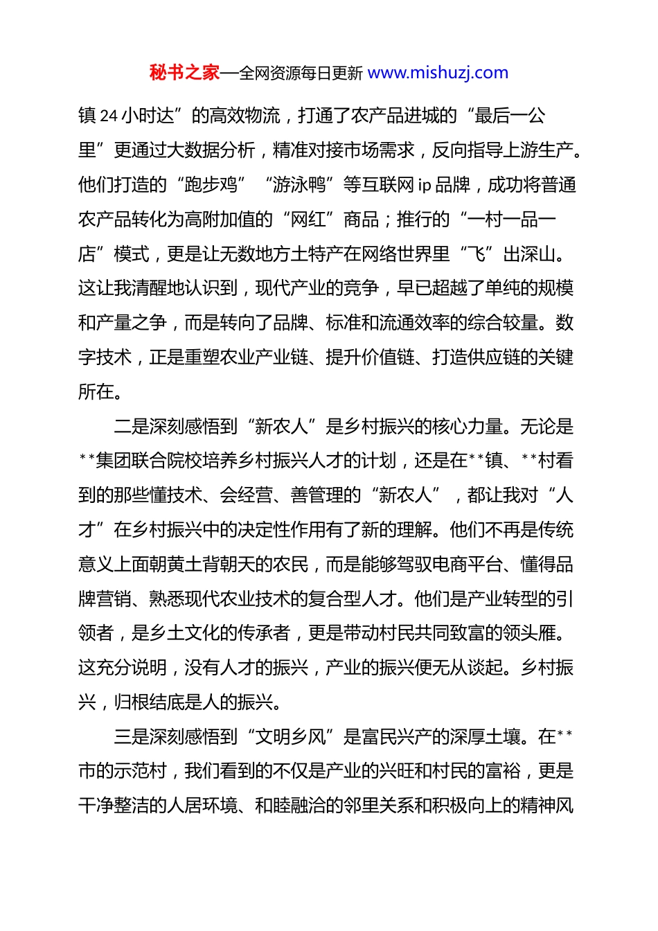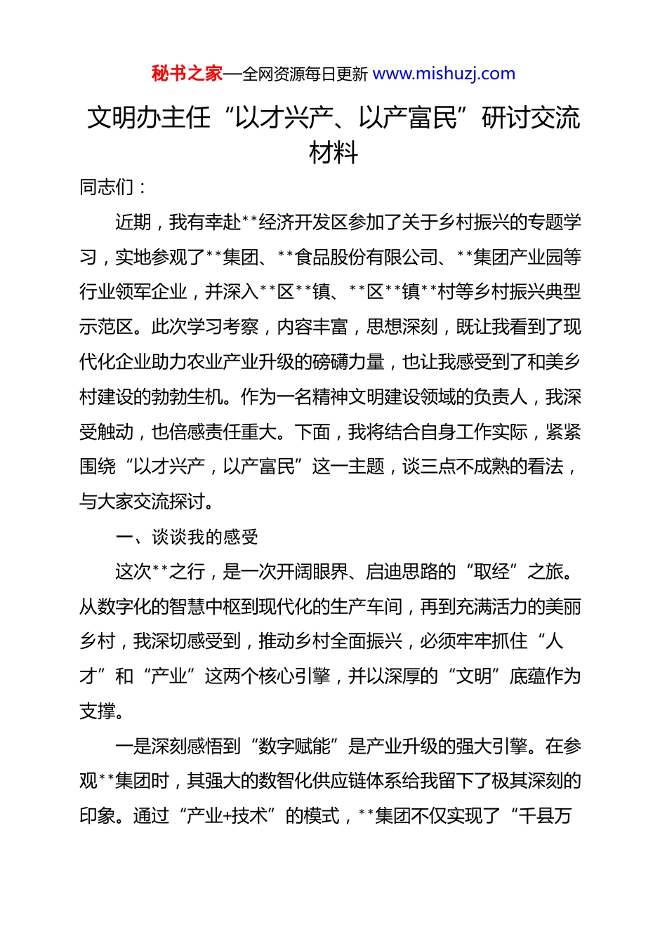 秘书之家—全网资源每日更新 www.mishuzj.com文明办主任“以才兴产、以产富民”研讨交流材料同志们:近期,我有幸赴**经济开发区参加了关于乡村振兴的专题学习,实地参观了**集团、**食品股份有限公司、**集团产业园等行业领军企业,并深入**区**镇、**区**镇**村等乡村振兴典型示范区。此次学习考察,内容丰富,思想深刻,既让我看到了现代化企业助力农业产业升级的磅礴力量,也让我感受到了和美乡村建设的勃勃生机。作为一名精神文明建设领域的负责人,我深受触动,也倍感责任重大。下面,我将结合自身工作实际,紧紧围绕“以才兴产,以产富民”这一主题,谈三点不成熟的看法,与大家交流探讨。一、谈谈我的感受这次**之行,是一次开阔眼界、启迪思路的“取经”之旅。从数字化的智慧中枢到现代化的生产车间,再到充满活力的美丽乡村,我深切感受到,推动乡村全面振兴,必须牢牢抓住“人才”和“产业”这两个核心引擎,并以深厚的“文明”底蕴作为支撑。一是深刻感悟到“数字赋能”是产业升级的强大引擎。在参观**集团时,其强大的数智化供应链体系给我留下了极其深刻的印象。通过“产业+技术”的模式,**集团不仅实现了“千县万秘书之家—全网资源每日更新 www.mishuzj.com镇 24 小时达”的高效物流,打通了农产品进城的“最后一公里”更通过大数据分析,精准对接市场需求,反向指导上游生产。他们打造的“跑步鸡”“游泳鸭”等互联网 ip 品牌,成功将普通农产品转化为高附加值的“网红”商品;推行的“一村一品一店”模式,更是让无数地方土特产在网络世界里“飞”出深山。这让我清醒地认识到,现代产业的竞争,早已超越了单纯的规模和产量之争,而是转向了品牌、标准和流通效率的综合较量。数字技术,正是重塑农业产业链、提升价值链、打造供应链的关键所在。二是深刻感悟到“新农人”是乡村振兴的核心力量。无论是**集团联合院校培养乡村振兴人才的计划,还是在**镇、**村看到的那些懂技术、会经营、善管理的“新农人”,都让我对“人才”在乡村振兴中的决定性作用有了新的理解。他们不再是传统意义上面朝黄土背朝天的农民,而是能够驾驭电商平台、懂得品牌营销、熟悉现代农业技术的复合型人才。他们是产业转型的引领者,是乡土文化的传承者,更是带动村民共同致富的领头雁。这充分说明,没有人才的振兴,产业的振兴便无从谈起。乡村振兴,归根结底是人的振兴。三是深刻感悟到“文明乡风”是富民兴产的深厚土壤。在**市的示范村,我们看到的不仅是产业的兴旺和村民的富裕,更是干净整洁的人居环境、和睦融洽的邻里关系和积极向上的精神风秘书之家—全网资源每日更新 www.mishuzj.com貌。**将文明乡风建设作为基础工程,通过 dj 引领、文明实践、群众自治,让红色文化、黄河文化等融入乡村治理,让移风易俗的秦腔小戏唱进百姓心坎,让“村规民约”成为村民的自觉行动。这些生动的实践证明,精神文明建设与物质文明建设是相辅相成、不可分割的。良好的乡风民风,能够有效降低乡村治理成本,增强社会凝聚力,为产业发展和人才集聚创造一个稳定、和谐、充满正能量的“软环境”。一个地方的营商环境好不好,社会风气正不正,直接决定了它能否吸引人才、留住资本、激发活力。二、找找我们的差距学所以益才也,砺所以致刃也。在感受先进地区强劲发展脉搏的同时,我们更需冷静地对标反思,清醒地认识到**旗在“以才兴产,以产富民”道路上存在的差距和短板。这些差距既有客观条件的制约,更有主观认识和工作方法上的不足。一是在“产才融合”上存在“两张皮”现象,人才支撑与产业需求脱节。当前,我旗的产业发展面临着产业链条短、附加值低、品牌建设滞后等一系列瓶颈问题。与此同时,我们的人才状况也不容乐观:一方面,乡村青壮年劳动力持续外流,高素质农民、基层农技人员和本土实用技能人才严重缺乏;另一方面,我们引才的激励保障机制尚不健全,对高端人才缺乏足够的吸引力。这种“产业喊渴,人才流失”的结构性矛盾,导致产业升级缺乏智力支持,人才培养又找不到明确的产业出口,形成了恶性循环。秘书之家—全网资源每日更新 www.mishuzj.com相比于**集团那种“产业...