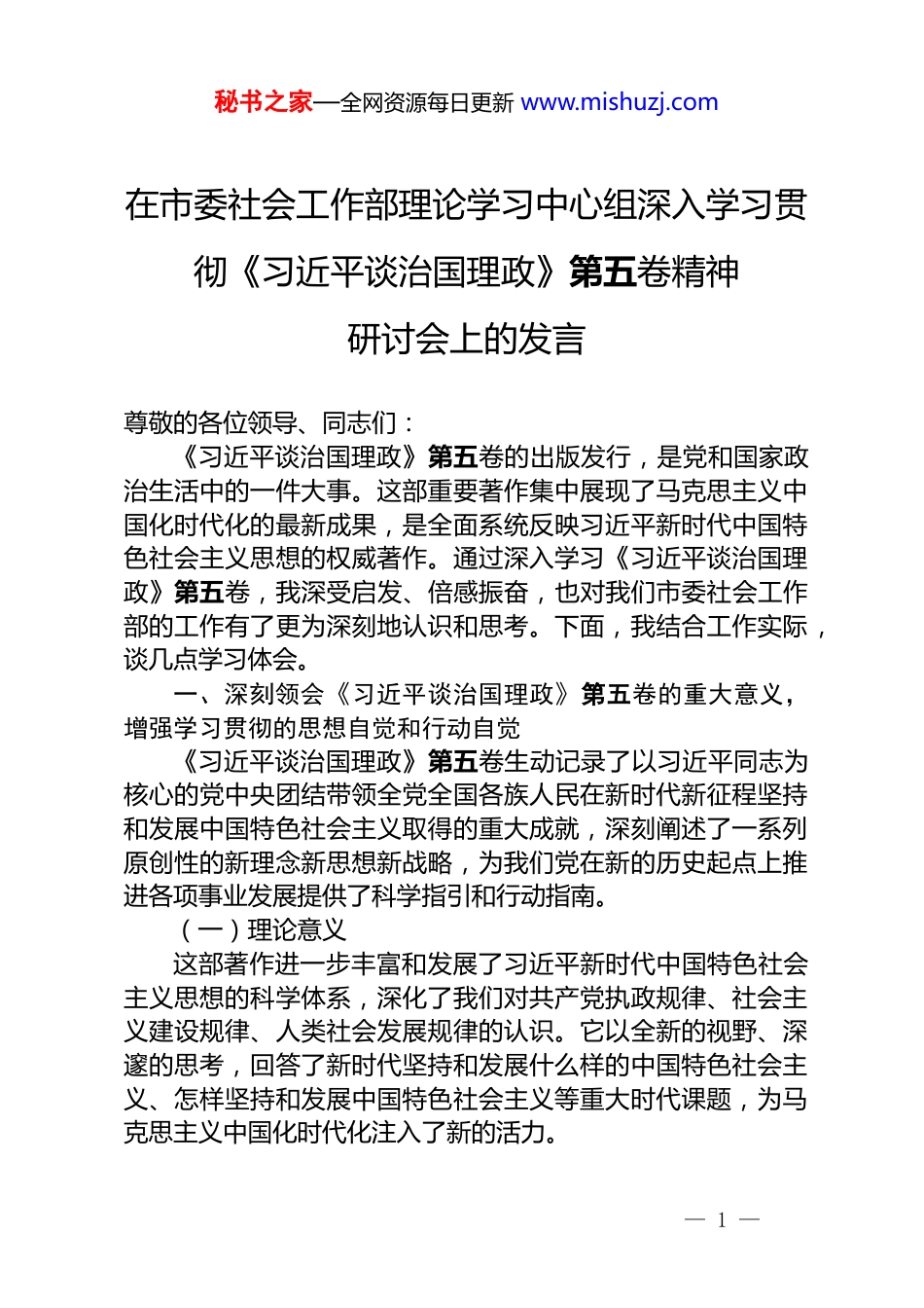 秘书之家—全网资源每日更新 www.mishuzj.com在市委社会工作部理论学习中心组深入学习贯彻《习近平谈治国理政》第五卷精神研讨会上的发言尊敬的各位领导、同志们:《习近平谈治国理政》第五卷的出版发行,是党和国家政治生活中的一件大事。这部重要著作集中展现了马克思主义中国化时代化的最新成果,是全面系统反映习近平新时代中国特色社会主义思想的权威著作。通过深入学习《习近平谈治国理政》第五卷,我深受启发、倍感振奋,也对我们市委社会工作部的工作有了更为深刻地认识和思考。下面,我结合工作实际,谈几点学习体会。一、深刻领会《习近平谈治国理政》第五卷的重大意义,增强学习贯彻的思想自觉和行动自觉《习近平谈治国理政》第五卷生动记录了以习近平同志为核心的党中央团结带领全党全国各族人民在新时代新征程坚持和发展中国特色社会主义取得的重大成就,深刻阐述了一系列原创性的新理念新思想新战略,为我们党在新的历史起点上推进各项事业发展提供了科学指引和行动指南。(一)理论意义这部著作进一步丰富和发展了习近平新时代中国特色社会主义思想的科学体系,深化了我们对共产党执政规律、社会主义建设规律、人类社会发展规律的认识。它以全新的视野、深邃的思考,回答了新时代坚持和发展什么样的中国特色社会主义、怎样坚持和发展中国特色社会主义等重大时代课题,为马克思主义中国化时代化注入了新的活力。— 1 —秘书之家—全网资源每日更新 www.mishuzj.com(二)实践意义《习近平谈治国理政》第五卷源于实践又指导实践,为我们解决实际问题提供了具体的方法和路径。在当前复杂多变的国际形势和国内改革发展稳定的艰巨任务面前,它为我们应对挑战、化解风险、推动工作提供了有力的思想武器。对于我们市委社会工作部来说,它为我们做好社会建设、基层治理、群众工作等提供了明确的方向和思路。(三)世界意义这部著作展现了中国智慧和中国方案,为世界各国发展提供了有益借鉴。它倡导构建人类命运共同体,推动全球治理体系变革,为解决人类面临的共同问题贡献了中国力量。在国际社会日益关注中国发展道路和发展模式的今天,《习近平谈治国理政》第五卷的出版发行,有助于增进国际社会对中国的了解和认同。二、准确把握《习近平谈治国理政》第五卷的核心要义,推动社会工作高质量发展(一)坚持以人民为中心的发展思想人民性是马克思主义的本质属性,以人民为中心是习近平新时代中国特色社会主义思想的根本立场。《习近平谈治国理政》第五卷处处体现着人民至上的价值理念。我们市委社会工作部的工作,本质上就是为人民服务的工作。我们要始终把人民放在心中最高位置,把人民对美好生活的向往作为我们的奋斗目标。在社会建设和基层治理中,要充分尊重人民群众的主体地位和首创精神,广泛听取人民群众的意见和建议,让人民群众成为社会发展的参与者、推动者和受益者。例如,在推进社区建设过程中,要充分考虑居民的需求和意愿,打造宜居、宜业、宜游的社区环境,提高居民的生活质量和幸福感。(二)坚持系统观念系统观念是具有基础性的思想和工作方法。在《习近平谈— 2 —秘书之家—全网资源每日更新 www.mishuzj.com治国理政》第五卷中,习近平总书记多次强调要坚持系统观念,加强前瞻性思考、全局性谋划、战略性布局、整体性推进。我们在社会工作中,面临着复杂多样的问题和挑战,需要运用系统观念来统筹协调各方面的工作。要把社会建设、基层治理、群众工作等各项任务作为一个有机整体,通盘考虑、协同推进。比如,在推进基层治理现代化过程中,要统筹考虑党建引领、法治保障、德治教化、自治强基等多个方面,形成共建共治共享的基层治理格局。(三)坚持创新发展创新是引领发展的第一动力。《习近平谈治国理政》第五卷强调要坚定不移走中国特色自主创新道路,加快实现高水平科技自立自强。在社会工作领域,我们也需要不断创新工作理念、工作方法和工作机制。要积极运用现代信息技术,推动社会工作数字化转型。例如,利用大数据、人工智能等技术,建立社会治理大数据平台,实现对社会矛盾纠纷的精准预警和及时化解。同时,要鼓励基层探索创新,及时总...