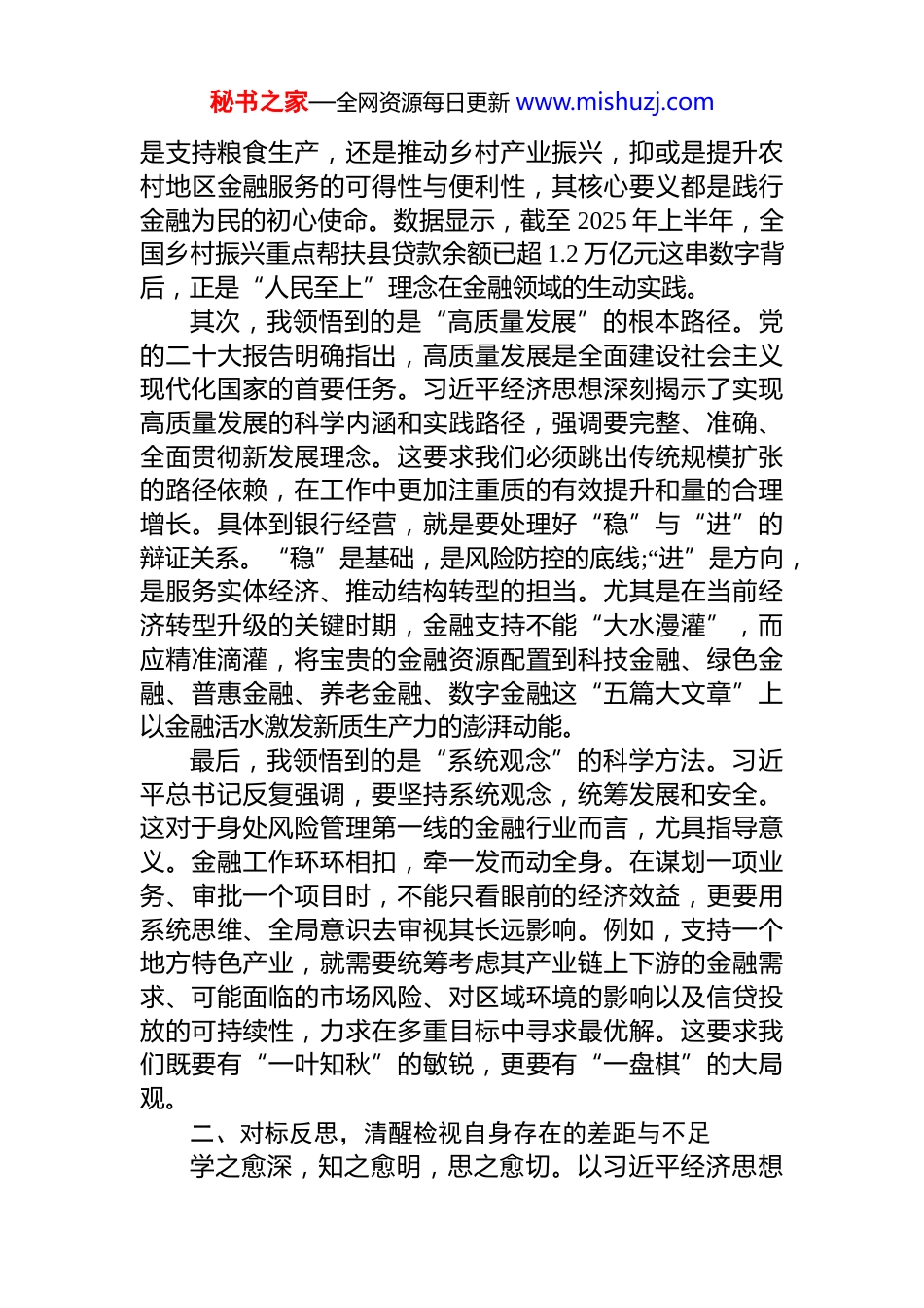 秘书之家—全网资源每日更新 www.mishuzj.com在 XX 银行党委理论学习中心组关于深入学习贯彻总书记经济思想专题研讨会上的发言材料尊敬的各位领导、同志们:根据本次党委理论学习中心组的学习安排,我结合近期对《习近平经济文选》第一卷等经典著作的深入学习,以及在 XX 银行的工作实践,谈几点个人学习习近平经济思想的心得体会。我的发言主要分为三个部分:一是深化思想伟力之“识”,二是反思知行合一之“距”,三是明确履职尽责之“行”。不当之处,请大家批评指正。一、登高望远,深刻领悟思想伟力的时代内涵与实践要求身处百年未有之大变局,面对复杂严峻的内外环境,中国经济巨轮为何能劈波斩浪、行稳致远?通过此次系统性、沉浸式的学习,我更加深刻地认识到,根本在于有习近平经济思想这一马克思主义政治经济学中国化时代化的最新成果作为科学指引。这一思想博大精深,内涵丰富,既是世界观,也是方法论,为我们金融工作者提供了破解难题开创新局的“金钥匙”。首先,我领悟到的是“国之大者”的根本立场。习近平经济思想最鲜明的底色,就是“以人民为中心”的发展思想。这与金融工作的政治性、人民性本质要求完全契合过去,我可能更多地从业务指标、市场份额的角度思考工作,但现在我认识到,每一笔贷款的发放、每一项服务的推出,背后都关乎民生冷暖与实体经济的脉搏。作为服务“三农”的主力军,XX 银行的根在农村、魂在为民。无论秘书之家—全网资源每日更新 www.mishuzj.com是支持粮食生产,还是推动乡村产业振兴,抑或是提升农村地区金融服务的可得性与便利性,其核心要义都是践行金融为民的初心使命。数据显示,截至 2025 年上半年,全国乡村振兴重点帮扶县贷款余额已超 1.2 万亿元这串数字背后,正是“人民至上”理念在金融领域的生动实践。其次,我领悟到的是“高质量发展”的根本路径。党的二十大报告明确指出,高质量发展是全面建设社会主义现代化国家的首要任务。习近平经济思想深刻揭示了实现高质量发展的科学内涵和实践路径,强调要完整、准确、全面贯彻新发展理念。这要求我们必须跳出传统规模扩张的路径依赖,在工作中更加注重质的有效提升和量的合理增长。具体到银行经营,就是要处理好“稳”与“进”的辩证关系。“稳”是基础,是风险防控的底线;“进”是方向,是服务实体经济、推动结构转型的担当。尤其是在当前经济转型升级的关键时期,金融支持不能“大水漫灌”,而应精准滴灌,将宝贵的金融资源配置到科技金融、绿色金融、普惠金融、养老金融、数字金融这“五篇大文章”上以金融活水激发新质生产力的澎湃动能。最后,我领悟到的是“系统观念”的科学方法。习近平总书记反复强调,要坚持系统观念,统筹发展和安全。这对于身处风险管理第一线的金融行业而言,尤具指导意义。金融工作环环相扣,牵一发而动全身。在谋划一项业务、审批一个项目时,不能只看眼前的经济效益,更要用系统思维、全局意识去审视其长远影响。例如,支持一个地方特色产业,就需要统筹考虑其产业链上下游的金融需求、可能面临的市场风险、对区域环境的影响以及信贷投放的可持续性,力求在多重目标中寻求最优解。这要求我们既要有“一叶知秋”的敏锐,更要有“一盘棋”的大局观。二、对标反思,清醒检视自身存在的差距与不足学之愈深,知之愈明,思之愈切。以习近平经济思想秘书之家—全网资源每日更新 www.mishuzj.com这面“镜子”来审视自己,我深感在思想认识和工作实践中还存在一些差距,亟待改进。一是在学懂弄通上存在“温差”。过去对于经济思想的学习,有时满足于“知其然”,对一些新理念、新论断的理解停留在概念层面,未能完全做到“知其所以然”和“知其所以必然”。比如,对于“新发展格局”,我一度简单地将其理解为强调内循环,而未能深刻把握其作为“重塑我国国际合作和竞争新优势的战略抉择”的深远意义。这种理论学习上的深度不够,导致在工作中洞察大势把握规律的前瞻性和主动性有所欠缺,有时会被动地应对市场变化,而不是主动地顺势而为、谋篇布局。二是在系统思维上存在“偏差”。在日常管理工作中,有时还是会不自觉地陷入“就业务抓业务”的...