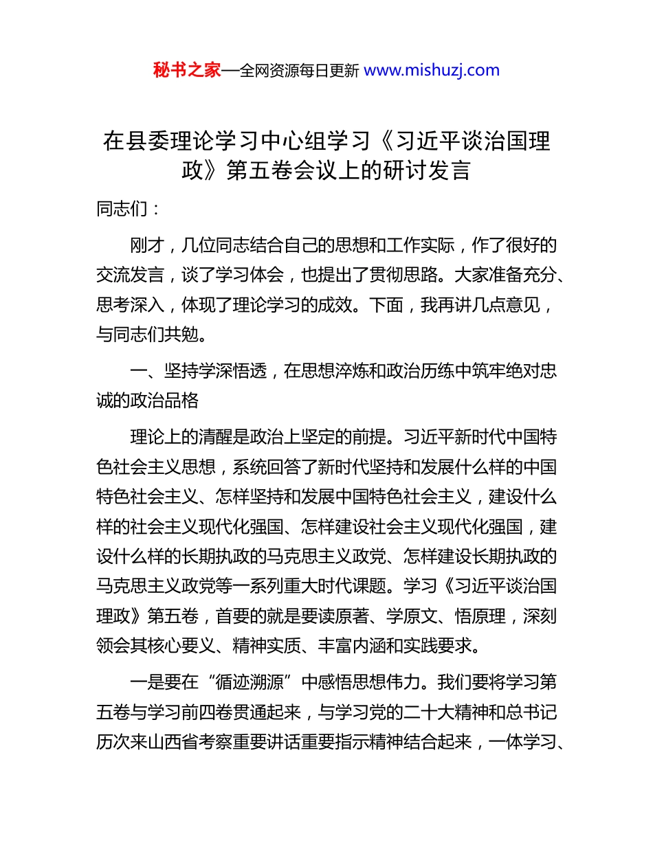 秘书之家—全网资源每日更新 www.mishuzj.com在县委理论学习中心组学习《习近平谈治国理政》第五卷会议上的研讨发言同志们:刚才,几位同志结合自己的思想和工作实际,作了很好的交流发言,谈了学习体会,也提出了贯彻思路。大家准备充分、思考深入,体现了理论学习的成效。下面,我再讲几点意见,与同志们共勉。一、坚持学深悟透,在思想淬炼和政治历练中筑牢绝对忠诚的政治品格理论上的清醒是政治上坚定的前提。习近平新时代中国特色社会主义思想,系统回答了新时代坚持和发展什么样的中国特色社会主义、怎样坚持和发展中国特色社会主义,建设什么样的社会主义现代化强国、怎样建设社会主义现代化强国,建设什么样的长期执政的马克思主义政党、怎样建设长期执政的马克思主义政党等一系列重大时代课题。学习《习近平谈治国理政》第五卷,首要的就是要读原著、学原文、悟原理,深刻领会其核心要义、精神实质、丰富内涵和实践要求。一是要在“循迹溯源”中感悟思想伟力。我们要将学习第五卷与学习前四卷贯通起来,与学习党的二十大精神和总书记历次来山西省考察重要讲话重要指示精神结合起来,一体学习、秘书之家—全网资源每日更新 www.mishuzj.com一体领会。要深刻认识到,这一思想是在新时代伟大实践中应运而生、在指导实践中不断丰富发展的。从中国梦的提出,到“五位一体”总体布局和“四个全面”战略布局的协调推进;从创新、协调、绿色、开放、共享的新发展理念,到构建以国内大循环为主体、国内国际双循环相互促进的新发展格局;从脱贫攻坚的全面胜利,到全面建成小康社会的庄严宣告,我们党治国理政的每一个重大决策、每一次战略部署,都闪耀着这一思想的理论光辉。我们要通过系统学习,深刻感悟总书记作为马克思主义政治家、思想家、战略家的非凡理论勇气、卓越政治智慧、强烈使命担当和“我将无我、不负人民”的赤子情怀,从而更加自觉地做习近平新时代中国特色社会主义思想的坚定信仰者和忠实实践者。二是要在“融会贯通”中把握精髓要义。第五卷内容博大精深,涵盖了改革发展稳定、内政外交国防、治党治国治军等方方面面。我们不能满足于零散化、碎片化地学习,必须坚持全面系统、融会贯通。要深刻把握“两个结合”的重大意义,理解这一思想是如何把马克思主义基本原理同中国具体实际、同中华优秀传统文化相结合,从而开辟了马克思主义中国化时代化新境界。要深刻把握“六个必须坚持”的世界观和方法论,特别是其中的人民至上、自信自立、守正创新、问题导向、系统观念和胸怀天下。这些立场观点方法,是我们在工作中发现问题、分析问题、解决问题的“金钥匙”。全县各级领导干部秘书之家—全网资源每日更新 www.mishuzj.com都要把自己摆进去、把职责摆进去、把工作摆进去,真正学出坚定信念、学出绝对忠诚、学出使命担当。三是要在“知行合一”中提高政治能力。理论学习的最终目的在于指导实践。衡量我们学习成效的根本标尺,是看我们是否能够不断提高政治判断力、政治领悟力、政治执行力。政治判断力,就是要善于从纷繁复杂的矛盾中把握政治逻辑,在大是大非面前保持清醒头脑,始终在政治立场、政治方向、政治原则、政治道路上同党中央保持高度一致。政治领悟力,就是要对“国之大者”了然于胸,深刻领会党中央的战略意图和决策部署,确保我们*的工作始终沿着总书记指引的正确方向前进。政治执行力,就是要把党中央的决策部署、省委常委的工作要求,不折不扣、雷厉风行地落到实处,做到令行禁止、政令畅通。通过学习,我们要更加深刻领悟“两个确立”的决定性意义,更加自觉地增强“四个意识”、坚定“四个自信”、做到“两个维护”,确保*的各项事业始终是党的事业的重要组成部分。二、聚焦发展要务,在实干担当和攻坚克难中开创高质量发展新局面学习贯彻新思想,最终要体现在推动高质量发展的实际成效上。当前,我们正处在 2025 年的最后一个季度,这也是“十四五”规划的收官之年。时间紧、任务重,我们必须切实秘书之家—全网资源每日更新 www.mishuzj.com把学习成果转化为谋划发展的正确思路、促进发展的政策举措、领导发展的实际能力,全力以赴抓好各项工...