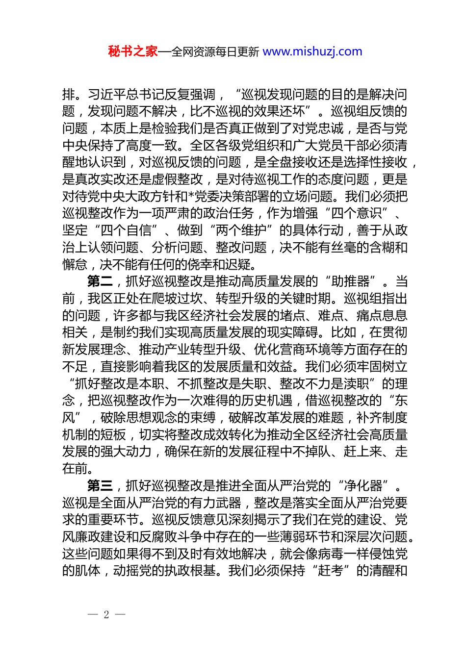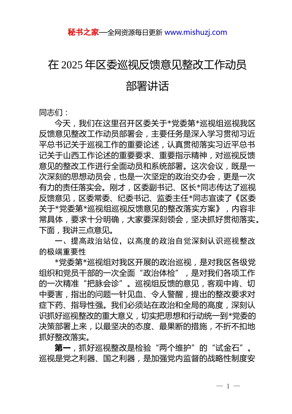 秘书之家—全网资源每日更新 www.mishuzj.com在 2025 年区委巡视反馈意见整改工作动员部署讲话同志们:今天,我们在这里召开区委关于*党委第*巡视组巡视我区反馈意见整改工作动员部署会,主要任务是深入学习贯彻习近平总书记关于巡视工作的重要论述,认真贯彻落实习近平总书记关于山西工作论述的重要要求、重要指示精神,对巡视反馈意见的整改工作进行全面动员和系统部署。这次会议,既是一次深刻的思想动员会,也是一次坚定的政治交办会,更是一次有力的责任落实会。刚才,区委副书记、区长*同志传达了巡视反馈意见,区委常委、纪委书记、监委主任*同志宣读了《区委关于*党委第*巡视组巡视反馈意见的整改落实方案》,内容非常具体,要求十分明确,大家要深刻领会,坚决抓好贯彻落实。下面,我讲三点意见。一、提高政治站位,以高度的政治自觉深刻认识巡视整改的极端重要性*党委第*巡视组对我区开展的政治巡视,是对我区各级党组织和党员干部的一次全面“政治体检”,是对我们各项工作的一次精准“把脉会诊”。巡视组反馈的意见,客观中肯、切中要害,指出的问题一针见血、令人警醒,提出的整改要求对症下药、指导性强。我们必须站在政治和全局的高度,深刻认识抓好巡视整改的重大意义,切实把思想和行动统一到*党委的决策部署上来,以最坚决的态度、最果断的措施,不折不扣地抓好整改落实。第一,抓好巡视整改是检验“两个维护”的“试金石”。巡视是党之利器、国之利器,是加强党内监督的战略性制度安— 1 —秘书之家—全网资源每日更新 www.mishuzj.com排。习近平总书记反复强调,“巡视发现问题的目的是解决问题,发现问题不解决,比不巡视的效果还坏”。巡视组反馈的问题,本质上是检验我们是否真正做到了对党忠诚,是否与党中央保持了高度一致。全区各级党组织和广大党员干部必须清醒地认识到,对巡视反馈的问题,是全盘接收还是选择性接收,是真改实改还是虚假整改,是对待巡视工作的态度问题,更是对待党中央大政方针和*党委决策部署的立场问题。我们必须把巡视整改作为一项严肃的政治任务,作为增强“四个意识”、坚定“四个自信”、做到“两个维护”的具体行动,善于从政治上认领问题、分析问题、整改问题,决不能有丝毫的含糊和懈怠,决不能有任何的侥幸和迟疑。第二,抓好巡视整改是推动高质量发展的“助推器”。当前,我区正处在爬坡过坎、转型升级的关键时期。巡视组指出的问题,许多都与我区经济社会发展的堵点、难点、痛点息息相关,是制约我们实现高质量发展的现实障碍。比如,在贯彻新发展理念、推动产业转型升级、优化营商环境等方面存在的不足,直接影响着我区的发展质量和效益。我们必须牢固树立“抓好整改是本职、不抓整改是失职、整改不力是渎职”的理念,把巡视整改作为一次难得的历史机遇,借巡视整改的“东风”,破除思想观念的束缚,破解改革发展的难题,补齐制度机制的短板,切实将整改成效转化为推动全区经济社会高质量发展的强大动力,确保在新的发展征程中不掉队、赶上来、走在前。第三,抓好巡视整改是推进全面从严治党的“净化器”。巡视是全面从严治党的有力武器,整改是落实全面从严治党要求的重要环节。巡视反馈意见深刻揭示了我们在党的建设、党风廉政建设和反腐败斗争中存在的一些薄弱环节和深层次问题。这些问题如果得不到及时有效地解决,就会像病毒一样侵蚀党的肌体,动摇党的执政根基。我们必须保持“赶考”的清醒和— 2 —秘书之家—全网资源每日更新 www.mishuzj.com坚定,发扬刀刃向内的自我革命精神,以巡视整改为契机,深入推进全面从严治党。要通过扎实整改,教育引导广大党员干部知敬畏、存戒惧、守底线,营造风清气正的政治生态;要通过建章立制,扎紧制度的笼子,铲除腐败滋生的土壤和条件;要通过强化监督,让权力在阳光下运行,坚定不移地把党风廉政建设和反腐败斗争引向深入。二、聚焦关键问题,以精准有力的举措扎实做好巡视“后半篇文章”巡视整改是一项系统工程,必须坚持问题导向、目标导向结果导向,对照巡视反馈意见和区委制定的整改方案,主动认领、对号入座,拿出“硬招”“实招”,确保件件有着落、事事...