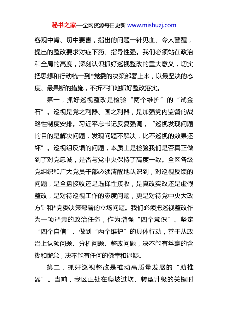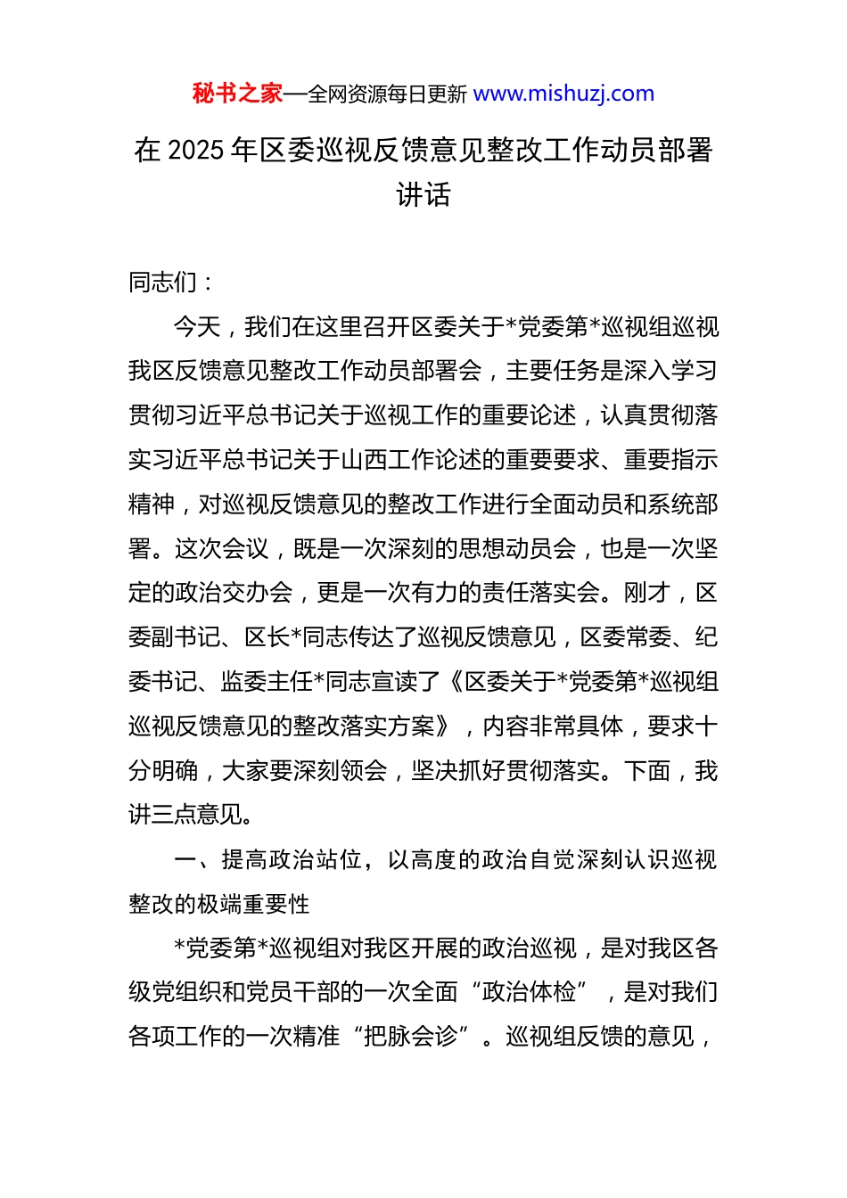 秘书之家—全网资源每日更新 www.mishuzj.com在 2025 年区委巡视反馈意见整改工作动员部署讲话 同志们:今天,我们在这里召开区委关于*党委第*巡视组巡视我区反馈意见整改工作动员部署会,主要任务是深入学习贯彻习近平总书记关于巡视工作的重要论述,认真贯彻落实习近平总书记关于山西工作论述的重要要求、重要指示精神,对巡视反馈意见的整改工作进行全面动员和系统部署。这次会议,既是一次深刻的思想动员会,也是一次坚定的政治交办会,更是一次有力的责任落实会。刚才,区委副书记、区长*同志传达了巡视反馈意见,区委常委、纪委书记、监委主任*同志宣读了《区委关于*党委第*巡视组巡视反馈意见的整改落实方案》,内容非常具体,要求十分明确,大家要深刻领会,坚决抓好贯彻落实。下面,我讲三点意见。一、提高政治站位,以高度的政治自觉深刻认识巡视整改的极端重要性*党委第*巡视组对我区开展的政治巡视,是对我区各级党组织和党员干部的一次全面“政治体检”,是对我们各项工作的一次精准“把脉会诊”。巡视组反馈的意见,秘书之家—全网资源每日更新 www.mishuzj.com客观中肯、切中要害,指出的问题一针见血、令人警醒,提出的整改要求对症下药、指导性强。我们必须站在政治和全局的高度,深刻认识抓好巡视整改的重大意义,切实把思想和行动统一到*党委的决策部署上来,以最坚决的态度、最果断的措施,不折不扣地抓好整改落实。第一,抓好巡视整改是检验“两个维护”的“试金石”。巡视是党之利器、国之利器,是加强党内监督的战略性制度安排。习近平总书记反复强调,“巡视发现问题的目的是解决问题,发现问题不解决,比不巡视的效果还坏”。巡视组反馈的问题,本质上是检验我们是否真正做到了对党忠诚,是否与党中央保持了高度一致。全区各级党组织和广大党员干部必须清醒地认识到,对巡视反馈的问题,是全盘接收还是选择性接收,是真改实改还是虚假整改,是对待巡视工作的态度问题,更是对待党中央大政方针和*党委决策部署的立场问题。我们必须把巡视整改作为一项严肃的政治任务,作为增强“四个意识”、坚定“四个自信”、做到“两个维护”的具体行动,善于从政治上认领问题、分析问题、整改问题,决不能有丝毫的含糊和懈怠,决不能有任何的侥幸和迟疑。第二,抓好巡视整改是 推动高质量发展的“助推器”。当前,我区正处在爬坡过坎、转型升级的关键时秘书之家—全网资源每日更新 www.mishuzj.com期。巡视组指出的问题,许多都与我区经济社会发展的堵点、难点、痛点息息相关,是制约我们实现高质量发展的现实障碍。比如,在贯彻新发展理念、推动产业转型升级、优化营商环境等方面存在的不足,直接影响着我区的发展质量和效益。我们必须牢固树立“抓好整改是本职、不抓整改是失职、整改不力是渎职”的理念,把巡视整改作为一次难得的历史机遇,借巡视整改的“东风”,破除思想观念的束缚,破解改革发展的难题,补齐制度机制的短板,切实将整改成效转化为推动全区经济社会高质量发展的强大动力,确保在新的发展征程中不掉队、赶上来、走在前。第三,抓好巡视整改是推进全面从严治党的“净化器”。巡视是全面从严治党的有力武器,整改是落实全面从严治党要求的重要环节。巡视反馈意见深刻揭示了我们在党的建设、党风廉政建设和反腐败斗争中存在的一些薄弱环节和深层次问题。这些问题如果得不到及时有效地解决,就会像病毒一样侵蚀党的肌体,动摇党的执政根基。我们必须保持“赶考”的清醒和坚定,发扬刀刃向内的自我革命精神,以巡视整改为契机,深入推进全面从严治党。要通过扎实整改,教育引导广大党员干部知敬畏、存戒惧、守底线,营造风清气正的政治生态;要通过建章立秘书之家—全网资源每日更新 www.mishuzj.com制,扎紧制度的笼子,铲除腐败滋生的土壤和条件;要通过强化监督,让权力在阳光下运行,坚定不移地把党风廉政建设和反腐败斗争引向深入。二、聚焦关键问题,以精准有力的举措扎实做好巡视“后半篇文章”巡视整改是一项系统工程,必须坚持问题导向、目标导向、结果导向,对照巡视反馈意见和区委制定的整改方案,主动认领、对号入座,拿出“硬招”...