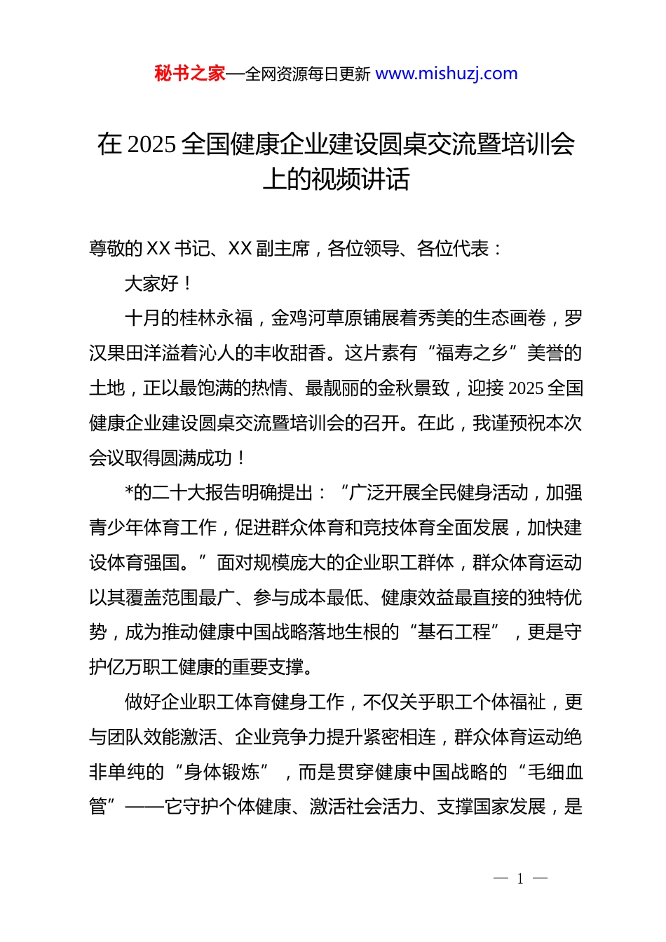 秘书之家—全网资源每日更新 www.mishuzj.com在 2025 全国健康企业建设圆桌交流暨培训会上的视频讲话尊敬的 XX 书记、XX 副主席,各位领导、各位代表:大家好!十月的桂林永福,金鸡河草原铺展着秀美的生态画卷,罗汉果田洋溢着沁人的丰收甜香。这片素有“福寿之乡”美誉的土地,正以最饱满的热情、最靓丽的金秋景致,迎接 2025 全国健康企业建设圆桌交流暨培训会的召开。在此,我谨预祝本次会议取得圆满成功!*的二十大报告明确提出:“广泛开展全民健身活动,加强青少年体育工作,促进群众体育和竞技体育全面发展,加快建设体育强国。”面对规模庞大的企业职工群体,群众体育运动以其覆盖范围最广、参与成本最低、健康效益最直接的独特优势,成为推动健康中国战略落地生根的“基石工程”,更是守护亿万职工健康的重要支撑。做好企业职工体育健身工作,不仅关乎职工个体福祉,更与团队效能激活、企业竞争力提升紧密相连,群众体育运动绝非单纯的“身体锻炼”,而是贯穿健康中国战略的“毛细血管”——它守护个体健康、激活社会活力、支撑国家发展,是— 1 —秘书之家—全网资源每日更新 www.mishuzj.com实现全民健康、建设健康中国的必由之路。其价值早已超越体育领域本身,成为国家健康治理体系中不可或缺的重要组成部分,更是推动社会和谐进步的重要力量。国家始终为企业开展全民健身工作提供有力支撑。2022 年,中央办公厅、国务院办公厅印发《关于构建更高水平的全民健身公共服务体系的意见》,2025 年国务院办公厅印发《关于释放体育消费潜力进一步推进体育产业高质量发展的意见》。一系列政策的出台,为企业体育事业发展注入了新的动能,也为职工健身权益保障筑牢了制度根基。中国企联自 2020 年开展健康中国企业行动以来,历年发布的千余项全国健康企业建设特色案例中,涉及体育健身的占比超过 70%,这充分证明职工体育健身活动已成为健康企业建设的重要组成部分,也是广大企业干部职工最喜闻乐见的健康文化形式。“十四五”期间,中国企业体育协会等单位在健康中国企业行动中开展体育专项行动,连续三年组织中国职工体质检测与科学健身万里行活动;成功举办中国职工足球、篮球、气排球、乒乓球等联赛,众多企业积极响应,前不久举办的中国中车集团运动会上,8000 名职工参加开幕式,40 个方队参加入场式,尽显企业活力,中国中车足球队更斩获 2023 世界企业运动会冠军,展现了中国职工的运动风采。如今,企业职工的— 2 —秘书之家—全网资源每日更新 www.mishuzj.com运动健身热情,已成为群众体育运动中一股广泛而坚实的力量。2026 年,我们将迎来“十五五”计划的开局之年,让我们携手并肩,以更高站位、更实举措推动企业体育工作走深走实,让体育赋能企业发展、滋养职工身心,为建设健康中国、体育强国,为实现中华民族伟大复兴的中国梦注入更加强劲的活力!谢谢大家!— 3 —
