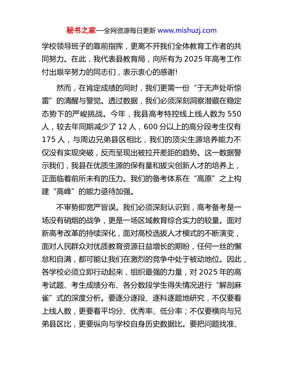 秘书之家—全网资源每日更新 www.mishuzj.com在县教育局 2026 届高考备考视导调研工作总结会上的讲话同志们:大家下午好。今天,我们在这里召开全县 2026 届高考备考视导调研工作总结会,主要任务是全面复盘前期视导调研工作,系统总结我县 2025 届高考的经验与不足,深入剖析当前备考工作中存在的突出问题,并对下一阶段 2026 届高考备考工作进行再动员、再部署、再压实。刚才,**副局长已经根据前期视导情况,对全县的备考工作作了全面、客观、精准的总结分析,既肯定了各学校的特色亮点,也毫不避讳地指出了问题短板,提出的意见建议具有很强的指导性和操作性,我完全同意。下面,结合我的思考,再讲几点意见。一、认清形势,在精准复盘中坚定备考信心与决心回顾刚刚过去的 2025 年高考,我们既要看到成绩,坚定信心,也要看到差距,正视压力。这是我们谋划 2026 届高考备考工作的逻辑起点和现实依据。从总体数据来看,2025 年,我县高考工作保持了稳健发展的基本盘。全县共有 4200 余名考生参加高考,本科上线总人数达到 2415 人,本科上线率继续保持在 57%以上,这一成绩的取得,离不开全体高三教师的辛勤耕耘,离不开各高中秘书之家—全网资源每日更新 www.mishuzj.com学校领导班子的靠前指挥,更离不开我们全体教育工作者的共同努力。在此,我代表县教育局,向所有为 2025 年高考工作付出艰辛努力的同志们,表示衷心的感谢!然而,在肯定成绩的同时,我们更需一份“于无声处听惊雷”的清醒与警觉。透过数据,我们必须深刻洞察潜藏在稳定态势下的严峻挑战。今年,我县高考特控线上线人数为 550人,较去年同期减少了 12 人,600 分以上的高分段考生仅有175 人,与周边兄弟县区相比,我们的顶尖生源培养能力不仅没有实现突破,反而呈现出被拉开差距的趋势。这一数据警示我们,我县在优质生源的保有量和拔尖创新人才的培养上,正面临着前所未有的压力。我们的备考体系在“高原”之上构建“高峰”的能力亟待加强。不审势即宽严皆误。我们必须深刻认识到,高考备考是一场没有硝烟的战争,更是一场区域教育综合实力的较量。面对新高考改革的持续深化,面对高校选拔人才模式的不断演变,面对人民群众对优质教育资源日益增长的期盼,任何一丝的懈怠和自满,都可能让我们在激烈的竞争中处于被动地位。因此,各学校必须立即行动起来,组织最强的力量,对 2025 年的高考试题、考生成绩分布、各分数段学生得失情况进行“解剖麻雀”式的深度分析。要逐分逐段、逐科逐题地研究,不仅要看上线人数,更要看平均分、优秀率、低分率;不仅要横向与兄弟县区比,更要纵向与学校自身历史数据比。要把问题找准、秘书之家—全网资源每日更新 www.mishuzj.com把根源挖深、把责任厘清,形成问题清单、任务清单、责任清单,真正做到用数据说话、用事实决策,为 2026 届的科学备考提供最精准的“导航图”和最可靠的“路线图”。二、正视问题,在深刻反思中找准备考短板与弱项为期一周的视导调研,我们深入课堂、走进教研组、翻阅资料、座谈交流,对各学校的备考工作进行了一次全面的“健康体检”。从整体上看,各学校备考工作启动早、氛围浓、措施实,但也必须承认,一些长期存在、反复出现的“老毛病”依然没有得到根治,一些影响备考质效的“新问题”也开始显现。这些问题,若不及时纠正,必将成为我们 22 个月后决胜高考的“绊脚石”。第一,备考管理的精细化程度有待提升。部分学校的备考管理仍然停留在“大水漫灌”的粗放阶段,缺乏“精准滴灌”的科学思维。一是集体备课的“形式主义”依然存在。有的备课组活动满足于定时间、定地点、定主题,但在核心环节如研究考纲、分析学情、打磨教学设计等方面投入不足,研讨不深不透,满足于流程的完成,而忽视了实质的效果。二是教学反思的“蜻蜓点水”现象较为普遍。部分教师的教学后记过于简略,满足于三言两语的简单记录,缺乏对教学得失、学生反应、策略调整的深度复盘和系统思考,教学反思未能真正成为教师专业成长的“催化剂”和教学质量提升的“发动机”。三是过秘书之家—全网资源每日更新 www.mishuzj.com程监...