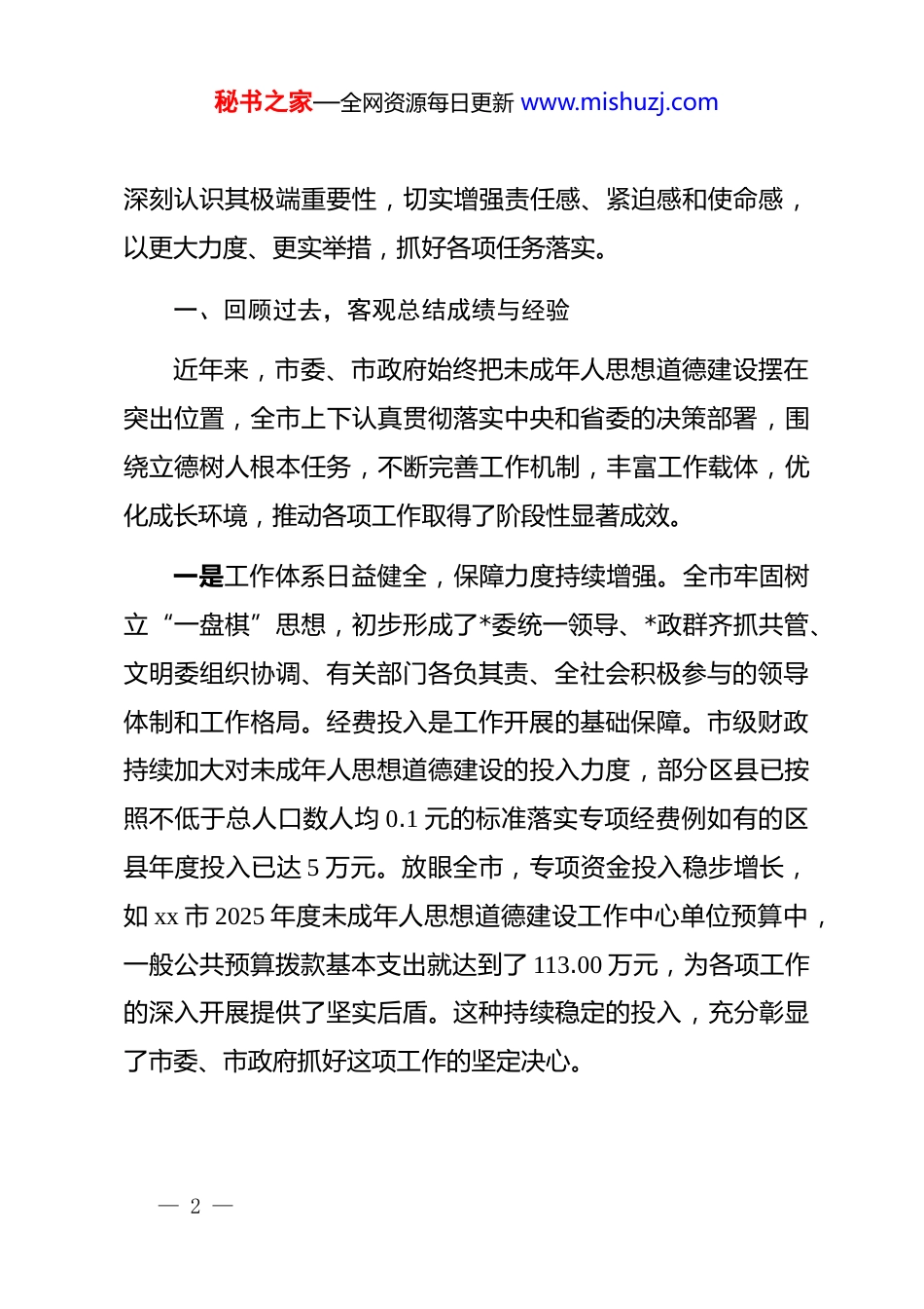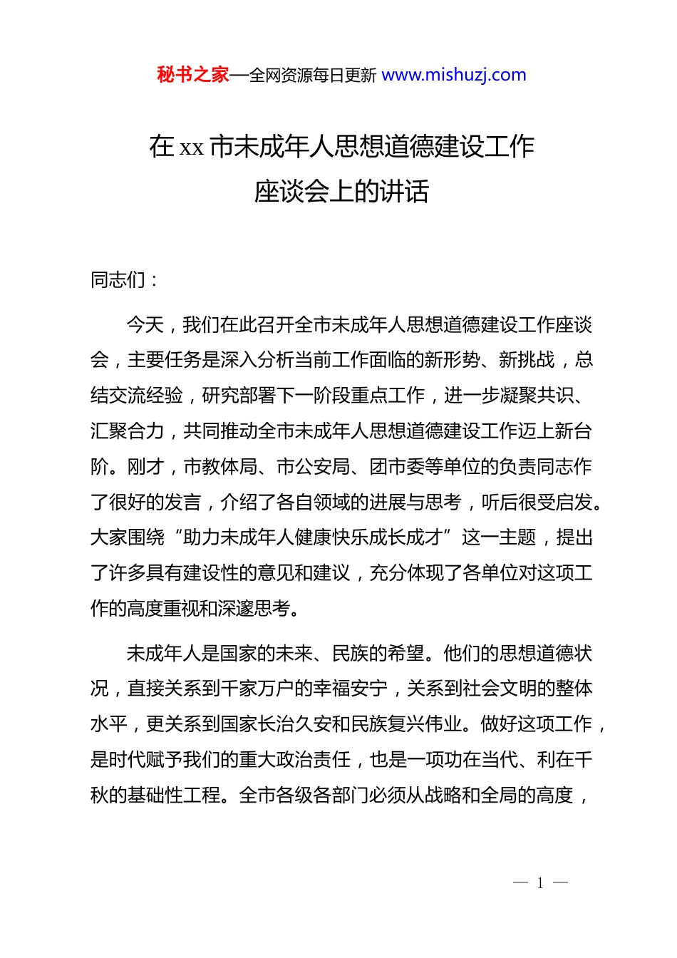 秘书之家—全网资源每日更新 www.mishuzj.com在 xx 市未成年人思想道德建设工作座谈会上的讲话同志们:今天,我们在此召开全市未成年人思想道德建设工作座谈会,主要任务是深入分析当前工作面临的新形势、新挑战,总结交流经验,研究部署下一阶段重点工作,进一步凝聚共识、汇聚合力,共同推动全市未成年人思想道德建设工作迈上新台阶。刚才,市教体局、市公安局、团市委等单位的负责同志作了很好的发言,介绍了各自领域的进展与思考,听后很受启发。大家围绕“助力未成年人健康快乐成长成才”这一主题,提出了许多具有建设性的意见和建议,充分体现了各单位对这项工作的高度重视和深邃思考。未成年人是国家的未来、民族的希望。他们的思想道德状况,直接关系到千家万户的幸福安宁,关系到社会文明的整体水平,更关系到国家长治久安和民族复兴伟业。做好这项工作,是时代赋予我们的重大政治责任,也是一项功在当代、利在千秋的基础性工程。全市各级各部门必须从战略和全局的高度,— 1 —秘书之家—全网资源每日更新 www.mishuzj.com深刻认识其极端重要性,切实增强责任感、紧迫感和使命感,以更大力度、更实举措,抓好各项任务落实。一、回顾过去,客观总结成绩与经验近年来,市委、市政府始终把未成年人思想道德建设摆在突出位置,全市上下认真贯彻落实中央和省委的决策部署,围绕立德树人根本任务,不断完善工作机制,丰富工作载体,优化成长环境,推动各项工作取得了阶段性显著成效。一是工作体系日益健全,保障力度持续增强。全市牢固树立“一盘棋”思想,初步形成了*委统一领导、*政群齐抓共管、文明委组织协调、有关部门各负其责、全社会积极参与的领导体制和工作格局。经费投入是工作开展的基础保障。市级财政持续加大对未成年人思想道德建设的投入力度,部分区县已按照不低于总人口数人均 0.1 元的标准落实专项经费例如有的区县年度投入已达 5 万元。放眼全市,专项资金投入稳步增长,如 xx 市 2025 年度未成年人思想道德建设工作中心单位预算中,一般公共预算拨款基本支出就达到了 113.00 万元,为各项工作的深入开展提供了坚实后盾。这种持续稳定的投入,充分彰显了市委、市政府抓好这项工作的坚定决心。— 2 —秘书之家—全网资源每日更新 www.mishuzj.com二是主题实践广泛开展,核心价值深入人心。各部门、各学校紧密结合重要时间节点和重大节庆纪念日,精心组织开展了形式多样、内容丰富的主题教育实践活动。例如,“扣好人生第一粒扣子”主题教育实践活动、“新时代好少年”学习宣传活动等品牌项目,在全市范围内产生了广泛而深远的影响。据不完全统计,近年来全市累计举办各类主题活动超过 7000 场,参与活动的青少年达到 200 万人次;另有数据显示,仅 2019 年以来,全市就开展了系列主题活动近 2500 场次。通过这些活动,爱国主义、集体主义、社会主义核心价值观在广大未成年人心中生根发芽。一些地区在测评中显示,中小学生对社会主义核心价值观的知晓率已达到 100%这是一个非常了不起的成绩。三是阵地建设成效显著,育人环境不断优化。各级各类阵地是开展思想道德教育的重要载体。全市大力推进文明校园创建,目前已建成市级以上文明校园 786 所这些学校在管理育人、文化育人、环境育人等方面发挥了良好的示范引领作用。同时,社会实践基地建设也得到加强。部分地区大力建设乡村学校少年宫,有的地区建成数量已超过 60 所,覆盖率达到 130%,有效解决了农村孩子课外活动场所匮乏的问题。此外,家校社协同育人网络初步构建,全市 880 所中小学的家长委员会建成率— 3 —秘书之家—全网资源每日更新 www.mishuzj.com达到 100%,为形成教育合力奠定了组织基础。这些工作的成效也得到了学生和家长的认可,有地区对项目实施的满意度调查显示,学生及家长的满意度高达 99.33%。四是创新探索亮点纷呈,工作品牌逐步树立。在工作中,各地各部门不满足于常规动作,积极探索符合新时代要求、贴近未成年人特点的新方法、新路径。涌现出了一批如“心灵交通网”等具有影响力的创新案例,获得了上级部门的肯定和表彰。这些典型经验的...