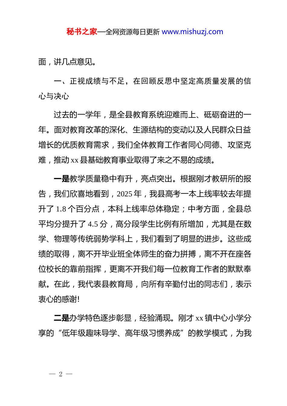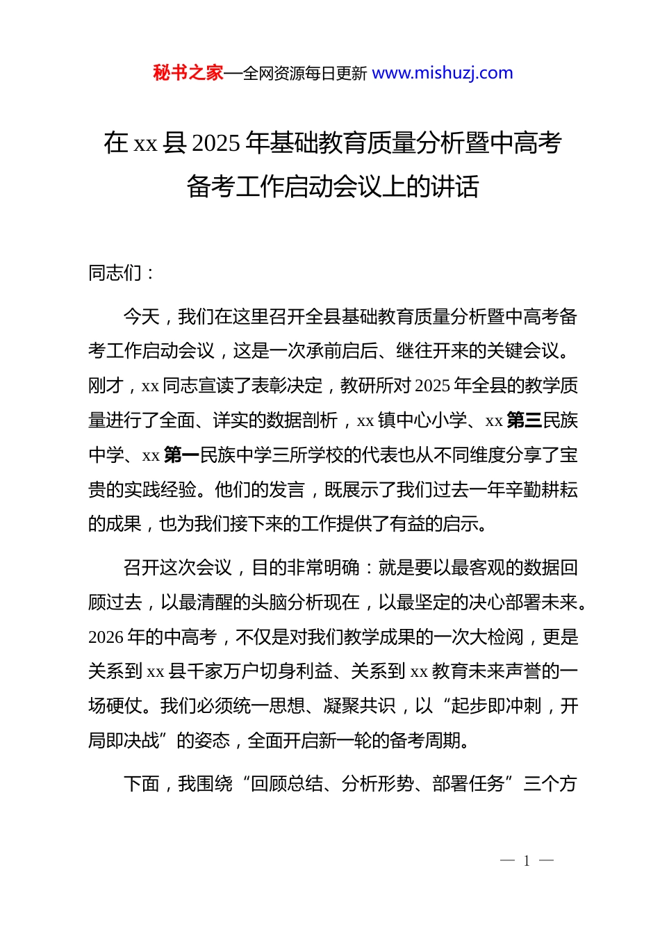 秘书之家—全网资源每日更新 www.mishuzj.com在 xx 县 2025 年基础教育质量分析暨中高考备考工作启动会议上的讲话同志们:今天,我们在这里召开全县基础教育质量分析暨中高考备考工作启动会议,这是一次承前启后、继往开来的关键会议。刚才,xx 同志宣读了表彰决定,教研所对 2025 年全县的教学质量进行了全面、详实的数据剖析,xx 镇中心小学、xx 第三民族中学、xx 第一民族中学三所学校的代表也从不同维度分享了宝贵的实践经验。他们的发言,既展示了我们过去一年辛勤耕耘的成果,也为我们接下来的工作提供了有益的启示。召开这次会议,目的非常明确:就是要以最客观的数据回顾过去,以最清醒的头脑分析现在,以最坚定的决心部署未来。2026 年的中高考,不仅是对我们教学成果的一次大检阅,更是关系到 xx 县千家万户切身利益、关系到 xx 教育未来声誉的一场硬仗。我们必须统一思想、凝聚共识,以“起步即冲刺,开局即决战”的姿态,全面开启新一轮的备考周期。下面,我围绕“回顾总结、分析形势、部署任务”三个方— 1 —秘书之家—全网资源每日更新 www.mishuzj.com面,讲几点意见。一、正视成绩与不足,在回顾反思中坚定高质量发展的信心与决心过去的一学年,是全县教育系统迎难而上、砥砺奋进的一年。面对教育改革的深化、生源结构的变动以及人民群众日益增长的优质教育需求,我们全体教育工作者同心同德、攻坚克难,推动 xx 县基础教育事业取得了来之不易的成绩。一是教学质量稳中有升,亮点突出。根据刚才教研所的报告,我们欣喜地看到,2025 年,我县高考一本上线率较去年提升了 1.8 个百分点,本科上线率总体稳定;中考方面,全县总平均分提升了 4.5 分,高分段学生比例有所增加,尤其是在数学、物理等传统弱势学科上,我们看到了明显的进步。这些成绩的取得,离不开毕业班全体师生的奋力拼搏,离不开在座各位校长的靠前指挥,更离不开我们每一位教育工作者的默默奉献。在此,我代表县教育局,向所有辛勤付出的同志们,表示衷心的感谢!二是办学特色逐步彰显,经验涌现。刚才 xx 镇中心小学分享的“低年级趣味导学、高年级习惯养成”的教学模式,为我— 2 —秘书之家—全网资源每日更新 www.mishuzj.com们夯实小学教育基础提供了范本。xx 第三民族中学通过“网格化管理、清单式督导”提升学校治理效能的经验,为全县学校的精细化管理提供了镜鉴。xx 第一民族中学在高考备考中“目标分层、过程监控、心理疏导”三位一体的策略,展现了我们龙头学校的担当与智慧。这些先进典型,是我们 xx 教育的宝贵财富,大家要认真学习、积极借鉴。三是队伍建设和硬件改善得到加强。过去一年,我们组织了多轮次、多层级的教师培训,教育信息化 2.0 建设稳步推进,特别是县委、县政府高度重视,全力支持的 xx 第一民族中学迁建项目前期工作已经启动,这都为我们教育事业的长远发展注入了强大动力。在肯定成绩的同时,我们更要用“放大镜”和“显微镜”来审视存在的问题。教研所的报告,用一组组冰冷但客观的数据,为我们敲响了警钟。我们必须清醒地认识到:第一,教育发展不平衡不充分的问题依然突出。从城乡来看,城区学校与乡镇学校的平均分差距依然存在,部分边远乡镇学校的教学质量亟待提升。从校际来看,同一区域内学校之间的“头部”与“尾部”差距明显,优质教育资源尚未实现有效共享。从学科来看,部分学科,特别是英语、物理等,平均— 3 —秘书之家—全网资源每日更新 www.mishuzj.com分、及格率仍低于州级平均水平,成为了拉低我们整体成绩的“短板”。第二,课堂教学效益有待进一步提高。部分教师的教学理念陈旧,仍然停留在“满堂灌”、“题海战”的传统模式上,未能有效激发学生的学习兴趣和主动性。“45 分钟”的黄金时间利用率不高,课堂的“抬头率”、“点头率”不尽如人意。备课环节的形式主义依然存在,集体备课的深度和实效性有待加强。第三,教师队伍的专业能力与新时代要求存在差距。一些教师的知识结构老化,对新课程标准、新教材、新高考改革的研究不深不透。培训的针对性和实效性不强,“大锅饭”式的培训多,量身定...