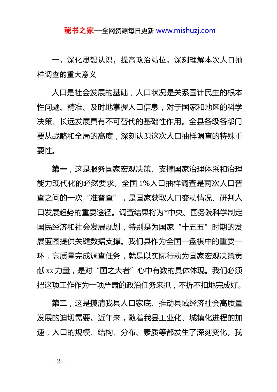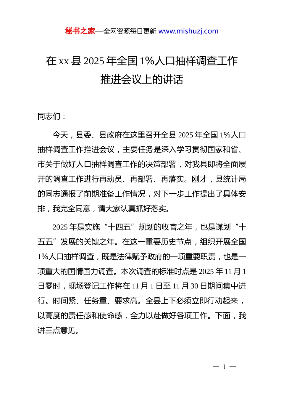 秘书之家—全网资源每日更新 www.mishuzj.com在 xx 县 2025 年全国 1%人口抽样调查工作推进会议上的讲话同志们:今天,县委、县政府在这里召开全县 2025 年全国 1%人口抽样调查工作推进会议,主要任务是深入学习贯彻国家和省、市关于做好人口抽样调查工作的决策部署,对我县即将全面展开的调查工作进行再动员、再部署、再落实。刚才,县统计局的同志通报了前期准备工作情况,对下一步工作提出了具体安排,我完全同意,请大家认真抓好落实。2025 年是实施“十四五”规划的收官之年,也是谋划“十五五”发展的关键之年。在这一重要历史节点,组织开展全国1%人口抽样调查,既是法律赋予政府的一项重要职责,也是一项重大的国情国力调查。本次调查的标准时点是 2025 年 11 月 1日零时,现场登记工作将在 11 月 1 日至 11 月 30 日期间集中进行。时间紧、任务重、要求高。全县上下必须立即行动起来,以高度的责任感和使命感,全力以赴做好各项工作。下面,我讲三点意见。— 1 —秘书之家—全网资源每日更新 www.mishuzj.com一、深化思想认识,提高政治站位,深刻理解本次人口抽样调查的重大意义人口是社会发展的基础,人口状况是关系国计民生的根本性问题。精准、及时地掌握人口信息,对于国家和地区的科学决策、长远发展具有不可替代的基础性作用。全县各级各部门要从战略和全局的高度,深刻认识这次人口抽样调查的特殊重要性。第一,这是服务国家宏观决策、支撑国家治理体系和治理能力现代化的必然要求。全国 1%人口抽样调查是两次人口普查之间的一次“准普查”,是国家获取人口变动情况、研判人口发展趋势的重要途径。调查结果将为*中央、国务院科学制定国民经济和社会发展规划,特别是为国家“十五五”时期的发展蓝图提供关键数据支撑。我们县作为全国一盘棋中的重要一环,高质量完成调查任务,就是以实际行动为国家宏观决策贡献 xx 力量,是对“国之大者”心中有数的具体体现。我们必须把这项工作作为一项严肃的政治任务来抓,不折不扣地完成好。第二,这是摸清我县人口家底、推动县域经济社会高质量发展的迫切需要。近年来,随着我县工业化、城镇化进程的加速,人口的规模、结构、分布、素质等都发生了深刻变化。我— 2 —秘书之家—全网资源每日更新 www.mishuzj.com们的人口总量有多少?年龄结构是“年轻化”还是“老龄化”?劳动力资源是否充裕?人才结构能否支撑我们的产业转型升级?群众的居住条件改善了多少?这些问题,直接关系到我县教育、医疗、养老、就业等公共服务的资源配置,关系到城乡基础设施的规划建设,关系到我们招商引资和产业布局的科学性。通过这次调查,我们可以精准获取翔实的数据,为我县科学编制“十五五”发展规划、优化公共服务供给、完善人口发展战略提供坚实依据。可以说,查清人口“家底”,才能更好地规划xx 的“未来”。第三,这是检验我们干部队伍执行力、提升基层社会治理能力的一次实战练兵。人口抽样调查涉及面广、组织环节多、技术要求高、群众工作复杂,是对我们组织动员能力、部门协作能力、依法行政能力和群众工作能力的一次全面检验。调查工作需要深入千家万户,与群众面对面交流,这正是我们干部深入基层、了解民情、服务群众的宝贵机会。做得好,不仅能收获准确的调查数据,更能密切*群干群关系,夯实基层治理基础。我们必须把这次调查作为提升干部队伍能力素质的“练兵场”和“试金石”,在攻坚克难中展现新担当、新作为。二、聚焦关键环节,严格执行标准,高质高效完成调查各— 3 —秘书之家—全网资源每日更新 www.mishuzj.com项核心任务本次人口抽样调查工作,专业性、技术性、规范性都很强。我们必须严格按照国家统一的调查方案和工作要求,一丝不苟、精益求精地抓好每一个环节,确保调查工作经得起历史和人民的检验。第一,要精准把握时间节点,环环相扣推进工作。整个调查工作分为准备、登记、数据处理和总结发布等多个阶段,环环相扣,压茬进行。当前,我们正处在从准备阶段向登记阶段过渡的关键时期。从今天会议开始,到 10 月底,是最后的冲刺准备阶段。各乡镇(街道)、各有关部门要抓紧...