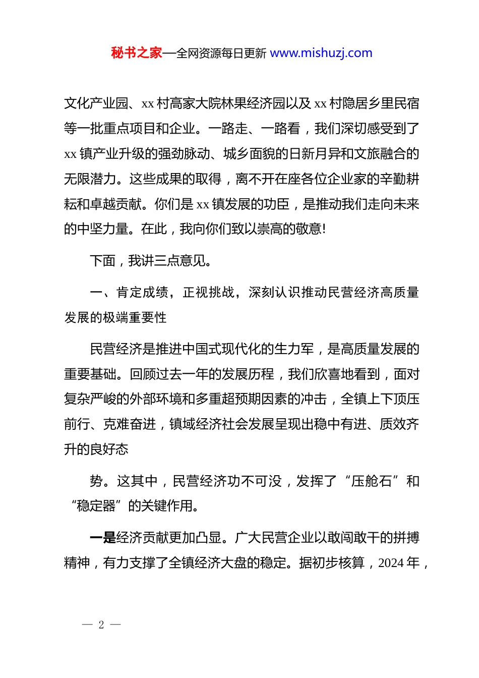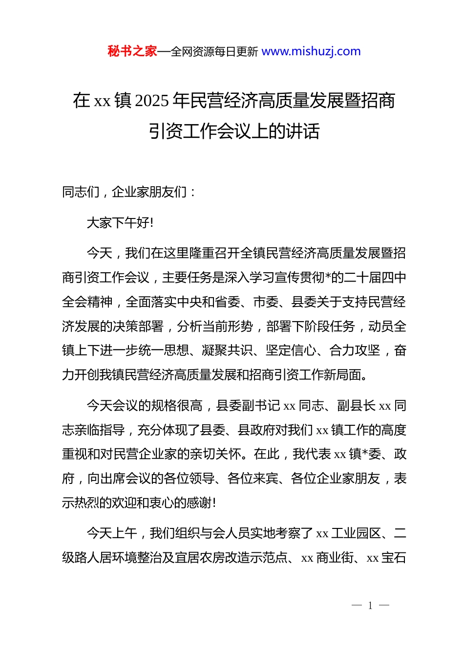 秘书之家—全网资源每日更新 www.mishuzj.com在 xx 镇 2025 年民营经济高质量发展暨招商引资工作会议上的讲话同志们,企业家朋友们:大家下午好!今天,我们在这里隆重召开全镇民营经济高质量发展暨招商引资工作会议,主要任务是深入学习宣传贯彻*的二十届四中全会精神,全面落实中央和省委、市委、县委关于支持民营经济发展的决策部署,分析当前形势,部署下阶段任务,动员全镇上下进一步统一思想、凝聚共识、坚定信心、合力攻坚,奋力开创我镇民营经济高质量发展和招商引资工作新局面。今天会议的规格很高,县委副书记 xx 同志、副县长 xx 同志亲临指导,充分体现了县委、县政府对我们 xx 镇工作的高度重视和对民营企业家的亲切关怀。在此,我代表 xx 镇*委、政府,向出席会议的各位领导、各位来宾、各位企业家朋友,表示热烈的欢迎和衷心的感谢!今天上午,我们组织与会人员实地考察了 xx 工业园区、二级路人居环境整治及宜居农房改造示范点、xx 商业街、xx 宝石— 1 —秘书之家—全网资源每日更新 www.mishuzj.com文化产业园、xx 村高家大院林果经济园以及 xx 村隐居乡里民宿等一批重点项目和企业。一路走、一路看,我们深切感受到了xx 镇产业升级的强劲脉动、城乡面貌的日新月异和文旅融合的无限潜力。这些成果的取得,离不开在座各位企业家的辛勤耕耘和卓越贡献。你们是 xx 镇发展的功臣,是推动我们走向未来的中坚力量。在此,我向你们致以崇高的敬意!下面,我讲三点意见。一、肯定成绩,正视挑战,深刻认识推动民营经济高质量发展的极端重要性民营经济是推进中国式现代化的生力军,是高质量发展的重要基础。回顾过去一年的发展历程,我们欣喜地看到,面对复杂严峻的外部环境和多重超预期因素的冲击,全镇上下顶压前行、克难奋进,镇域经济社会发展呈现出稳中有进、质效齐升的良好态势。这其中,民营经济功不可没,发挥了“压舱石”和“稳定器”的关键作用。一是经济贡献更加凸显。广大民营企业以敢闯敢干的拼搏精神,有力支撑了全镇经济大盘的稳定。据初步核算,2024 年,— 2 —秘书之家—全网资源每日更新 www.mishuzj.com全镇民营经济增加值达到 52.6 亿元,同比增长 8.5%,占全镇地区生产总值的比重超过 65%,展现出强大的韧性和活力。民营经济贡献的税收占全部税收收入的比重超过 70%,提供的城镇新增就业岗位占全镇总量的 85%以上。可以说,民营经济已经成为我们 xx 镇经济增长的主引擎、财政收入的主来源、社会就业的主渠道。二是产业结构更趋优化。我们欣喜地看到,民营经济的内涵正在发生深刻变化。在第一产业,以 xx 村林果经济为代表的现代农业企业,正在从传统种养向精深加工、品牌营销和农旅融合延伸,效益倍增。在第二产业,xx 工业园区内的民营企业,正加速技术改造和数字化转型,一批“专精特新”企业崭露头角,成为制造业的“硬核”支撑。在第三产业,以 xx 商业街、xx 宝石文化产业园、xx 民宿为代表的新业态蓬勃兴起,文旅康养、商贸物流等现代服务业已经成为拉动经济增长的新引擎。三次产业中民营经济的协同并进,为我们构建现代化产业体系奠定了坚实基础。三是发展活力更被激发。一批有远见、有担当的民营企业家,坚守主业、深耕实业,积极履行社会责任,在稳岗就业、乡村振兴、公益慈善等方面作出了重要贡献,赢得了社会各界— 3 —秘书之家—全网资源每日更新 www.mishuzj.com的广泛赞誉。今天会议现场签约的 6 个重大项目,总投资额高达 10.87 亿元,更是为我镇未来的发展注入了强劲动力。这些都充分证明,xx 镇的民营经济发展环境是优良的,发展前景是广阔的,企业家们在这里投资兴业,是大有可为的。在肯定成绩的同时,我们也要清醒地认识到,当前我镇民营经济发展仍面临不少挑战。从外部看,市场竞争日趋激烈,产业链供应链仍存在不稳定因素。从内部看,部分企业创新能力有待加强,高端人才、关键技术仍然短缺;产业层次总体不高,龙头企业、链主企业偏少;要素保障仍然存在瓶颈,企业在融资、用地等方面还面临一些实际困难。这些问题,既是我们下一步工作中需要着力破解的难题,也是我们...