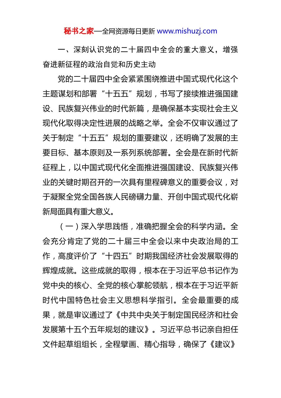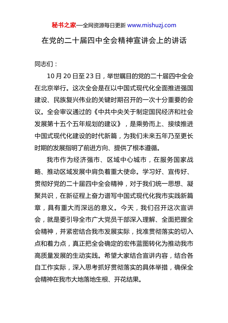 秘书之家—全网资源每日更新 www.mishuzj.com在党的二十届四中全会精神宣讲会上的讲话 同志们:10 月 20 日至 23 日,举世瞩目的党的二十届四中全会在北京举行。这次全会是在以中国式现代化全面推进强国建设、民族复兴伟业的关键时期召开的一次十分重要的会议。全会审议通过的《中共中央关于制定国民经济和社会发展第十五个五年规划的建议》,是乘势而上、接续推进中国式现代化建设的时代新篇,为我们未来五年乃至更长时期的发展指明了前进方向、提供了根本遵循。我市作为经济强市、区域中心城市,在服务国家战略、推动区域发展中肩负着重大使命。学习好、宣传好、贯彻好党的二十届四中全会精神,对于我们统一思想、凝聚共识,在新征程上奋力谱写中国式现代化我市实践新篇章,具有重大而深远的意义。今天,我们召开这次宣讲会,就是要引导全市广大党员干部深入理解、全面把握全会精神,并紧密结合我市发展实际,找准贯彻落实的切入点和着力点,真正把全会确定的宏伟蓝图转化为推动我市高质量发展的生动实践。希望大家结合宣讲内容,结合各自工作实际,深入思考抓好贯彻落实的具体举措,确保全会精神在我市大地落地生根、开花结果。秘书之家—全网资源每日更新 www.mishuzj.com一、深刻认识党的二十届四中全会的重大意义,增强奋进新征程的政治自觉和历史主动党的二十届四中全会紧紧围绕推进中国式现代化这个主题谋划和部署“十五五”规划,书写了接续推进强国建设、民族复兴伟业的时代新篇,是确保基本实现社会主义现代化取得决定性进展的战略之举。全会不仅审议通过了关于制定“十五五”规划的重要建议,还明确了发展的主要目标、基本原则及一系列系统部署。全会是在新时代新征程上,以中国式现代化全面推进强国建设、民族复兴伟业的关键时期召开的一次具有里程碑意义的重要会议,对于凝聚全党全国各族人民磅礴力量、开创中国式现代化崭新局面具有重大意义。(一)深入学思践悟,准确把握全会的科学内涵。全会充分肯定了党的二十届三中全会以来中央政治局的工作,高度评价了“十四五”时期我国经济社会发展取得的辉煌成就。这些成就的取得,根本在于习近平总书记作为党中央的核心、全党的核心掌舵领航,根本在于习近平新时代中国特色社会主义思想科学指引。全会最重要的成果,就是审议通过了《中共中央关于制定国民经济和社会发展第十五个五年规划的建议》。习近平总书记亲自担任文件起草组组长,全程擘画、精心指导,确保了《建议》秘书之家—全网资源每日更新 www.mishuzj.com的起草过程充分发扬民主、集思广益,集中了党内外智慧,凝聚了最广泛的发展共识。《建议》提出的一系列新思想、新观点、新部署,特别是关于“必须把因地制宜发展新质生产力摆在更加突出的战略位置”、“坚持以人民为中心的发展思想”、“统筹发展和安全”等重要论述,为我市在新发展阶段推动高质量发展、建设新时代社会主义现代化经济强市提供了行动指南。当前,我市正处于新旧动能转换的攻坚期、城市能级提升的关键期、高质量发展的机遇期。全会精神为我们破解发展难题、激发发展活力、厚植发展优势指明了路径。我们必须深刻认识到,贯彻落实全会精神,是我市践行“两个维护”、服务国家战略的必然要求,是推动经济强市高质量发展、提升城市综合竞争力的迫切需要,也是不断满足人民群众对美好生活向往的根本途径。(二)坚持历史主动,在新征程上续写“两大奇迹”新篇章。科学制定和接续实施五年规划,是我们党治国理政的重要经验和显著优势。全会深刻洞察世界之变、时代之变、历史之变,强调必须把发展新质生产力摆在更加突出的战略位置,这对于我市这样一座正致力于打造科创我市、智造我市的城市而言,既是重大机遇,也是重大责任。我市拥有国家新一代人工智能创新发展试验区、国家秘书之家—全网资源每日更新 www.mishuzj.com量子科技研发中心等重大创新平台,在量子科技、人工智能、生物医药、空天信息等领域具备一定的先发优势。我们要深刻领会全会精神,将发展新质生产力作为推动高质量发展的首要任务和关键抓手,充分发挥科教资源富集、产业基础雄厚的优势,在科技创新引领、现代化产...