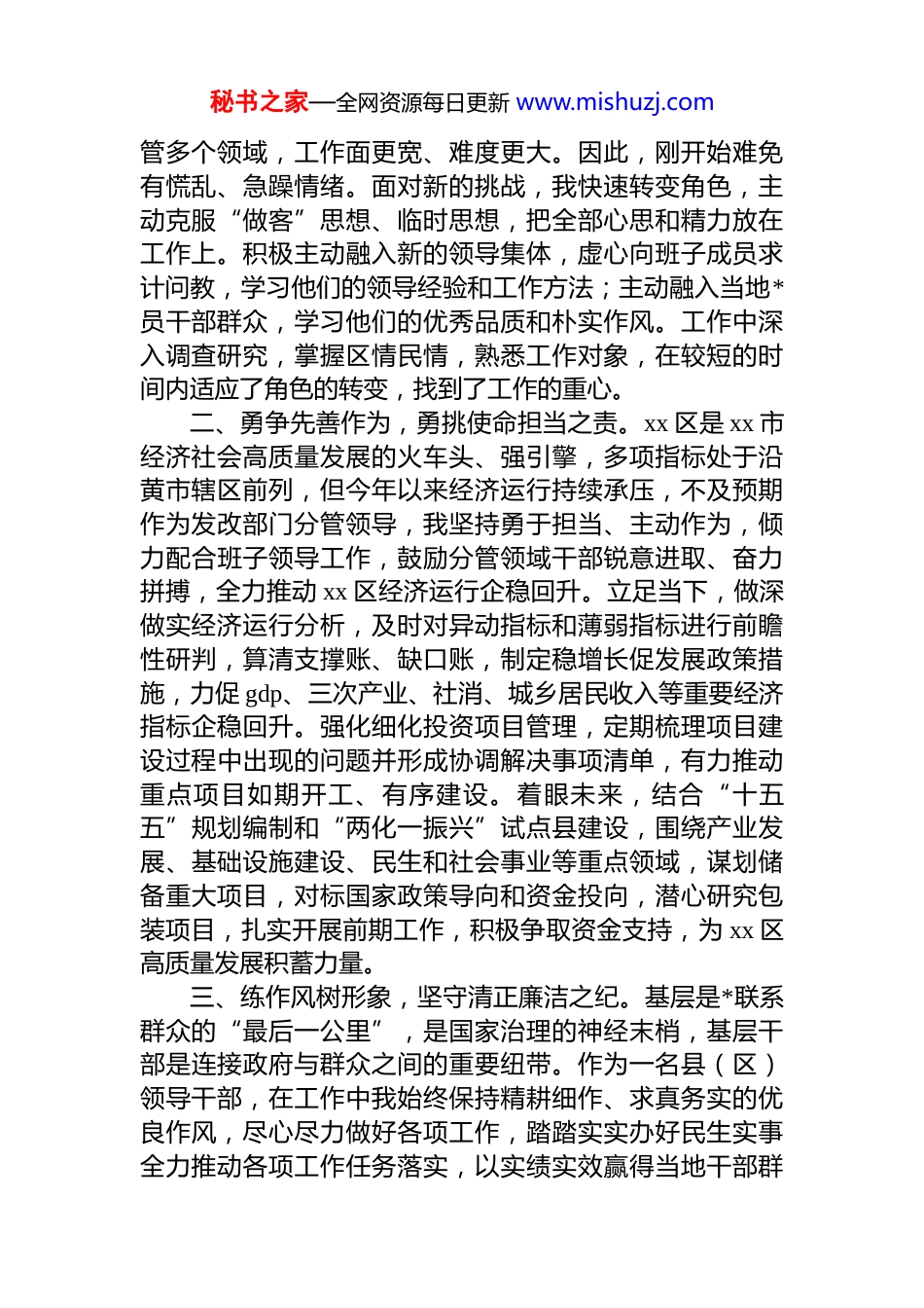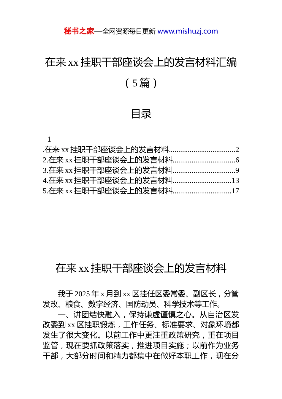 秘书之家—全网资源每日更新 www.mishuzj.com在来 xx 挂职干部座谈会上的发言材料汇编(5 篇)目录1.在来 xx 挂职干部座谈会上的发言材料...................................22.在来 xx 挂职干部座谈会上的发言材料.................................63.在来 xx 挂职干部座谈会上的发言材料.................................94.在来 xx 挂职干部座谈会上的发言材料...............................135.在来 xx 挂职干部座谈会上的发言材料...............................17在来 xx 挂职干部座谈会上的发言材料我于 2025 年 x 月到 xx 区挂任区委常委、副区长,分管发改、粮食、数字经济、国防动员、科学技术等工作。一、讲团结快融入,保持谦虚谨慎之心。从自治区发改委到 xx 区挂职锻炼,工作任务、标准要求、对象环境都发生了很大变化。以前工作中更注重政策研究,重在项目监管,现在要抓政策落实,推进项目实施;以前作为业务干部,大部分时间和精力都集中在做好本职工作,现在分秘书之家—全网资源每日更新 www.mishuzj.com管多个领域,工作面更宽、难度更大。因此,刚开始难免有慌乱、急躁情绪。面对新的挑战,我快速转变角色,主动克服“做客”思想、临时思想,把全部心思和精力放在工作上。积极主动融入新的领导集体,虚心向班子成员求计问教,学习他们的领导经验和工作方法;主动融入当地*员干部群众,学习他们的优秀品质和朴实作风。工作中深入调查研究,掌握区情民情,熟悉工作对象,在较短的时间内适应了角色的转变,找到了工作的重心。二、勇争先善作为,勇挑使命担当之责。xx 区是 xx 市经济社会高质量发展的火车头、强引擎,多项指标处于沿黄市辖区前列,但今年以来经济运行持续承压,不及预期作为发改部门分管领导,我坚持勇于担当、主动作为,倾力配合班子领导工作,鼓励分管领域干部锐意进取、奋力拼搏,全力推动 xx 区经济运行企稳回升。立足当下,做深做实经济运行分析,及时对异动指标和薄弱指标进行前瞻性研判,算清支撑账、缺口账,制定稳增长促发展政策措施,力促 gdp、三次产业、社消、城乡居民收入等重要经济指标企稳回升。强化细化投资项目管理,定期梳理项目建设过程中出现的问题并形成协调解决事项清单,有力推动重点项目如期开工、有序建设。着眼未来,结合“十五五”规划编制和“两化一振兴”试点县建设,围绕产业发展、基础设施建设、民生和社会事业等重点领域,谋划储备重大项目,对标国家政策导向和资金投向,潜心研究包装项目,扎实开展前期工作,积极争取资金支持,为 xx 区高质量发展积蓄力量。三、练作风树形象,坚守清正廉洁之纪。基层是*联系群众的“最后一公里”,是国家治理的神经末梢,基层干部是连接政府与群众之间的重要纽带。作为一名县(区)领导干部,在工作中我始终保持精耕细作、求真务实的优良作风,尽心尽力做好各项工作,踏踏实实办好民生实事全力推动各项工作任务落实,以实绩实效赢得当地干部群秘书之家—全网资源每日更新 www.mishuzj.com众的信任和支持。在生活中我自觉接受干部群众监督,严格落实中央八项规定及其实施细则精神,衣食住行方面从严从简,主动克服困难,不提特殊要求,不添额外麻烦,挂职期间坚决做到既练本领也炼作风。一年的挂职期非常短暂,在接下来的半年里,我将继续保持时不我待、只争朝夕的精神,努力在有限的时间内为 xx 区经济社会高质量发展贡献应有之力。一是常怀进取之心,知恩感恩。到县(区)挂职锻炼,寄托了组织对我的鞭策、鼓励,也意味着组织赋予我沉甸甸的责任。我将把感恩之情内化于心、外化于行,加倍珍惜这次增长阅历、开拓视野、提升本领的大好机会,在新的岗位上安下心、扎下根、沉下身,始终保持奋发有为、永不懈怠的精神状态,把民事当家事,深刻感悟服务群众的小事中蕴含的治国理政大学问,用智慧汗水推动事业发展,以实际行动践行初心使命。二是常怀担当之心,知责明责。身到情也到,全心全意服务一方百姓是对挂职干部的基本要求。我将结合发改部门工作经验,发挥自己的专业优势和特长,把中央精神上级要求与当地实际结合起来,谋划争...