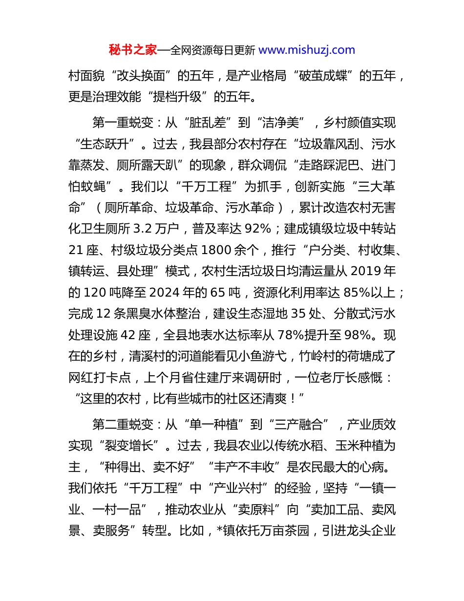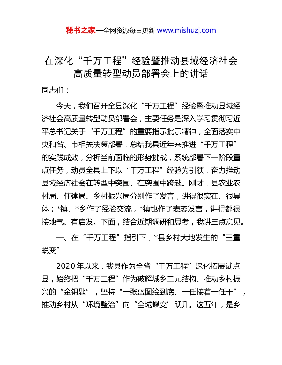 秘书之家—全网资源每日更新 www.mishuzj.com在深化“千万工程”经验暨推动县域经济社会高质量转型动员部署会上的讲话同志们:今天,我们召开全县深化“千万工程”经验暨推动县域经济社会高质量转型动员部署会,主要任务是深入学习贯彻习近平总书记关于“千万工程”的重要指示批示精神,全面落实中央和省、市相关决策部署,总结我县近年来推进“千万工程”的实践成效,分析当前面临的形势挑战,系统部署下一阶段重点任务,动员全县上下以“千万工程”经验为引领,奋力推动县域经济社会在转型中突围、在突围中跨越。刚才,县农业农村局、住建局、乡村振兴局分别作了发言,讲得很实在、很具体;*镇、*乡作了经验交流,*镇也作了表态发言,讲得都很接地气、有启发。下面,结合近期调研和思考,我讲三点意见。一、在“千万工程”指引下,*县乡村大地发生的“三重蜕变”2020 年以来,我县作为全省“千万工程”深化拓展试点县,始终把“千万工程”作为破解城乡二元结构、推动乡村振兴的“金钥匙”,坚持“一张蓝图绘到底、一任接着一任干”,推动乡村从“环境整治”向“全域蝶变”跃升。这五年,是乡秘书之家—全网资源每日更新 www.mishuzj.com村面貌“改头换面”的五年,是产业格局“破茧成蝶”的五年,更是治理效能“提档升级”的五年。第一重蜕变:从“脏乱差”到“洁净美”,乡村颜值实现“生态跃升”。过去,我县部分农村存在“垃圾靠风刮、污水靠蒸发、厕所露天趴”的现象,群众调侃“走路踩泥巴、进门怕蚊蝇”。我们以“千万工程”为抓手,创新实施“三大革命”(厕所革命、垃圾革命、污水革命),累计改造农村无害化卫生厕所 3.2 万户,普及率达 92%;建成镇级垃圾中转站21 座、村级垃圾分类点 1800 余个,推行“户分类、村收集、镇转运、县处理”模式,农村生活垃圾日均清运量从 2019 年的 120 吨降至 2024 年的 65 吨,资源化利用率达 85%以上;完成 12 条黑臭水体整治,建设生态湿地 35 处、分散式污水处理设施 42 座,全县地表水达标率从 78%提升至 98%。现在的乡村,清溪村的河道能看见小鱼游弋,竹岭村的荷塘成了网红打卡点,上个月省住建厅来调研时,一位老厅长感慨:“这里的农村,比有些城市的社区还清爽!”第二重蜕变:从“单一种植”到“三产融合”,产业质效实现“裂变增长”。过去,我县农业以传统水稻、玉米种植为主,“种得出、卖不好”“丰产不丰收”是农民最大的心病。我们依托“千万工程”中“产业兴村”的经验,坚持“一镇一业、一村一品”,推动农业从“卖原料”向“卖加工品、卖风景、卖服务”转型。比如,*镇依托万亩茶园,引进龙头企业秘书之家—全网资源每日更新 www.mishuzj.com建设标准化加工厂,开发茶饼、茶膏、茶文创等 12 类产品,茶叶附加值提升 3 倍,带动周边 5 个村集体年增收超 200 万元;*乡把竹编传统工艺与文旅结合,打造“竹艺小镇”,开发竹编灯具、竹编家具等特色商品,去年通过电商平台销售额突破 8000 万元,吸引 300 多名外出务工人员返乡创业 。2024 年,全县农产品加工转化率达 68%,乡村旅游接待游客 420 万人次,实现旅游综合收入 28 亿元,较 2019 年分别增长 45%和 62%。第三重蜕变:从“管理型”到“共富型”,基层治理实现“效能跃升”。过去,农村“干部干、群众看”“事不关己高高挂起”的现象比较普遍,矛盾纠纷调解难、公共事务参与难是基层治理的痛点。我们以“千万工程”中“共建共享”的理念为引领,创新推行“村民说事”“积分制管理”“乡贤参事会”等机制,让群众从“旁观者”变成“主人翁”。比如,*村建立“积分超市”,村民参与环境卫生、矛盾调解、志愿服务可以赚积分,兑换生活用品或技能培训课程,去年全村参与积分活动达 2000 余人次,矛盾纠纷同比下降 60%;*社区成立“乡贤议事厅”,30 多名在外企业家、教师、医生定期回村,累计捐资 200 余万元用于修路、建卫生室、设立教育基金,村里的小学也升级成了“乡村复兴少年宫”。现在,群众常说:“村里的事,咱们自己商量着办,办好了大家都受益!”秘书之家—全网资源每日更新 www.mishuzj.c...