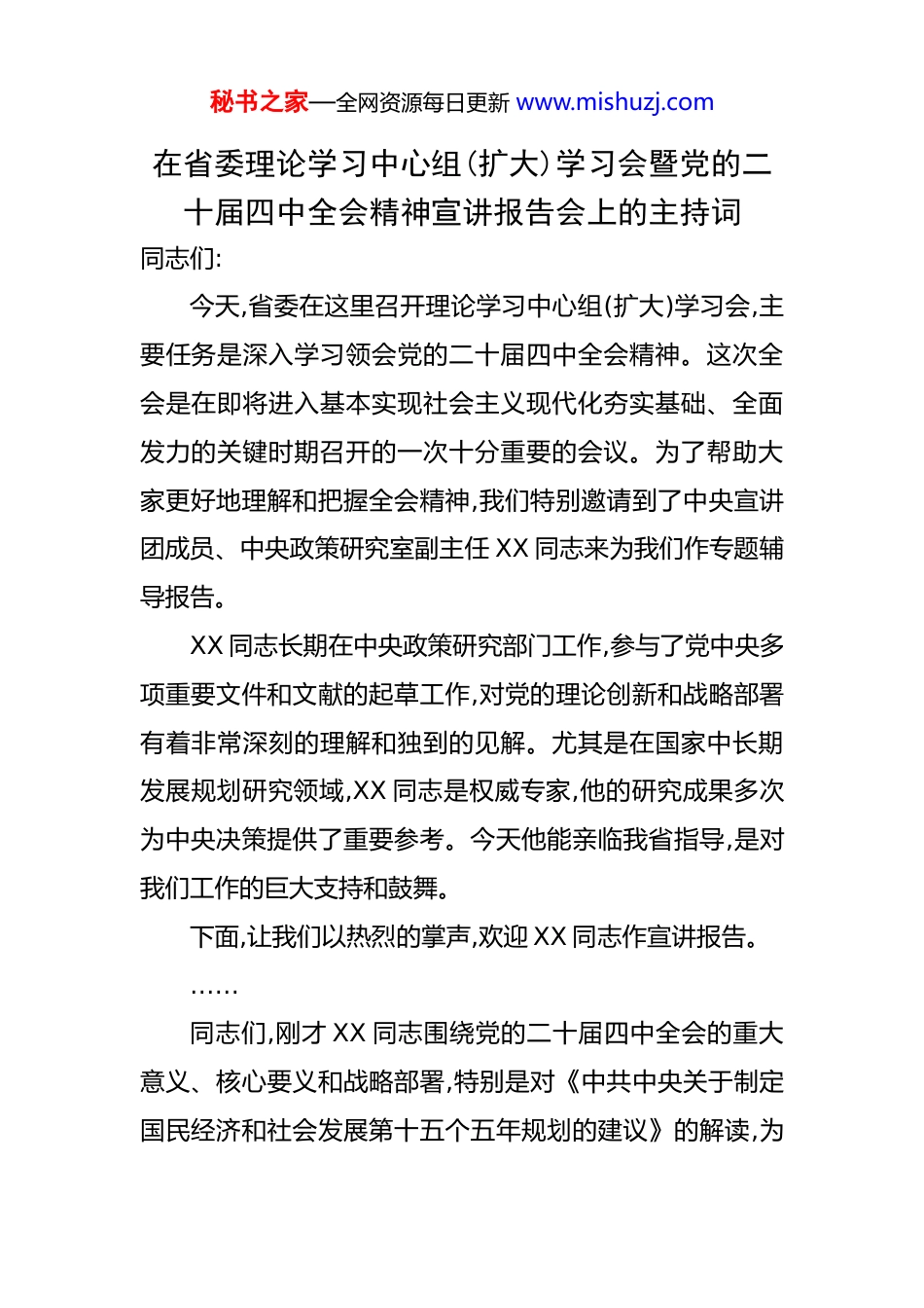 秘书之家—全网资源每日更新 www.mishuzj.com在省委理论学习中心组(扩大)学习会暨党的二十届四中全会精神宣讲报告会上的主持词 同志们:今天,省委在这里召开理论学习中心组(扩大)学习会,主要任务是深入学习领会党的二十届四中全会精神。这次全会是在即将进入基本实现社会主义现代化夯实基础、全面发力的关键时期召开的一次十分重要的会议。为了帮助大家更好地理解和把握全会精神,我们特别邀请到了中央宣讲团成员、中央政策研究室副主任 XX 同志来为我们作专题辅导报告。XX 同志长期在中央政策研究部门工作,参与了党中央多项重要文件和文献的起草工作,对党的理论创新和战略部署有着非常深刻的理解和独到的见解。尤其是在国家中长期发展规划研究领域,XX 同志是权威专家,他的研究成果多次为中央决策提供了重要参考。今天他能亲临我省指导,是对我们工作的巨大支持和鼓舞。下面,让我们以热烈的掌声,欢迎 XX 同志作宣讲报告。…… 同志们,刚才 XX 同志围绕党的二十届四中全会的重大意义、核心要义和战略部署,特别是对《中共中央关于制定国民经济和社会发展第十五个五年规划的建议》的解读,为秘书之家—全网资源每日更新 www.mishuzj.com我们作了一场站位高远、内涵丰富、思想深刻的精彩报告。报告系统全面、重点突出、深入浅出,具有很强的政治性、理论性和指导性,让我们对全会精神有了更为全面的认识和更加深刻的把握。在此,我代表省委,向 XX 同志表示衷心的感谢!学习好、宣传好、贯彻好党的二十届四中全会精神,是当前和今后一个时期全省上下的首要政治任务。习近平总书记指出,学习贯彻党的创新理论,“要坚持读原著、学原文、悟原理,强读强记,常学常新,往深里走、往实里走、往心”里走 。全省各级党组织和广大党员干部要以此次宣讲报告会为契机,迅速掀起学习宣传贯彻热潮。下面,我讲三点意见。第一,必须在深学笃行中统一思想,切实增强贯彻落实的政治自觉。“”全省各级领导干部要发挥 关键少数 的示范带动作用,带头学习、带头思考、带头贯彻。要把学习全会精神与学习习近平新时代中国特色社会主义思想,特别是习近平总书记视察 XX 重要讲话精神贯通起来,深刻领会党中央关于未来五年乃至更长时期我国发展的战略考量。各级党委(党组)理论学习中心组要第一时间组织专题学习研讨,确保学深悟透、融会贯通,真正把思想和行动统一到党中央的秘书之家—全网资源每日更新 www.mishuzj.com决策部署上来,“”“坚定拥护 两个确立 、坚决做到 两个维”护 。第二,必须在对标对表中谋划发展,奋力谱写 XX 现代化建设新篇章。“”党的二十届四中全会擘画了 十五五 时期的发展蓝图。全省上下要紧密结合 XX 实际,找准贯彻落实的切入点和着力点。发展改革部门要牵头,“抓紧对我省 十五”五 规划《纲要》的编制工作进行再审视、再深化,确保与中央《建议》精神精准对表。各地各部门要围绕全会提出的新质生产力发展、区域协调发展、全面深化改革、推进高水平对外开放等重大任务,逐条梳理、逐项研究,形成一批具有 XX 特色、可操作性强的重大项目、重大平台、重大政策,“”切实将全会的 作战图 转化为 XX“高质量发展的 施工”图 。第三,必须在真抓实干中彰显担当,确保全会精神在 XX落地生根。一分部署,九分落实。学习贯彻全会精神,最终要体现在推动工作的实际成效上。全省上下要大力弘扬求真务实的工作作风,坚决反对形式主义、官僚主义。要建立健全责任落实机制,把全会确定的各项目标任务分解到具体单位、具体岗位、具体责任人,实行清单化管理、项目化推进。省委将把学习贯彻情况纳入年度综合考核和政治巡视的重要内容,对行动迅速、成效显著的予以表扬;对敷衍塞秘书之家—全网资源每日更新 www.mishuzj.com责、工作不力的严肃追责问责。要通过扎实有效的工作,确保党中央的各项决策部署在 XX 大地条条落实、件件落地、事事见效。今天的报告会到此结束。散会。