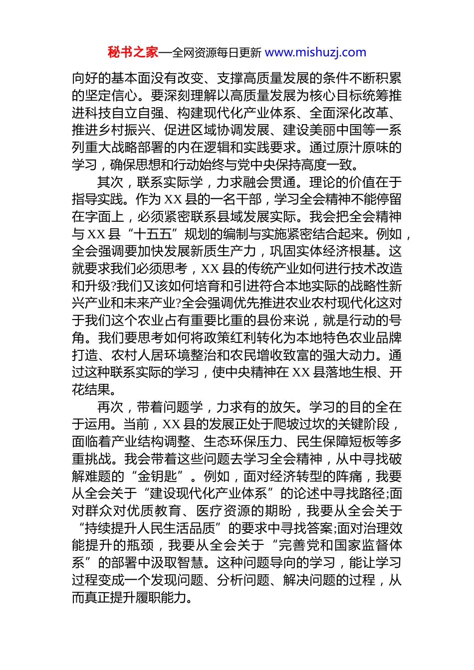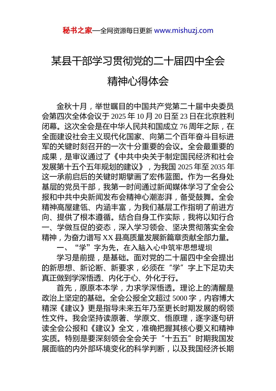 秘书之家—全网资源每日更新 www.mishuzj.com某县干部学习贯彻党的二十届四中全会精神心得体会金秋十月,举世瞩目的中国共产党第二十届中央委员会第四次全体会议于 2025 年 10 月 20 日至 23 日在北京胜利闭幕。这次全会是在中华人民共和国成立 76 周年之际,在全面建设社会主义现代化国家、向第二个百年奋斗目标进军的关键时刻召开的一次十分重要的会议。全会最重要的成果,是审议通过了《中共中央关于制定国民经济和社会发展第十五个五年规划的建议》,为我国 2025 年至 2035 年这一承前启后的关键时期擘画了宏伟蓝图。作为一名身处基层的党员干部,我第一时间通过新闻媒体学习了全会公报和中共中央新闻发布会精神心潮澎湃,备受鼓舞。全会精神高屋建瓴、内涵丰富,为我们基层工作指明了前进方向、提供了根本遵循。结合自身工作实际,我将以知行合一、学做互促的姿态,深入学习领会、坚决贯彻落实全会精神,为奋力谱写 XX 县高质量发展新篇章贡献全部力量。一、“学”字为先,在入脑入心中筑牢思想堤坝学习是前提,是基础。面对党的二十届四中全会提出的新思想、新论断、新要求,必须在“学”字上下足功夫真正做到学深悟透、内化于心、外化于行。首先,原原本本学,力求学深悟透。理论上的清醒是政治上坚定的基础。全会公报全文超过 5000 字,内容博大精深《建议》更是指导未来五年乃至更长时期发展的纲领性文件。我会坚持读原著、学原文、悟原理,逐字逐句研读全会公报和《建议》全文,准确把握其核心要义和精神实质。特别是要深刻领会全会关于“十五五”时期我国发展面临的内外部环境变化的科学判断,以及我国经济长期秘书之家—全网资源每日更新 www.mishuzj.com向好的基本面没有改变、支撑高质量发展的条件不断积累的坚定信心。要深刻理解以高质量发展为核心目标统筹推进科技自立自强、构建现代化产业体系、全面深化改革、推进乡村振兴、促进区域协调发展、建设美丽中国等一系列重大战略部署的内在逻辑和实践要求。通过原汁原味的学习,确保思想和行动始终与党中央保持高度一致。其次,联系实际学,力求融会贯通。理论的价值在于指导实践。作为 XX 县的一名干部,学习全会精神不能停留在字面上,必须紧密联系县域发展实际。我会把全会精神与 XX 县“十五五”规划的编制与实施紧密结合起来。例如,全会强调要加快发展新质生产力,巩固实体经济根基。这就要求我们必须思考,XX 县的传统产业如何进行技术改造和升级?我们又该如何培育和引进符合本地实际的战略性新兴产业和未来产业?全会强调优先推进农业农村现代化这对于我们这个农业占有重要比重的县份来说,就是行动的号角。我们要思考如何将政策红利转化为本地特色农业品牌打造、农村人居环境整治和农民增收致富的强大动力。通过这种联系实际的学习,使中央精神在 XX 县落地生根、开花结果。再次,带着问题学,力求有的放矢。学习的目的全在于运用。当前,XX 县的发展正处于爬坡过坎的关键阶段,面临着产业结构调整、生态环保压力、民生保障短板等多重挑战。我会带着这些问题去学习全会精神,从中寻找破解难题的“金钥匙”。例如,面对经济转型的阵痛,我要从全会关于“建设现代化产业体系”的论述中寻找路径;面对群众对优质教育、医疗资源的期盼,我要从全会关于“持续提升人民生活品质”的要求中寻找答案;面对治理效能提升的瓶颈,我要从全会关于“完善党和国家监督体系”的部署中汲取智慧。这种问题导向的学习,能让学习过程变成一个发现问题、分析问题、解决问题的过程,从而真正提升履职能力。秘书之家—全网资源每日更新 www.mishuzj.com二、“思”字为要,在对标对表中校准工作坐标思考是桥梁,是深化。学而不思则罔。只有经过深入思考,才能把全会精神从“理论认知”转化为“行动自觉”,把中央的“顶层设计”转化为基层的“施工蓝图”。一要思考“国之大者”,提升政治站位。基层工作千头万绪,但都与“国之大者”息息相关。党的二十届四中全会擘画的“十五五”蓝图,关乎强国建设、民族复兴的伟业。身处 XX 县,我们的每一项工作,看似微小,实则都是国家战略的有机组成部分。例如...