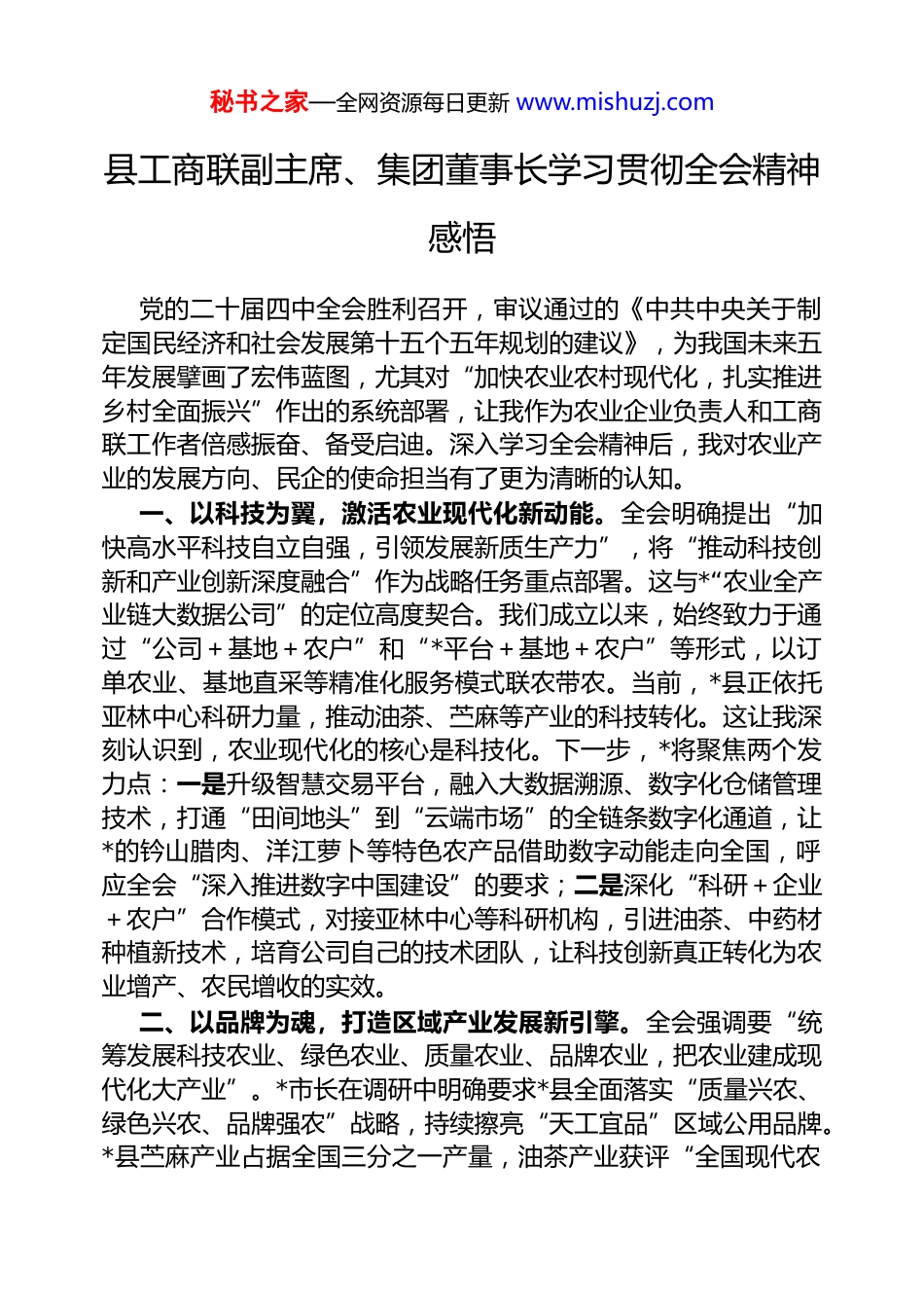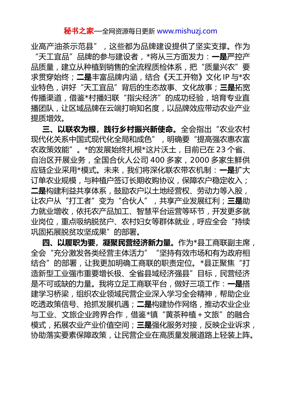 秘书之家—全网资源每日更新 www.mishuzj.com县工商联副主席、集团董事长学习贯彻全会精神感悟党的二十届四中全会胜利召开,审议通过的《中共中央关于制定国民经济和社会发展第十五个五年规划的建议》,为我国未来五年发展擘画了宏伟蓝图,尤其对“加快农业农村现代化,扎实推进乡村全面振兴”作出的系统部署,让我作为农业企业负责人和工商联工作者倍感振奋、备受启迪。深入学习全会精神后,我对农业产业的发展方向、民企的使命担当有了更为清晰的认知。一、以科技为翼,激活农业现代化新动能。全会明确提出“加快高水平科技自立自强,引领发展新质生产力”,将“推动科技创新和产业创新深度融合”作为战略任务重点部署。这与*“农业全产业链大数据公司”的定位高度契合。我们成立以来,始终致力于通过“公司+基地+农户”和“*平台+基地+农户”等形式,以订单农业、基地直采等精准化服务模式联农带农。当前,*县正依托亚林中心科研力量,推动油茶、苎麻等产业的科技转化。这让我深刻认识到,农业现代化的核心是科技化。下一步,*将聚焦两个发力点:一是升级智慧交易平台,融入大数据溯源、数字化仓储管理技术,打通“田间地头”到“云端市场”的全链条数字化通道,让*的钤山腊肉、洋江萝卜等特色农产品借助数字动能走向全国,呼应全会“深入推进数字中国建设”的要求;二是深化“科研+企业+农户”合作模式,对接亚林中心等科研机构,引进油茶、中药材种植新技术,培育公司自己的技术团队,让科技创新真正转化为农业增产、农民增收的实效。二、以品牌为魂,打造区域产业发展新引擎。全会强调要“统筹发展科技农业、绿色农业、质量农业、品牌农业,把农业建成现代化大产业”。*市长在调研中明确要求*县全面落实“质量兴农、绿色兴农、品牌强农”战略,持续擦亮“天工宜品”区域公用品牌。*县苎麻产业占据全国三分之一产量,油茶产业获评“全国现代农秘书之家—全网资源每日更新 www.mishuzj.com业高产油茶示范县”,这些都为品牌建设提供了坚实支撑。作为“天工宜品”品牌的参与建设者,*将从三方面发力:一是严控产品质量,建立从种植到销售的全流程质检体系,把“质量兴农”要求贯穿始终;二是丰富品牌内涵,结合《天工开物》文化 IP 与*农业特色,讲好“天工宜品”背后的生态故事、文化故事;三是拓宽传播渠道,借鉴*村播妇联“指尖经济”的成功经验,培育专业直播团队,让区域品牌在云端打响知名度,以品牌效应带动农业产业提质增效。三、以联农为根,践行乡村振兴新使命。全会指出“农业农村现代化关系中国式现代化全局和成色”,明确要“提高强农惠农富农政策效能”。*的发展始终扎根*这片沃土,目前已在 23 个省、自治区开展业务,全国合伙人公司 400 多家,2000 多家生鲜供应链企业采用*模式。未来,我们将深化联农带农机制:一是扩大订单农业规模,与种植户签订长期收购协议,保障农户稳定收入;二是构建利益共享体系,鼓励农户以土地经营权、劳动力等入股,让农户从“打工者”变为“合伙人”,共享产业发展红利;三是助力就业增收,依托农产品加工、智慧平台运营等环节,开发更多就业岗位,重点吸纳脱贫户、农村妇女等群体就业,呼应全会“持续巩固拓展脱贫攻坚成果”的部署。四、以履职为要,凝聚民营经济新力量。作为*县工商联副主席,全会“充分激发各类经营主体活力”“坚持有效市场和有为政府相结合”的部署,让我更加明确工商联的职责定位。*县正聚焦“打造新型工业强市重要增长极、全省县域经济强县”目标,民营经济是不可或缺的力量。我将立足工商联平台,做好三项工作:一是搭建学习桥梁,组织农业领域民营企业深入学习全会精神,帮助企业吃透政策信号、抢抓发展机遇;二是构建协作网络,推动农业企业与工业、文旅企业跨界合作,借鉴*镇“黄茶种植+文旅”的融合模式,拓展农业产业价值空间;三是强化服务对接,反映企业诉求,协助落实要素保障政策,让民营企业在高质量发展道路上轻装上阵。秘书之家—全网资源每日更新 www.mishuzj.com党的二十届四中全会为农业发展指明了方向,也为民营经济赋予了新的使命。*将以全会精神为指引,深耕农业主业...