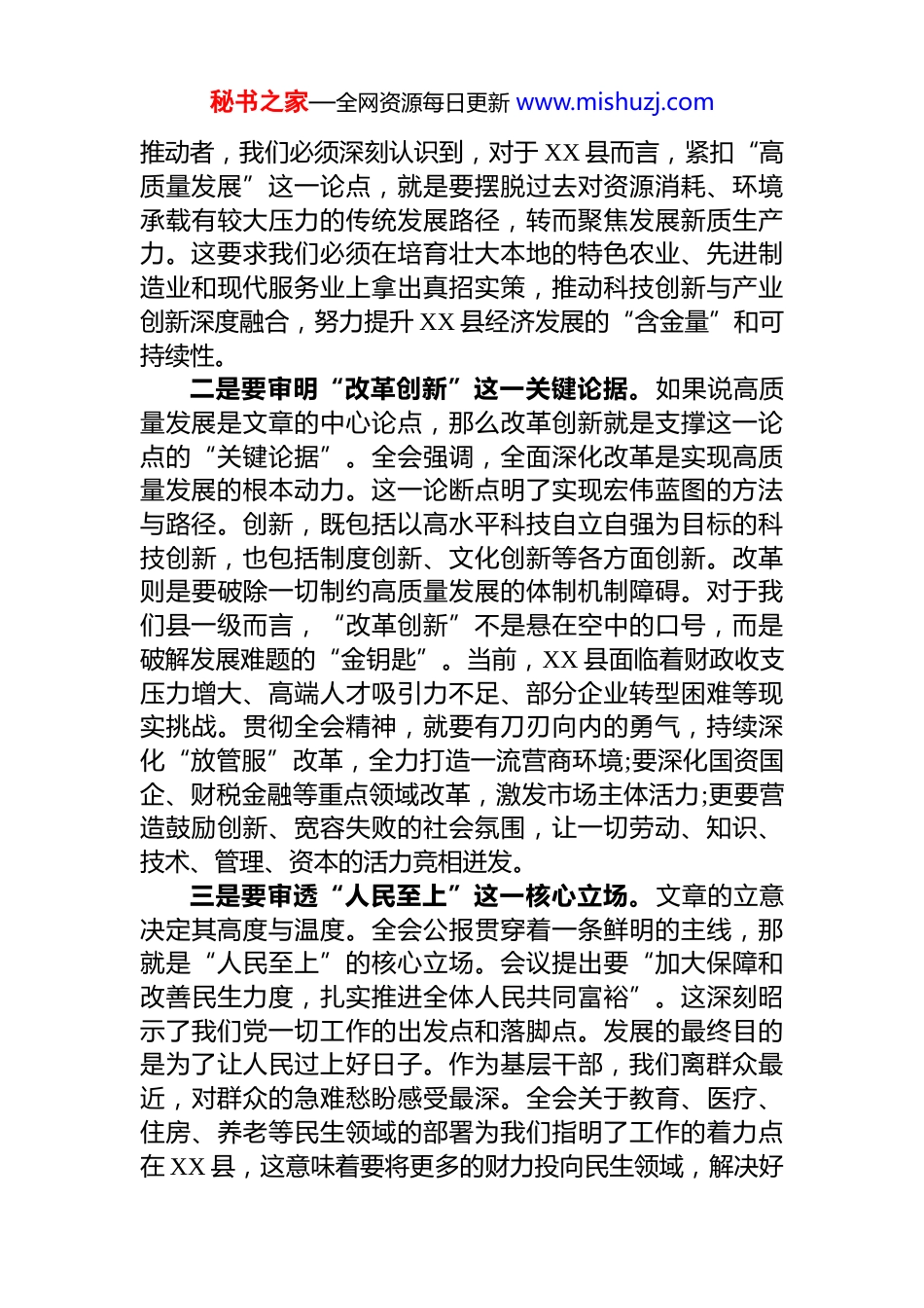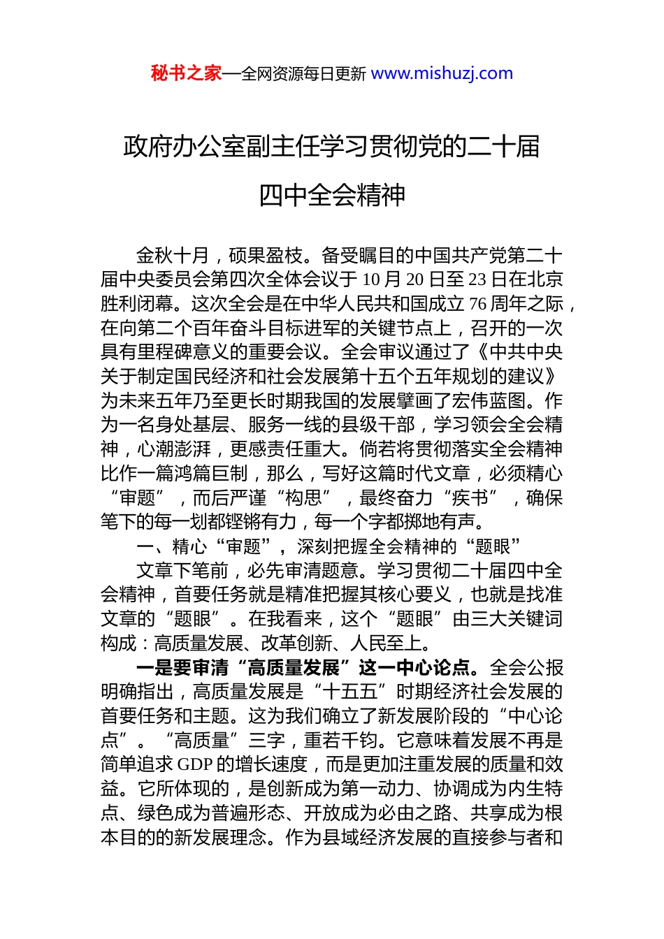 秘书之家—全网资源每日更新 www.mishuzj.com政府办公室副主任学习贯彻党的二十届四中全会精神金秋十月,硕果盈枝。备受瞩目的中国共产党第二十届中央委员会第四次全体会议于 10 月 20 日至 23 日在北京胜利闭幕。这次全会是在中华人民共和国成立 76 周年之际,在向第二个百年奋斗目标进军的关键节点上,召开的一次具有里程碑意义的重要会议。全会审议通过了《中共中央关于制定国民经济和社会发展第十五个五年规划的建议》为未来五年乃至更长时期我国的发展擘画了宏伟蓝图。作为一名身处基层、服务一线的县级干部,学习领会全会精神,心潮澎湃,更感责任重大。倘若将贯彻落实全会精神比作一篇鸿篇巨制,那么,写好这篇时代文章,必须精心“审题”,而后严谨“构思”,最终奋力“疾书”,确保笔下的每一划都铿锵有力,每一个字都掷地有声。一、精心“审题”,深刻把握全会精神的“题眼”文章下笔前,必先审清题意。学习贯彻二十届四中全会精神,首要任务就是精准把握其核心要义,也就是找准文章的“题眼”。在我看来,这个“题眼”由三大关键词构成:高质量发展、改革创新、人民至上。一是要审清“高质量发展”这一中心论点。全会公报明确指出,高质量发展是“十五五”时期经济社会发展的首要任务和主题。这为我们确立了新发展阶段的“中心论点”。“高质量”三字,重若千钧。它意味着发展不再是简单追求 GDP 的增长速度,而是更加注重发展的质量和效益。它所体现的,是创新成为第一动力、协调成为内生特点、绿色成为普遍形态、开放成为必由之路、共享成为根本目的的新发展理念。作为县域经济发展的直接参与者和秘书之家—全网资源每日更新 www.mishuzj.com推动者,我们必须深刻认识到,对于 XX 县而言,紧扣“高质量发展”这一论点,就是要摆脱过去对资源消耗、环境承载有较大压力的传统发展路径,转而聚焦发展新质生产力。这要求我们必须在培育壮大本地的特色农业、先进制造业和现代服务业上拿出真招实策,推动科技创新与产业创新深度融合,努力提升 XX 县经济发展的“含金量”和可持续性。二是要审明“改革创新”这一关键论据。如果说高质量发展是文章的中心论点,那么改革创新就是支撑这一论点的“关键论据”。全会强调,全面深化改革是实现高质量发展的根本动力。这一论断点明了实现宏伟蓝图的方法与路径。创新,既包括以高水平科技自立自强为目标的科技创新,也包括制度创新、文化创新等各方面创新。改革则是要破除一切制约高质量发展的体制机制障碍。对于我们县一级而言,“改革创新”不是悬在空中的口号,而是破解发展难题的“金钥匙”。当前,XX 县面临着财政收支压力增大、高端人才吸引力不足、部分企业转型困难等现实挑战。贯彻全会精神,就要有刀刃向内的勇气,持续深化“放管服”改革,全力打造一流营商环境;要深化国资国企、财税金融等重点领域改革,激发市场主体活力;更要营造鼓励创新、宽容失败的社会氛围,让一切劳动、知识、技术、管理、资本的活力竞相迸发。三是要审透“人民至上”这一核心立场。文章的立意决定其高度与温度。全会公报贯穿着一条鲜明的主线,那就是“人民至上”的核心立场。会议提出要“加大保障和改善民生力度,扎实推进全体人民共同富裕”。这深刻昭示了我们党一切工作的出发点和落脚点。发展的最终目的是为了让人民过上好日子。作为基层干部,我们离群众最近,对群众的急难愁盼感受最深。全会关于教育、医疗、住房、养老等民生领域的部署为我们指明了工作的着力点在 XX 县,这意味着要将更多的财力投向民生领域,解决好秘书之家—全网资源每日更新 www.mishuzj.com学位紧张、就医不便、老旧小区改造等群众关心的具体问题,让发展的成果更多更公平地惠及全县人民,让我们的发展“答卷”充满民生温度。二、严谨“构思”,科学谋划贯彻落实的“篇章”审清题意后,便要谋篇布局,严谨构思。将中央的宏伟蓝图转化为县域发展的生动实景,需要有全局视野、系统思维和务实路径。一是要谋篇布局要有“全局观”。“不谋全局者,不足谋一域。”“十五五”时期是基本实现社会主义现代化夯实基础、全面发力的关键时期。XX 县的发展不...