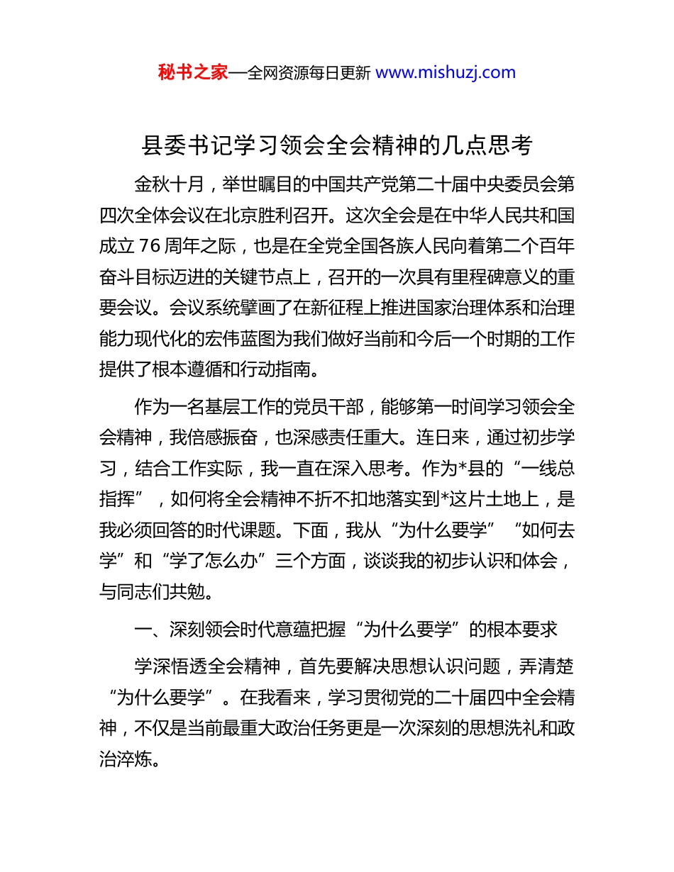 秘书之家—全网资源每日更新 www.mishuzj.com县委书记学习领会全会精神的几点思考金秋十月,举世瞩目的中国共产党第二十届中央委员会第四次全体会议在北京胜利召开。这次全会是在中华人民共和国成立 76 周年之际,也是在全党全国各族人民向着第二个百年奋斗目标迈进的关键节点上,召开的一次具有里程碑意义的重要会议。会议系统擘画了在新征程上推进国家治理体系和治理能力现代化的宏伟蓝图为我们做好当前和今后一个时期的工作提供了根本遵循和行动指南。作为一名基层工作的党员干部,能够第一时间学习领会全会精神,我倍感振奋,也深感责任重大。连日来,通过初步学习,结合工作实际,我一直在深入思考。作为*县的“一线总指挥”,如何将全会精神不折不扣地落实到*这片土地上,是我必须回答的时代课题。下面,我从“为什么要学”“如何去学”和“学了怎么办”三个方面,谈谈我的初步认识和体会,与同志们共勉。一、深刻领会时代意蕴把握“为什么要学”的根本要求学深悟透全会精神,首先要解决思想认识问题,弄清楚“为什么要学”。在我看来,学习贯彻党的二十届四中全会精神,不仅是当前最重大政治任务更是一次深刻的思想洗礼和政治淬炼。秘书之家—全网资源每日更新 www.mishuzj.com其一,这是忠诚拥护“两个确立”、坚决做到“两个维护”的政治要求。党的十八大以来,我们国家在改革发展稳定、内政外交国防、治党治国治军等各个方面取得了历史性成就、发生了历史性变革。实践充分证明,推进中国式现代化,必须坚持和加强党的全面领导。党的二十届四中全会聚焦国家治理现代化这一重大主题,本质上就是从制度层面确保党在社会主义现代化建设事业中始终总揽全局、协调各方。作为县委书记,我必须带头学习、带头领悟,不断提高政治判断力、政治领悟力、政治执行力,确保党中央的决策部署在*一贯到底、落地生根,任何时候都不能有偏差、不能打折扣。其二,这是推动高质量发展的现实需要。当前,*正处在转型升级、追赶跨越的关键时期。根据“十四五”规划的目标,到 2025 年,我们的地区生产总值要力争达到 213 亿元。从今年前三季度的经济运行情况看,我们面临的外部环境依然复杂,内部结构性矛盾依然突出,发展的任务艰巨而繁重。如何有效防范化解风险、如何激发市场主体活力、如何保障和改善民生、如何守好生态和安全两条底线,这些都是摆在我们面前的现实考验。党的二十届四中全会提出的关于推进国家治理体系和治理能力现代化的新理念、新思想、新战略,就像一把“金钥匙”,为我们破解发展难题、厚植发展优势提供了科学指引。不学深、不悟透,就可能在工作中迷失方向,错失发展机遇。秘书之家—全网资源每日更新 www.mishuzj.com其三,这是提升干部队伍履职能力的内在逻辑。推进治理能力现代化,关键在人,关键在干部。面对新形势新任务,我们的一些干部或多或少还存在本领恐慌、能力赤字的问题。有的习惯于老办法、旧路径,对新发展理念理解不深;有的攻坚克难的锐气不足,存在“躺平”心态;有的服务群众的意识和能力不强,工作方法简单。学习全会精神,就是要引导全县广大党员干部,特别是领导干部,主动对标对表中央的新要求,来一次思想观念的大更新、能力素质的大提升、工作作风的大转变,从而更好地肩负起时代赋予我们的重任。二、坚持理论联系实际探索“如何去学”的有效路径学习领会全会精神,不能停留在口号上,更不能满足于“一知半解”,必须下足“真学、真懂、真信、真用”的功夫。我感到,要真正学到精髓、悟透要义,必须坚持以下几个结合。一是坚持原原本本学与融会贯通学相结合。学习全会精神首先要静下心来,原原本本、逐字逐句地研读全会公报以及审议通过的《决定》等重要文件。只有吃透了原文,才能准确把握其精神实质和核心要义。同时,要把学习全会精神同学习党的二十大精神结合起来,同学习历次中央全会精神贯通起来,特别是要与党的十九届四中全会关于国家治理体系和治理能力现代化的《决定》对比学习,深刻理解党中央在不同历史阶段秘书之家—全网资源每日更新 www.mishuzj.com对这一重大课题的战略考量和部署,从而形成一个系统、完整、立体...