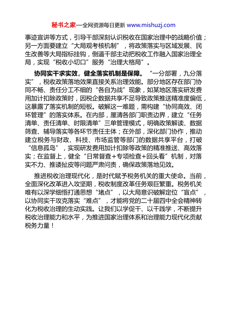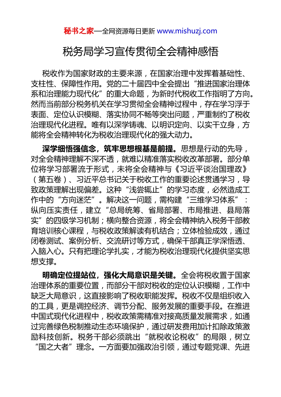 秘书之家—全网资源每日更新 www.mishuzj.com税务局学习宣传贯彻全会精神感悟税收作为国家财政的主要来源,在国家治理中发挥着基础性、支柱性、保障性作用。党的二十届四中全会提出“推进国家治理体系和治理能力现代化”的重大命题,为新时代税收工作指明了方向。然而当前部分税务机关在学习贯彻全会精神过程中,存在学习浮于表面、定位认识模糊、落实协同不畅等突出问题,严重制约了税收治理现代化进程。唯有以深学铸魂、以明识定向、以实干立身,方能将全会精神转化为税收治理现代化的强大动力。深学细悟强信念,筑牢思想根基是前提。思想是行动的先导,对全会精神理解不深不透,就难以精准落实税收改革部署。部分单位将学习部署流于形式,未将全会精神与《习近平谈治国理政》(第五卷)、习近平总书记关于税收工作的重要论述贯通学习,导致政策理解出现偏差。这种“浅尝辄止”的学习态度,必然造成工作中的“方向迷茫”。解决这一问题,需构建“三维学习体系”:纵向压实责任,建立“总局统筹、省局部署、市局推进、县局落实”的四级学习机制;横向整合资源,将全会精神纳入税务干部教育培训核心课程,与税收政策解读有机结合;立体检验成效,通过闭卷测试、案例分析、交流研讨等方式,确保干部真正学深悟透、入脑入心。只有把理论学扎实,才能为税收治理现代化提供坚实思想支撑。明确定位提站位,强化大局意识是关键。全会将税收置于国家治理体系的重要位置,而部分干部对税收的定位认识模糊,工作中缺乏大局意识,这直接影响了税收职能发挥。税收不仅是组织收入的工具,更是调控经济、调节分配、服务发展的重要手段。在推进中国式现代化进程中,税收政策需精准对接高质量发展需求,如通过完善绿色税制推动生态环境保护,通过研发费用加计扣除政策激励科技创新。税务干部必须跳出“就税收论税收”的局限,树立“国之大者”理念。一方面要加强政治引领,通过专题党课、先进秘书之家—全网资源每日更新 www.mishuzj.com事迹宣讲等方式,引导干部深刻认识税收在国家治理中的战略价值;另一方面要建立“大局观考核机制”,将政策落实与区域发展、民生改善等大局指标挂钩,倒逼干部主动把税收工作融入国家治理全局,实现“税收小切口”服务“治理大格局”。协同实干求实效,健全落实机制是保障。“一分部署,九分落实”,税收政策落地效果直接关系治理效能。部分地区存在部门协同不畅、责任分工不细的“各自为战”现象,如某地区落实研发费用加计扣除政策时,因税企数据共享不足导致政策推送精准度偏低,这暴露了落实机制的短板。破解这一难题,需构建“协同高效、闭环管理”的落实体系。在内部,厘清各部门职责边界,建立“任务清单、责任清单、时限清单”三单管理模式,明确政策解读、数据筛查、辅导落实等各环节责任主体;在外部,深化部门协作,推动建立税务与财政、科技、市场监管等部门的数据共享平台,打破“信息孤岛”,实现研发费用加计扣除等政策的精准推送、高效落实;在监督上,健全“日常督查+专项检查+回头看”机制,对落实不力、推诿扯皮等问题严肃问责,确保政策落地见效。推进税收治理现代化,是时代赋予税务机关的重大使命。当前,全面深化改革进入攻坚期,税收制度改革任务艰巨繁重。税务机关唯有以深学细悟打通思想“堵点”,以大局意识破解定位“盲点”,以协同实干攻克落实“难点”,才能将党的二十届四中全会精神转化为税收治理的生动实践。让我们以学促干、以干践学,不断提升税收治理能力和水平,为推进国家治理体系和治理能力现代化贡献税务力量!