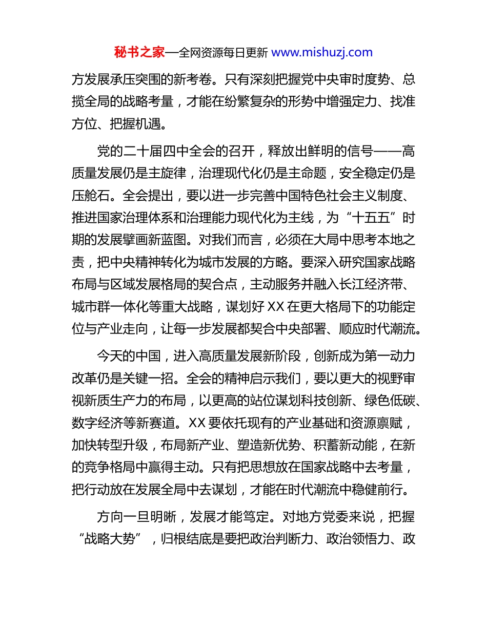 秘书之家—全网资源每日更新 www.mishuzj.com心得体会:以思想自觉铸牢信念每一次全会,都是一次思想的升华、方向的校准、使命的再出发。党的二十届四中全会是在全面建设社会主义现代化国家新征程上召开的一次重要会议,承前启后、继往开来,既总结经验、又谋划长远,既部署当下、又关乎未来。全会鲜明回答了新时代新征程“怎么看、怎么干、往哪走”的重大课题,为我们在新的历史方位上推进中国式现代化提供了根本遵循。对于地方党委来说,学习贯彻全会精神,关键是要把思想统一到中央精神上,把行动落实到发展实践中。学习不是被动的接受,而是主动的思考;贯彻不是简单的执行,而是创造性的落实。作为市委书记,我深刻体会到,只有以战略眼光看大势、以思想自觉铸信念、以实干精神抓落实,才能让中央的决策部署在 XX 落地见效,推动这座城市在新征程上稳中有进、行稳致远。接下来,我谈下自己的体会。一、把握“战略大势”,在时代坐标中校准前行方向方向决定道路,道路关乎命运。学习领会党的二十届四中全会精神,首先要在思想上搞清楚“何以学、为何学”,在大势中明方向,在全局中谋定位。站在“两个一百年”奋斗目标的历史交汇点上,我们所面对的,是世界百年未有之大变局加速演进的新格局,是中国式现代化持续推进的新阶段,也是地秘书之家—全网资源每日更新 www.mishuzj.com方发展承压突围的新考卷。只有深刻把握党中央审时度势、总揽全局的战略考量,才能在纷繁复杂的形势中增强定力、找准方位、把握机遇。党的二十届四中全会的召开,释放出鲜明的信号——高质量发展仍是主旋律,治理现代化仍是主命题,安全稳定仍是压舱石。全会提出,要以进一步完善中国特色社会主义制度、推进国家治理体系和治理能力现代化为主线,为“十五五”时期的发展擘画新蓝图。对我们而言,必须在大局中思考本地之责,把中央精神转化为城市发展的方略。要深入研究国家战略布局与区域发展格局的契合点,主动服务并融入长江经济带、城市群一体化等重大战略,谋划好 XX 在更大格局下的功能定位与产业走向,让每一步发展都契合中央部署、顺应时代潮流。今天的中国,进入高质量发展新阶段,创新成为第一动力改革仍是关键一招。全会的精神启示我们,要以更大的视野审视新质生产力的布局,以更高的站位谋划科技创新、绿色低碳、数字经济等新赛道。XX 要依托现有的产业基础和资源禀赋,加快转型升级,布局新产业、塑造新优势、积蓄新动能,在新的竞争格局中赢得主动。只有把思想放在国家战略中去考量,把行动放在发展全局中去谋划,才能在时代潮流中稳健前行。方向一旦明晰,发展才能笃定。对地方党委来说,把握“战略大势”,归根结底是要把政治判断力、政治领悟力、政秘书之家—全网资源每日更新 www.mishuzj.com治执行力统一到党中央的决策部署上来。要坚持以习近平新时代中国特色社会主义思想为根本遵循,以对党绝对忠诚的政治品格,准确把握“国之大者”,把中央精神转化为地方发展的实践指引、为群众福祉的具体行动。只有心中有大局、手中有举措、脚下有方向,才能在推进中国式现代化的壮阔征程中,谱写 XX 发展的新篇章。二、聚焦“思想铸魂”,在深学笃行中凝聚奋进共识理论的力量,源自思想的深度;学习的成效,体现在行动的自觉。学习贯彻党的二十届四中全会精神,首要任务是做到学深悟透、融会贯通,把学习过程变成政治再洗礼、思想再淬炼、作风再升华的过程。只有以思想铸魂、以理论强基,才能在大是大非面前立得稳,在风高浪急中行得远。一要带头学在前列,以上率下作表率。市委要第一时间召开常委会会议、理论学习中心组专题学习会,逐字逐句研读全会公报和《决定》全文,第一时间传达、第一时间贯彻。我本人将带头领学、精读、思考,确保学得早、悟得深、做得实。要把全会精神纳入“第一议题”制度,纳入干部教育培训计划,纳入理论宣讲重点内容,通过党委中心组学习、专题读书班、理论宣讲团等多种形式,推动学习全覆盖、常态化。学习不是一阵风,而是一种政治责任,要真正让学习成为推动事业发展的思想引擎。秘书之家—全网资源每日更新 www.mishuzj.com二要引导干部在学中...