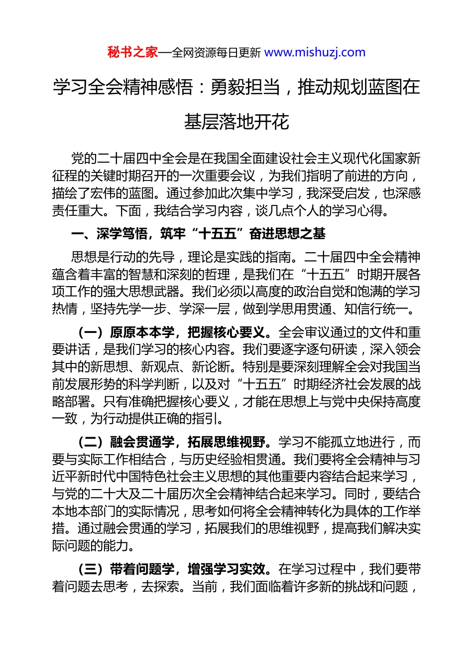秘书之家—全网资源每日更新 www.mishuzj.com学习全会精神感悟:勇毅担当,推动规划蓝图在基层落地开花党的二十届四中全会是在我国全面建设社会主义现代化国家新征程的关键时期召开的一次重要会议,为我们指明了前进的方向,描绘了宏伟的蓝图。通过参加此次集中学习,我深受启发,也深感责任重大。下面,我结合学习内容,谈几点个人的学习心得。一、深学笃悟,筑牢“十五五”奋进思想之基思想是行动的先导,理论是实践的指南。二十届四中全会精神蕴含着丰富的智慧和深刻的哲理,是我们在“十五五”时期开展各项工作的强大思想武器。我们必须以高度的政治自觉和饱满的学习热情,坚持先学一步、学深一层,做到学思用贯通、知信行统一。(一)原原本本学,把握核心要义。全会审议通过的文件和重要讲话,是我们学习的核心内容。我们要逐字逐句研读,深入领会其中的新思想、新观点、新论断。特别是要深刻理解全会对我国当前发展形势的科学判断,以及对“十五五”时期经济社会发展的战略部署。只有准确把握核心要义,才能在思想上与党中央保持高度一致,为行动提供正确的指引。(二)融会贯通学,拓展思维视野。学习不能孤立地进行,而要与实际工作相结合,与历史经验相贯通。我们要将全会精神与习近平新时代中国特色社会主义思想的其他重要内容结合起来学习,与党的二十大及二十届历次全会精神结合起来学习。同时,要结合本地本部门的实际情况,思考如何将全会精神转化为具体的工作举措。通过融会贯通的学习,拓展我们的思维视野,提高我们解决实际问题的能力。(三)带着问题学,增强学习实效。在学习过程中,我们要带着问题去思考,去探索。当前,我们面临着许多新的挑战和问题,秘书之家—全网资源每日更新 www.mishuzj.com如经济结构调整、科技创新能力提升、生态环境保护等。我们要从全会精神中寻找解决这些问题的思路和方法。通过带着问题学,增强学习的针对性和实效性,使学习真正成为推动工作的动力。二、勇毅担当,推动规划蓝图在基层落地开花“一分部署,九分落实。”二十届四中全会描绘了“十五五”时期的宏伟蓝图,要将这一蓝图变为现实,关键在于我们每一个人都要立足岗位实际,勇于担当作为,积极投身到各项工作中去。(一)投身项目建设,助力经济发展。高质量项目建设是推动经济发展的重要支撑。我们要积极参与到各类项目建设中去,充分发挥自己的专业优势和特长。无论是基础设施建设项目,还是产业发展项目,我们都要以高度的责任感和使命感,确保项目顺利推进。在项目建设过程中,要注重质量和安全,严格按照相关标准和规范进行操作,为经济发展奠定坚实的基础。(二)破解发展难题,激发创新活力。在发展过程中,我们难免会遇到各种新情况、新问题。面对这些难题,我们不能退缩,而要勇于担当,积极寻找解决办法。要敢于突破传统思维的束缚,勇于创新工作方式方法。例如,在科技创新方面,我们要鼓励企业加大研发投入,加强产学研合作,提高自主创新能力;在营商环境优化方面,我们要简化办事流程,提高服务效率,为企业发展创造良好的条件。只有不断破解发展难题,才能激发经济社会发展的创新活力。(三)强化责任意识,确保工作落实。责任是担当的基石。我们要强化责任意识,对自己的工作任务负责到底。无论是大事还是小事,都要认真对待,确保每一项工作都能落到实处。要建立健全工作责任制,明确责任分工,加强监督检查,对工作不力的要严肃问责。只有通过强化责任意识,才能形成人人有责、人人尽责的良好工作氛围,推动全会精神在基层落地生根。三、严守底线,以高水平安全护航高质量发展秘书之家—全网资源每日更新 www.mishuzj.com安全是发展的前提,是人民幸福安康的基本要求。在推进“十五五”规划实施的过程中,我们必须牢固树立安全发展理念,坚守安全底线,以高水平安全保障高质量发展。(一)强化安全意识,筑牢思想防线。安全意识是安全生产的第一道防线。我们要通过多种形式的宣传教育活动,提高全体人员的安全意识。要让每一个人都深刻认识到安全的重要性,时刻绷紧安全这根弦。无论是在工作中还是生活中,都要自觉遵守安全规定,不麻痹大意,不...