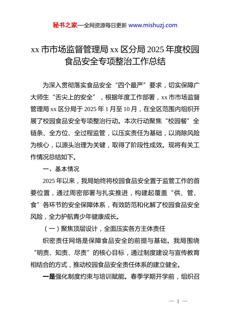 秘书之家—全网资源每日更新 www.mishuzj.comxx 市市场监督管理局 xx 区分局 2025 年度校园食品安全专项整治工作总结为深入贯彻落实食品安全“四个最严”要求,切实保障广大师生“舌尖上的安全”,根据年度工作部署,xx 市市场监督管理局 xx 区分局于 2025 年 1 月至 10 月,在全区范围内组织开展了校园食品安全专项整治行动。本次行动聚焦“校园餐”全链条、全方位、全过程监管,以压实责任为基础,以消除风险为核心,以源头治理为关键,取得了阶段性成效。现将有关工作情况总结如下。一、基本情况2025 年以来,我局始终将校园食品安全置于监管工作的首要位置,通过周密部署与扎实推进,构建起覆盖“供、管、食”各环节的安全保障体系,有效防范和化解了校园食品安全风险,全力护航青少年健康成长。(一)聚焦顶层设计,全面压实各方主体责任织密责任网络是保障食品安全的前提与基础。我局围绕“明责、知责、尽责”的核心目标,通过制度建设与宣传教育相结合的方式,推动校园食品安全责任体系的建立健全。一是强化制度约束与培训赋能。春季学期开学前,组织召— 1 —秘书之家—全网资源每日更新 www.mishuzj.com开了全区校园食品安全工作部署会,联合教育体育等部门,对全区所有中小学、幼儿园的校(园)长及食品安全总监、安全员进行专题培训。培训内容系统涵盖了《中华人民共和国食品安全法》等法律法规,并重点围绕信息公示、从业人员健康管理、原料控制、加工制作过程、食品添加剂使用管理、备餐供餐与配送、场所和设备设施清洁维护、餐饮具清洗消毒以及食品安全管理等九大关键环节,通过理论讲解与现场演示,着力提升从业人员的专业素养与规范操作能力。秋季学期,组织召开了主体责任落实经验交流会,选取年度优秀案例与典型负面案例进行剖析,引导各校际之间互学互鉴,营造比学赶超的良好氛围。二是深化约谈提醒与源头管控。为从供应端筑牢安全第一道防线,我局分别于年初及年中两次组织召开大宗食材供应商约谈会,面向全区主要校园食材供应商,明确传导监管要求与安全标准。会议强调了供应商在资质审查、索证索票、运输仓储、产品追溯等方面的主体责任,要求其建立完善的自查体系与应急预案,严禁不合格食材流入校园。此举有效强化了供應商的敬畏意识和责任意识,为后续的源頭治理奠定了坚实基础。(二)坚持问题导向,全程筑牢风险防控防线以风险防控为核心,我局大力推行“综合监管一件事”改— 2 —秘书之家—全网资源每日更新 www.mishuzj.com革,变“九龙治水”为“攥指成拳”,显著提升了监管效能。通过春秋两季开学季的集中行动,实现了对重点环节与关键节点的精准打击和全面覆盖。一是实施部门联合全覆盖检查。我局联合教体、公安、卫健等部门,组建联合检查组,于春、秋两季对全区 72 家设有食堂的中小学、幼儿园开展了全覆盖、全链条的拉网式检查。此次检查行动覆盖了全区所有开设食堂的教育机构,检查覆盖率达到 100%。检查工作紧盯食材溯源、加工制作、餐饮具清洗消毒等重点环节,聚焦环境卫生、食品留样、有害生物防治等关键节点,坚持“零容忍”执法标准。全年累计发现并指出各类问题隐患 258 个,主要集中在后厨环境卫生不达标、食品储存不规范、从业人员操作不规范、索证索票不齐全等方面。二是推行问题隐患闭环销号管理。针对检查中发现的 258个问题,我局建立了详细的问题台账,明确整改责任单位、责任人与整改时限,并实行“清单化管理、销号式督办”。所有问题均已按期整改完毕,整改率达到 100%。为防止问题反弹,我局还组织了“回头看”专项督查,对问题单位进行复查,确保整改成果得到巩固。此外,为加强对餐饮具安全的监控,全年专项抽检了学校复用餐饮具 21 批次,检验结果全部合格。对检查中发现的涉嫌违法行为线索,均已依法依规严肃查处或及— 3 —秘书之家—全网资源每日更新 www.mishuzj.com时移交相关部门处理,形成了有力震慑。(三)强化溯源管控,全力守住食材安全底线食材源头安全是校园食品安全的基石。我局创新监管模式建立了“日常检查+联合督查”的双重机制,对校园大宗食材供應鏈实施全周期监...