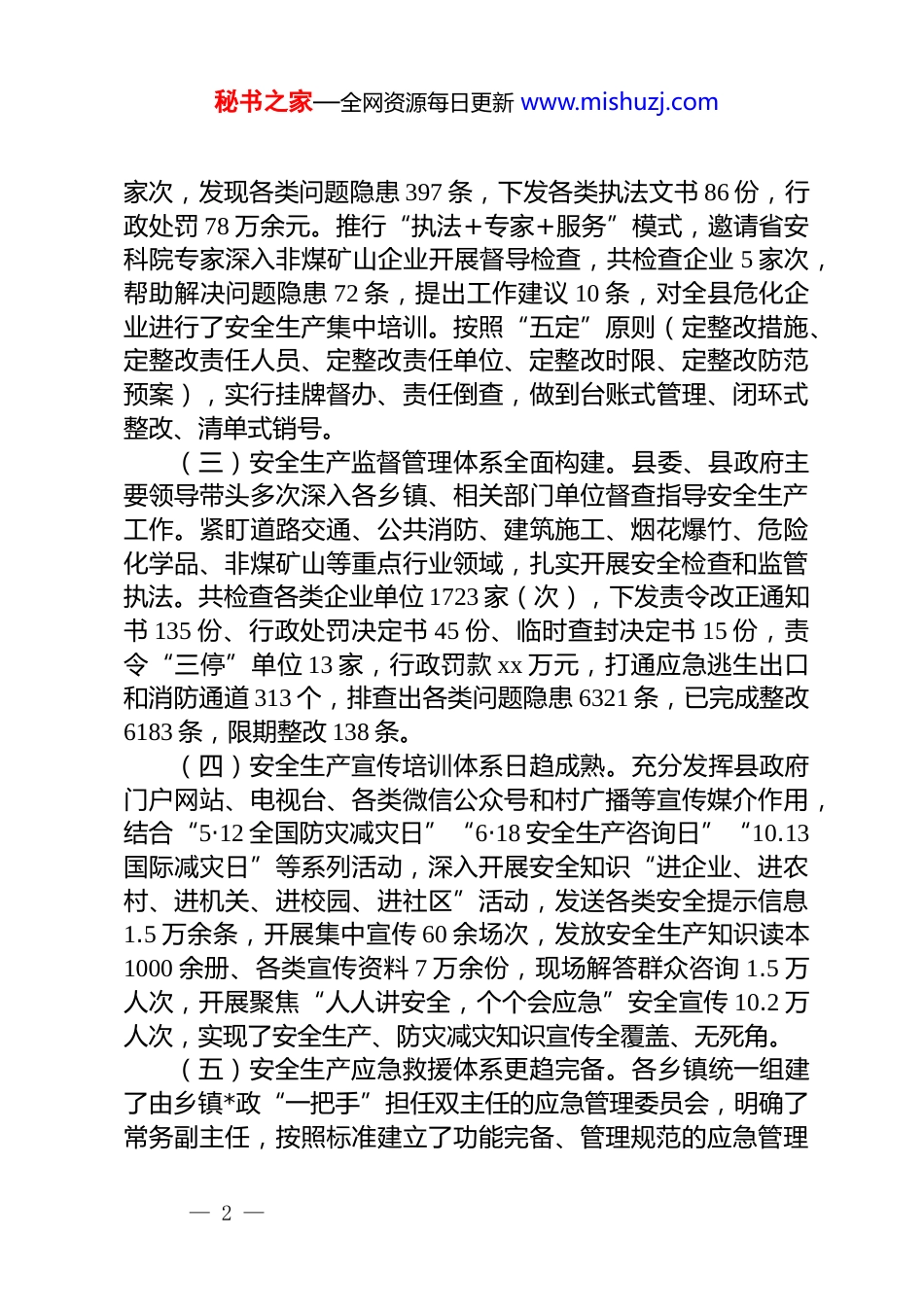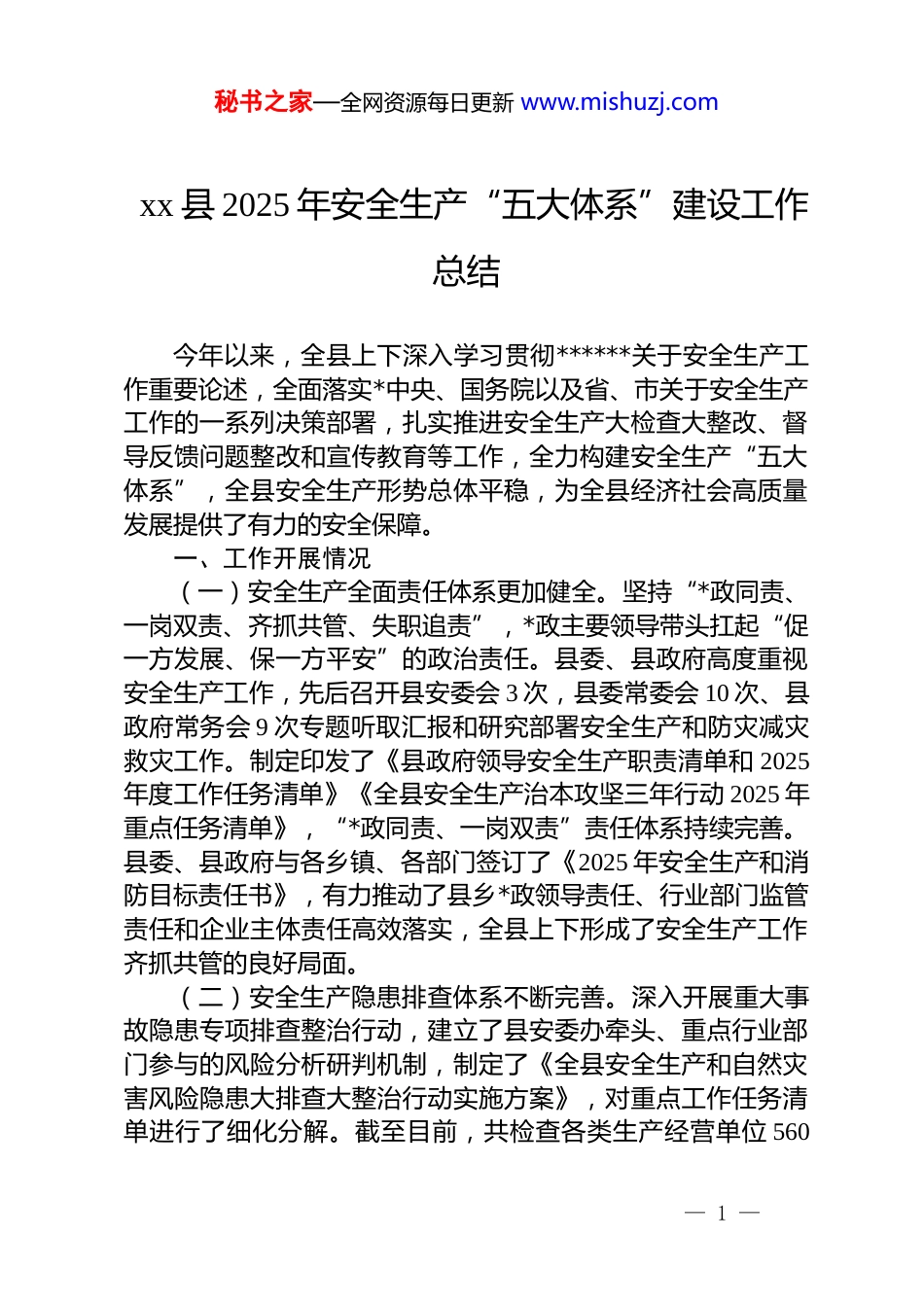 秘书之家—全网资源每日更新 www.mishuzj.comxx 县 2025 年安全生产“五大体系”建设工作总结今年以来,全县上下深入学习贯彻******关于安全生产工作重要论述,全面落实*中央、国务院以及省、市关于安全生产工作的一系列决策部署,扎实推进安全生产大检查大整改、督导反馈问题整改和宣传教育等工作,全力构建安全生产“五大体系”,全县安全生产形势总体平稳,为全县经济社会高质量发展提供了有力的安全保障。一、工作开展情况(一)安全生产全面责任体系更加健全。坚持“*政同责、一岗双责、齐抓共管、失职追责”,*政主要领导带头扛起“促一方发展、保一方平安”的政治责任。县委、县政府高度重视安全生产工作,先后召开县安委会 3 次,县委常委会 10 次、县政府常务会 9 次专题听取汇报和研究部署安全生产和防灾减灾救灾工作。制定印发了《县政府领导安全生产职责清单和 2025年度工作任务清单》《全县安全生产治本攻坚三年行动 2025 年重点任务清单》,“*政同责、一岗双责”责任体系持续完善。县委、县政府与各乡镇、各部门签订了《2025 年安全生产和消防目标责任书》,有力推动了县乡*政领导责任、行业部门监管责任和企业主体责任高效落实,全县上下形成了安全生产工作齐抓共管的良好局面。(二)安全生产隐患排查体系不断完善。深入开展重大事故隐患专项排查整治行动,建立了县安委办牵头、重点行业部门参与的风险分析研判机制,制定了《全县安全生产和自然灾害风险隐患大排查大整治行动实施方案》,对重点工作任务清单进行了细化分解。截至目前,共检查各类生产经营单位 560— 1 —秘书之家—全网资源每日更新 www.mishuzj.com家次,发现各类问题隐患 397 条,下发各类执法文书 86 份,行政处罚 78 万余元。推行“执法+专家+服务”模式,邀请省安科院专家深入非煤矿山企业开展督导检查,共检查企业 5 家次,帮助解决问题隐患 72 条,提出工作建议 10 条,对全县危化企业进行了安全生产集中培训。按照“五定”原则(定整改措施、定整改责任人员、定整改责任单位、定整改时限、定整改防范预案),实行挂牌督办、责任倒查,做到台账式管理、闭环式整改、清单式销号。(三)安全生产监督管理体系全面构建。县委、县政府主要领导带头多次深入各乡镇、相关部门单位督查指导安全生产工作。紧盯道路交通、公共消防、建筑施工、烟花爆竹、危险化学品、非煤矿山等重点行业领域,扎实开展安全检查和监管执法。共检查各类企业单位 1723 家(次),下发责令改正通知书 135 份、行政处罚决定书 45 份、临时查封决定书 15 份,责令“三停”单位 13 家,行政罚款 xx 万元,打通应急逃生出口和消防通道 313 个,排查出各类问题隐患 6321 条,已完成整改6183 条,限期整改 138 条。(四)安全生产宣传培训体系日趋成熟。充分发挥县政府门户网站、电视台、各类微信公众号和村广播等宣传媒介作用,结合“5·12 全国防灾减灾日”“6·18 安全生产咨询日”“10.13国际减灾日”等系列活动,深入开展安全知识“进企业、进农村、进机关、进校园、进社区”活动,发送各类安全提示信息1.5 万余条,开展集中宣传 60 余场次,发放安全生产知识读本1000 余册、各类宣传资料 7 万余份,现场解答群众咨询 1.5 万人次,开展聚焦“人人讲安全,个个会应急”安全宣传 10.2 万人次,实现了安全生产、防灾减灾知识宣传全覆盖、无死角。(五)安全生产应急救援体系更趋完备。各乡镇统一组建了由乡镇*政“一把手”担任双主任的应急管理委员会,明确了常务副主任,按照标准建立了功能完备、管理规范的应急管理— 2 —秘书之家—全网资源每日更新 www.mishuzj.com场所,在 344 个行政村(社区)成立了应急管理站,基本建成了组织指挥高效、统筹机制健全、风险防控精准、应急保障有力的基层应急管理体系。在 15 个乡镇开展防灾减灾综合演练486 场次,实现县乡村(社区)全覆盖。持续加强应急救援物资储备,成功举行地震应急救援综合演练,进一步提升了全县地震等自然灾害应急处置能力。严格落实 24 小时值班制度,针对特殊节点开展联合研判会商,及时下发预警信息,确保汛情、险情等指令及时准确上传下达,进一步提升了应急综合处突能力。— 3 —
