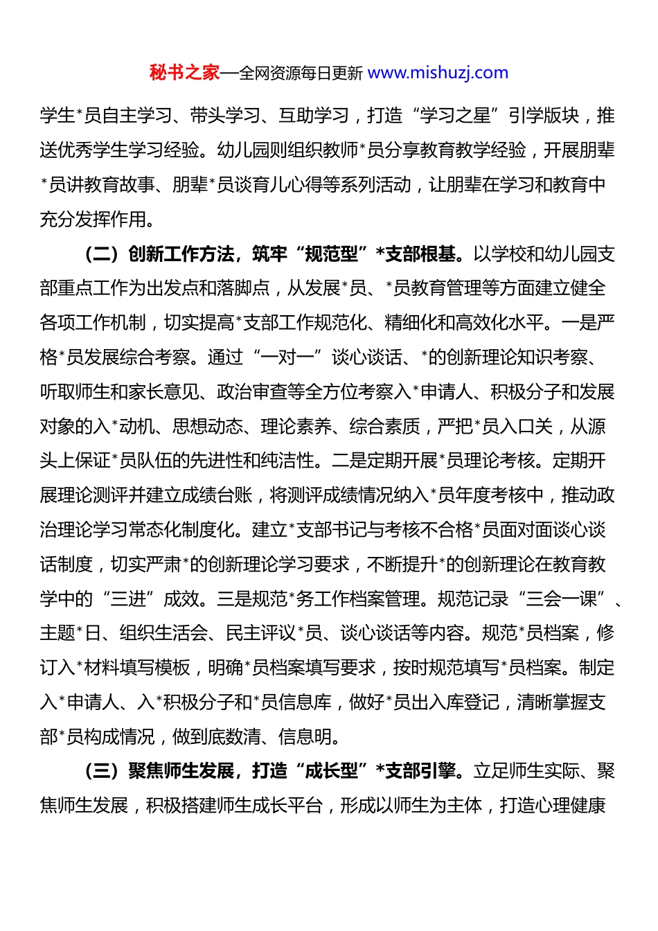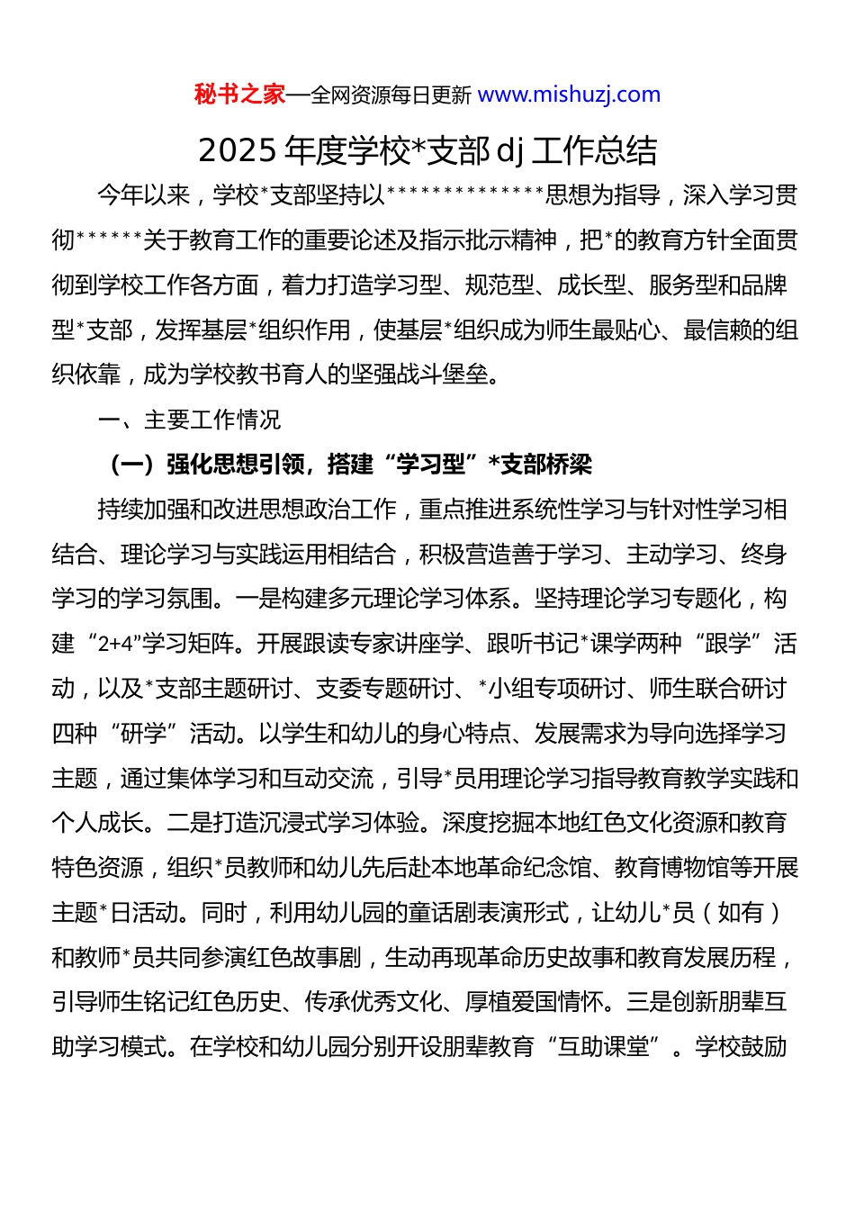 秘书之家—全网资源每日更新 www.mishuzj.com2025 年度学校*支部 dj 工作总结今年以来,学校*支部坚持以**************思想为指导,深入学习贯彻******关于教育工作的重要论述及指示批示精神,把*的教育方针全面贯彻到学校工作各方面,着力打造学习型、规范型、成长型、服务型和品牌型*支部,发挥基层*组织作用,使基层*组织成为师生最贴心、最信赖的组织依靠,成为学校教书育人的坚强战斗堡垒。一、主要工作情况(一)强化思想引领,搭建“学习型”*支部桥梁持续加强和改进思想政治工作,重点推进系统性学习与针对性学习相结合、理论学习与实践运用相结合,积极营造善于学习、主动学习、终身学习的学习氛围。一是构建多元理论学习体系。坚持理论学习专题化,构建“2+4”学习矩阵。开展跟读专家讲座学、跟听书记*课学两种“跟学”活动,以及*支部主题研讨、支委专题研讨、*小组专项研讨、师生联合研讨四种“研学”活动。以学生和幼儿的身心特点、发展需求为导向选择学习主题,通过集体学习和互动交流,引导*员用理论学习指导教育教学实践和个人成长。二是打造沉浸式学习体验。深度挖掘本地红色文化资源和教育特色资源,组织*员教师和幼儿先后赴本地革命纪念馆、教育博物馆等开展主题*日活动。同时,利用幼儿园的童话剧表演形式,让幼儿*员(如有)和教师*员共同参演红色故事剧,生动再现革命历史故事和教育发展历程,引导师生铭记红色历史、传承优秀文化、厚植爱国情怀。三是创新朋辈互助学习模式。在学校和幼儿园分别开设朋辈教育“互助课堂”。学校鼓励秘书之家—全网资源每日更新 www.mishuzj.com学生*员自主学习、带头学习、互助学习,打造“学习之星”引学版块,推送优秀学生学习经验。幼儿园则组织教师*员分享教育教学经验,开展朋辈*员讲教育故事、朋辈*员谈育儿心得等系列活动,让朋辈在学习和教育中充分发挥作用。(二)创新工作方法,筑牢“规范型”*支部根基。以学校和幼儿园支部重点工作为出发点和落脚点,从发展*员、*员教育管理等方面建立健全各项工作机制,切实提高*支部工作规范化、精细化和高效化水平。一是严格*员发展综合考察。通过“一对一”谈心谈话、*的创新理论知识考察、听取师生和家长意见、政治审查等全方位考察入*申请人、积极分子和发展对象的入*动机、思想动态、理论素养、综合素质,严把*员入口关,从源头上保证*员队伍的先进性和纯洁性。二是定期开展*员理论考核。定期开展理论测评并建立成绩台账,将测评成绩情况纳入*员年度考核中,推动政治理论学习常态化制度化。建立*支部书记与考核不合格*员面对面谈心谈话制度,切实严肃*的创新理论学习要求,不断提升*的创新理论在教育教学中的“三进”成效。三是规范*务工作档案管理。规范记录“三会一课”、主题*日、组织生活会、民主评议*员、谈心谈话等内容。规范*员档案,修订入*材料填写模板,明确*员档案填写要求,按时规范填写*员档案。制定入*申请人、入*积极分子和*员信息库,做好*员出入库登记,清晰掌握支部*员构成情况,做到底数清、信息明。(三)聚焦师生发展,打造“成长型”*支部引擎。立足师生实际、聚焦师生发展,积极搭建师生成长平台,形成以师生为主体,打造心理健康秘书之家—全网资源每日更新 www.mishuzj.com翼、教育教学翼、科研创新翼、家园共育翼的“一体四翼”建设思路,打造“dj+”育人体系,确保支部有活力、*员起作用、师生获成长。一是“dj+心理健康”。“心理健康”*小组吸收心理学专业教师和心理咨询师*员,发挥专业特长,推进心理育人与 dj 育人协同联动发展。组织*员教师为师生和家长开展团体心理辅导活动,编创展演心理剧目,定期开展心理知识宣讲普及活动,长期为师生和家长提供心理咨询服务。在幼儿园,针对幼儿的心理特点,开展趣味心理游戏活动,促进幼儿心理健康发展。二是“dj+教育教学”。“教育教学”*小组吸收各学科骨干教师*员,发挥教学优势,以高质量 dj 推动新时代教育教学质量提升。组织*员教师积极参加教学研讨活动、教学技能比赛等,扎实提高专业素养和教学技能。开展“名师引领”系列活动,为教师*员汲取名师经验搭建平台。在幼儿园,*员...