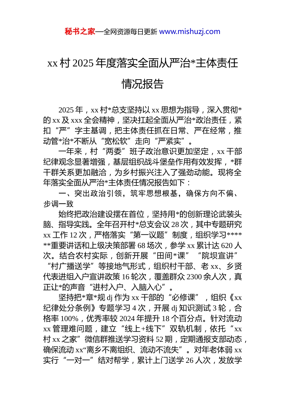 秘书之家—全网资源每日更新 www.mishuzj.comxx 村 2025 年度落实全面从严治*主体责任情况报告2025 年,xx 村*总支坚持以 xx 思想为指导,深入贯彻*的 xx 及 xxx 全会精神,坚决扛起全面从严治*政治责任,紧扣“严”字主基调,把主体责任抓在日常、严在经常,推动管*治*不断从“宽松软”走向“严紧实”。一年来,村“两委”班子政治意识更加坚定,xx 干部纪律观念显著增强,基层组织战斗堡垒作用有效发挥,*群干群关系更加融洽,为乡村振兴注入了强劲动能。现将全年落实全面从严治*主体责任情况报告如下:一、突出政治引领,筑牢思想根基,确保方向不偏、步调一致始终把政治建设摆在首位,坚持用*的创新理论武装头脑、指导实践。全年召开村*总支会议 28 次,其中专题研究xx 工作 12 次,严格落实“第一议题”制度,组织学习******重要讲话和上级决策部署 68 场次,参学 xx 累计达 620 人次。结合农村实际,创新开展“田间*课”“院坝宣讲”“村广播送学”等接地气形式,组织村干部、老 xx、乡贤代表进组入户宣讲政策 16 轮次,覆盖群众 2300 余人次,真正让*的声音“进村入户、入脑入心”。坚持把*章*规 dj 作为 xx 干部的“必修课”,组织《xx纪律处分条例》专题学习 4 次,开展 dj 知识测试 3 轮,合格率 100%,优秀率较 2024 年提升 18 个百分点。针对流动xx 管理难问题,建立“线上+线下”双轨机制,依托“xx村 xx 之家”微信群推送学习资料 52 期,定期通报支部动态,确保流动 xx“离乡不离组织、流动不流失”。对年老体弱 xx实行“一对一”结对帮学,累计上门送学 26 人次,发放学秘书之家—全网资源每日更新 www.mishuzj.com习资料包 89 份,让组织关怀温暖人心。二、压实主体责任,健全责任体系,推动责任落地、任务落细坚持“书记抓、抓书记”,村*总支书记切实履行第一责任人职责,主持召开全面从严治*专题会议 6 次,与村“两委”成员、*小组长开展廉政谈话 24 人次,对苗头性问题及时提醒、防微杜渐。制定《xx 村 2025 年全面从严治*责任清单》,细化*总支、书记、班子成员责任事项共 42 项,形成“人人有责、层层负责、失责追责”的责任闭环。严格执行“四议两公开”制度,全年共研究村级重大事项 28 项,涉及集体资金使用、基础设施建设、惠民政策落实等群众关切问题,全部做到程序规范、过程透明、结果公开。特别是村主干道硬化工程,从立项、预算到施工验收,全程接受村民监督,群众参与率达 95%,满意度测评达 98.3%,较 2024 年提升 11.5 个百分点,真正实现了“群众的事群众说了算、大家的事大家来办”。深化“xx+网格”治理模式,将全村划分为 5 个治理网格,配备网格员 15 名,其中 xx 占比达 87%。依托村级*群服务中心设立“民情直通车”窗口,实行村干部轮流坐班制,全年累计接待群众来访 186 人次,收集意见建议 63 条,办结 61 条,2 条正在推进中,办结率 96.8%。如针对村民反映强烈的村西组灌溉渠年久失修问题,村*总支迅速组织 xx志愿服务队清淤疏浚 520 米,恢复灌溉面积 180 亩,保障了夏粮稳产增收,群众纷纷竖起大拇指。三、严抓作风建设,强化日常监督,涵养清朗村风民风坚持把纪律和规矩挺在前面,持之以恒纠“xx”、树新风。严格落实 xx 规定精神,严控村级非必要开支,全年公务接待费用同比下降 25%,会议文件数量减少 21%,切实为基层减负松绑。规范村级财务管理,实行“村账镇管”“月清季审”,未发生一起违规报销、虚列支出问题。秘书之家—全网资源每日更新 www.mishuzj.com加强廉政风险防控,围绕惠民资金发放、集体资产处置、工程项目建设等重点领域,排查廉政风险点 10 个,制定防控措施 18 条,建立村干部廉政档案 25 份。组织观看《基层微腐警示录》《清风润村》等警示教育片 4 场,通报典型案例 8 起,开展节前廉政提醒谈话 3 轮次,做到警钟长鸣、防线常筑。坚持严管与厚爱结合,注重正向激励。开展“xx 先锋户”“清廉家庭”“好婆婆好媳妇”评选活动,推选先进典型 9 户,用身边榜样带动乡风文明。关心关爱...