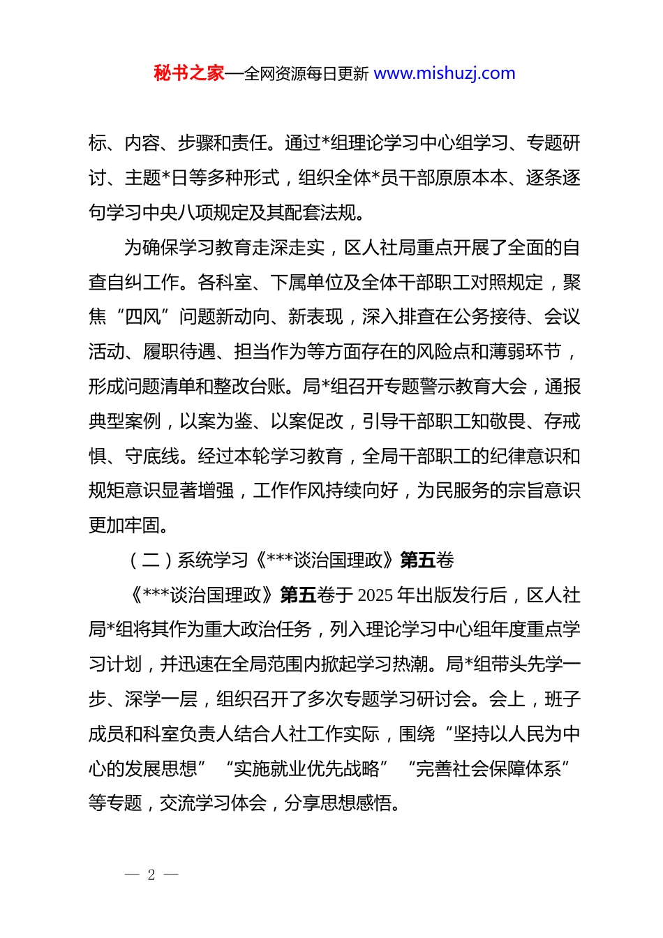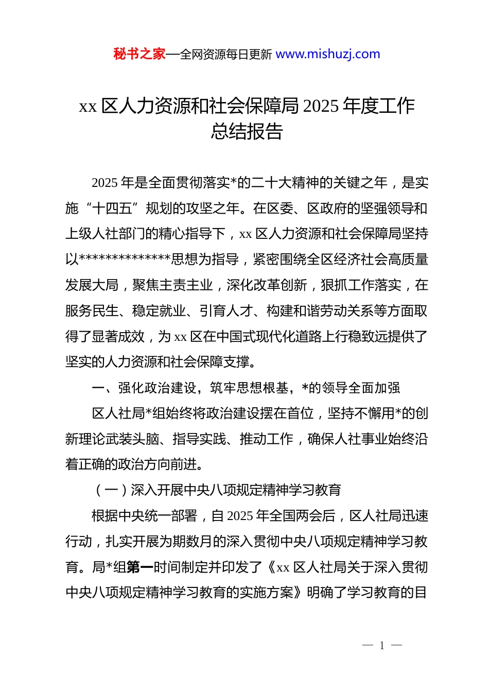 秘书之家—全网资源每日更新 www.mishuzj.comxx 区人力资源和社会保障局 2025 年度工作总结报告2025 年是全面贯彻落实*的二十大精神的关键之年,是实施“十四五”规划的攻坚之年。在区委、区政府的坚强领导和上级人社部门的精心指导下,xx 区人力资源和社会保障局坚持以**************思想为指导,紧密围绕全区经济社会高质量发展大局,聚焦主责主业,深化改革创新,狠抓工作落实,在服务民生、稳定就业、引育人才、构建和谐劳动关系等方面取得了显著成效,为 xx 区在中国式现代化道路上行稳致远提供了坚实的人力资源和社会保障支撑。一、强化政治建设,筑牢思想根基,*的领导全面加强区人社局*组始终将政治建设摆在首位,坚持不懈用*的创新理论武装头脑、指导实践、推动工作,确保人社事业始终沿着正确的政治方向前进。(一)深入开展中央八项规定精神学习教育根据中央统一部署,自 2025 年全国两会后,区人社局迅速行动,扎实开展为期数月的深入贯彻中央八项规定精神学习教育。局*组第一时间制定并印发了《xx 区人社局关于深入贯彻中央八项规定精神学习教育的实施方案》明确了学习教育的目— 1 —秘书之家—全网资源每日更新 www.mishuzj.com标、内容、步骤和责任。通过*组理论学习中心组学习、专题研讨、主题*日等多种形式,组织全体*员干部原原本本、逐条逐句学习中央八项规定及其配套法规。为确保学习教育走深走实,区人社局重点开展了全面的自查自纠工作。各科室、下属单位及全体干部职工对照规定,聚焦“四风”问题新动向、新表现,深入排查在公务接待、会议活动、履职待遇、担当作为等方面存在的风险点和薄弱环节,形成问题清单和整改台账。局*组召开专题警示教育大会,通报典型案例,以案为鉴、以案促改,引导干部职工知敬畏、存戒惧、守底线。经过本轮学习教育,全局干部职工的纪律意识和规矩意识显著增强,工作作风持续向好,为民服务的宗旨意识更加牢固。(二)系统学习《***谈治国理政》第五卷《***谈治国理政》第五卷于 2025 年出版发行后,区人社局*组将其作为重大政治任务,列入理论学习中心组年度重点学习计划,并迅速在全局范围内掀起学习热潮。局*组带头先学一步、深学一层,组织召开了多次专题学习研讨会。会上,班子成员和科室负责人结合人社工作实际,围绕“坚持以人民为中心的发展思想”“实施就业优先战略”“完善社会保障体系”等专题,交流学习体会,分享思想感悟。— 2 —秘书之家—全网资源每日更新 www.mishuzj.com学习活动注重理论与实践的深度融合。全局干部职工通过个人自学、支部共学等方式,深刻领会其中蕴含的马克思主义立场观点方法,特别是关于中国式现代化、高质量发展、增进民生福祉等重要论述。大家一致认为,书中的思想为解决当前人社领域的重点难点问题,如结构性就业矛盾、社保基金可持续发展、高层次人才引育等,提供了根本遵循和行动指南。通过学习,全局上下进一步统一了思想、凝聚了共识,将学习成果转化为推动人社事业高质量发展的强大动力和具体举措。(三)全面贯彻*的二十届四中全会精神*的二十届四中全会于 2025 年胜利召开,为国家治理体系和治理能力现代化擘画了新的宏伟蓝图。区人社局*组将学习宣传贯彻全会精神作为当前和今后一个时期的首要政治任务。全会闭幕后,局*组立即召开专题会议,传达学习全会公报和******重要讲话精神,研究部署贯彻落实工作。为确保全会精神入脑入心,区人社局利用局网站、宣传栏等阵地开设宣贯专栏,并组织了多层次、全覆盖的学习活动。各*支部通过“三会一课”、专题组织生活会等形式,组织*员干部深入研讨。学习重点聚焦全会对完善分配制度、健全社会保障体系、强化就业优先政策、构建和谐劳动关系等方面提出的新部署新要求。全局干部职工深刻认识到,作为民生保障部— 3 —秘书之家—全网资源每日更新 www.mishuzj.com门,必须在推进国家治理现代化中展现新担当、新作为。大家纷纷表示,要将全会精神与人社工作职能紧密结合,聚焦补短板、强弱项、固底板、扬优势,以实际行动推动全会精神在 xx区人社领域落地生根、开花结果。二、聚焦主责主业,服务发展大局,人...