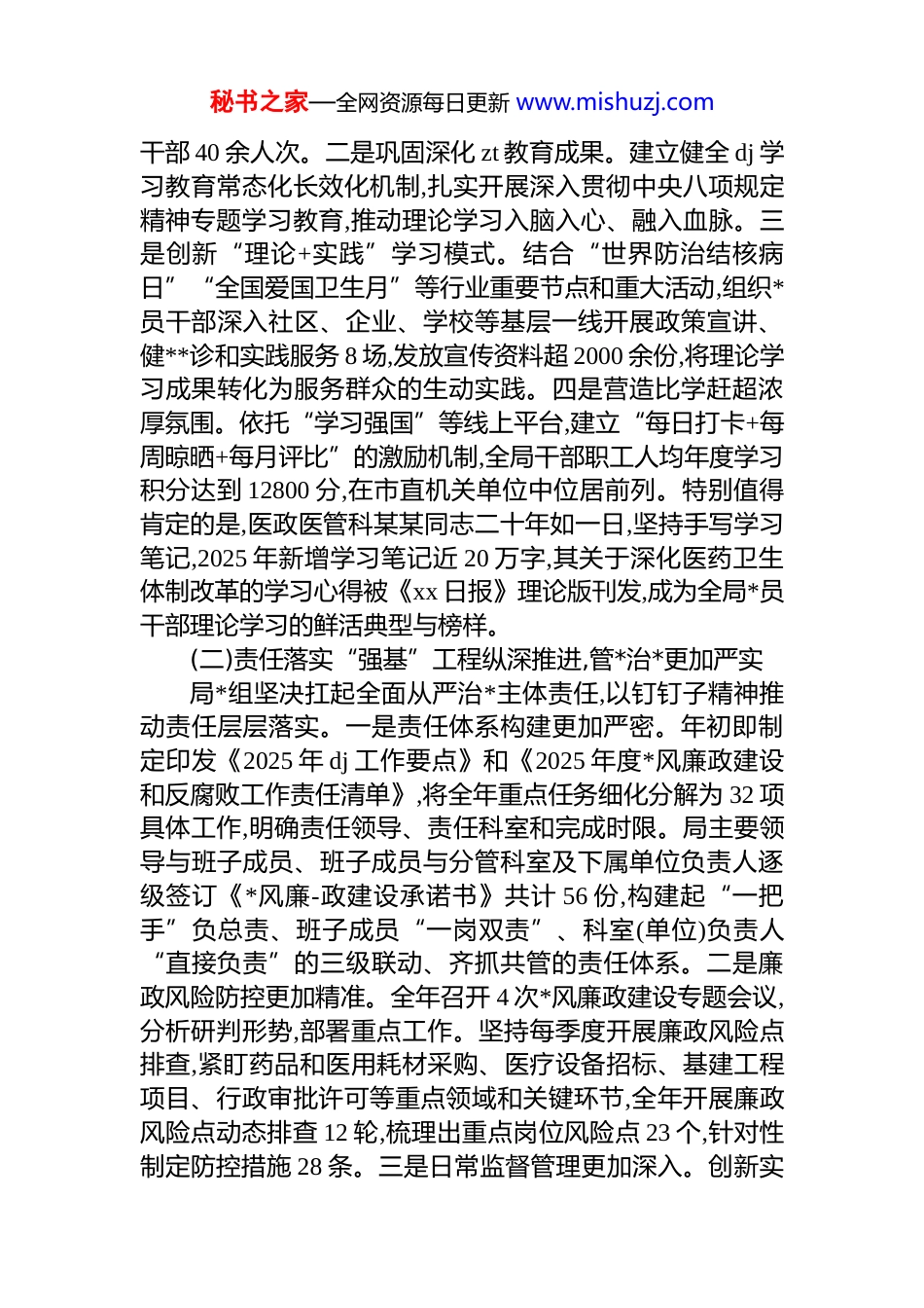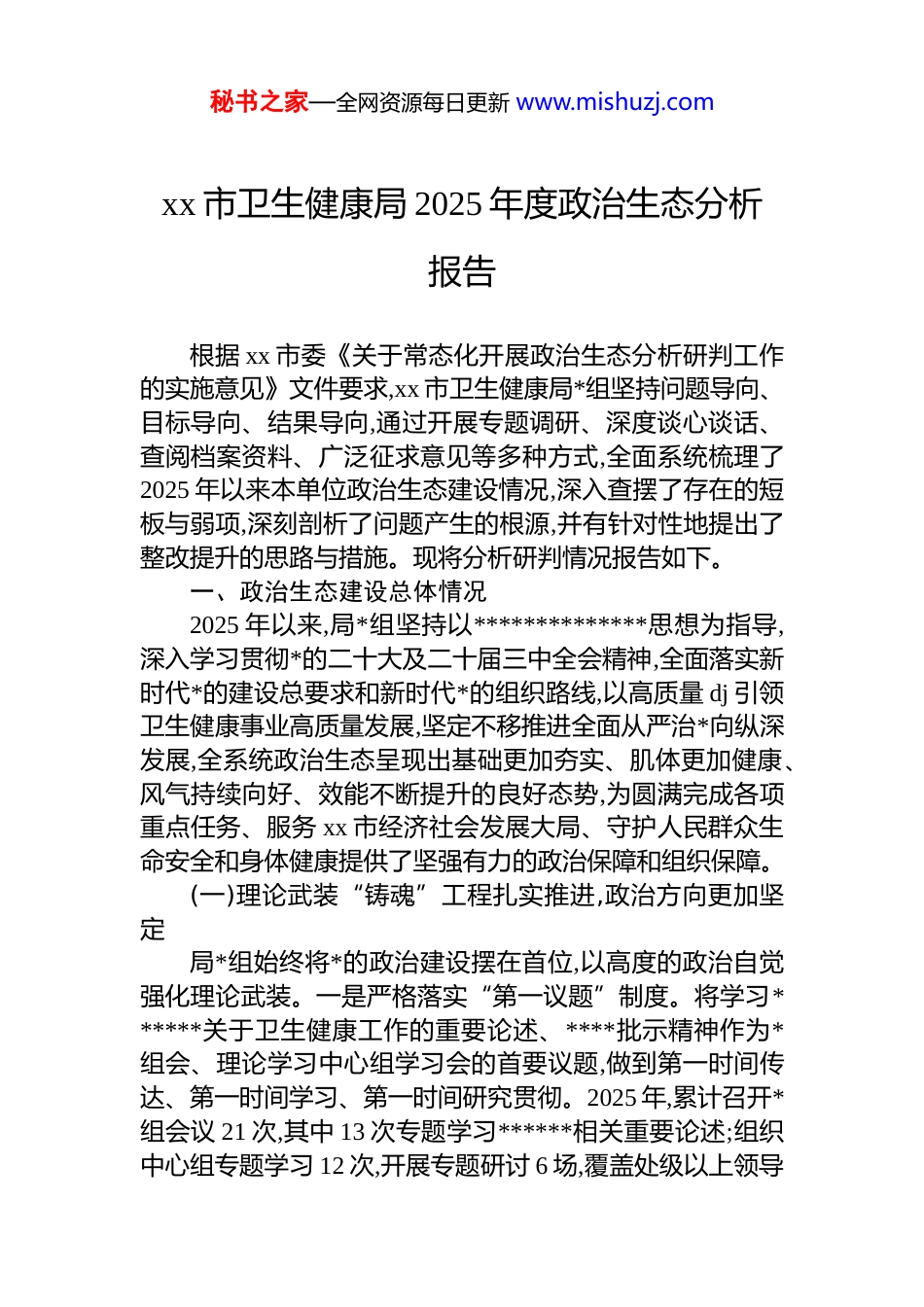 秘书之家—全网资源每日更新 www.mishuzj.comxx 市卫生健康局 2025 年度政治生态分析报告根据 xx 市委《关于常态化开展政治生态分析研判工作的实施意见》文件要求,xx 市卫生健康局*组坚持问题导向、目标导向、结果导向,通过开展专题调研、深度谈心谈话、查阅档案资料、广泛征求意见等多种方式,全面系统梳理了2025 年以来本单位政治生态建设情况,深入查摆了存在的短板与弱项,深刻剖析了问题产生的根源,并有针对性地提出了整改提升的思路与措施。现将分析研判情况报告如下。一、政治生态建设总体情况2025 年以来,局*组坚持以**************思想为指导,深入学习贯彻*的二十大及二十届三中全会精神,全面落实新时代*的建设总要求和新时代*的组织路线,以高质量 dj 引领卫生健康事业高质量发展,坚定不移推进全面从严治*向纵深发展,全系统政治生态呈现出基础更加夯实、肌体更加健康、风气持续向好、效能不断提升的良好态势,为圆满完成各项重点任务、服务 xx 市经济社会发展大局、守护人民群众生命安全和身体健康提供了坚强有力的政治保障和组织保障。(一)理论武装“铸魂”工程扎实推进,政治方向更加坚定局*组始终将*的政治建设摆在首位,以高度的政治自觉强化理论武装。一是严格落实“第一议题”制度。将学习******关于卫生健康工作的重要论述、****批示精神作为*组会、理论学习中心组学习会的首要议题,做到第一时间传达、第一时间学习、第一时间研究贯彻。2025 年,累计召开*组会议 21 次,其中 13 次专题学习******相关重要论述;组织中心组专题学习 12 次,开展专题研讨 6 场,覆盖处级以上领导秘书之家—全网资源每日更新 www.mishuzj.com干部 40 余人次。二是巩固深化 zt 教育成果。建立健全 dj 学习教育常态化长效化机制,扎实开展深入贯彻中央八项规定精神专题学习教育,推动理论学习入脑入心、融入血脉。三是创新“理论+实践”学习模式。结合“世界防治结核病日”“全国爱国卫生月”等行业重要节点和重大活动,组织*员干部深入社区、企业、学校等基层一线开展政策宣讲、健**诊和实践服务 8 场,发放宣传资料超 2000 余份,将理论学习成果转化为服务群众的生动实践。四是营造比学赶超浓厚氛围。依托“学习强国”等线上平台,建立“每日打卡+每周晾晒+每月评比”的激励机制,全局干部职工人均年度学习积分达到 12800 分,在市直机关单位中位居前列。特别值得肯定的是,医政医管科某某同志二十年如一日,坚持手写学习笔记,2025 年新增学习笔记近 20 万字,其关于深化医药卫生体制改革的学习心得被《xx 日报》理论版刊发,成为全局*员干部理论学习的鲜活典型与榜样。(二)责任落实“强基”工程纵深推进,管*治*更加严实局*组坚决扛起全面从严治*主体责任,以钉钉子精神推动责任层层落实。一是责任体系构建更加严密。年初即制定印发《2025 年 dj 工作要点》和《2025 年度*风廉政建设和反腐败工作责任清单》,将全年重点任务细化分解为 32 项具体工作,明确责任领导、责任科室和完成时限。局主要领导与班子成员、班子成员与分管科室及下属单位负责人逐级签订《*风廉-政建设承诺书》共计 56 份,构建起“一把手”负总责、班子成员“一岗双责”、科室(单位)负责人“直接负责”的三级联动、齐抓共管的责任体系。二是廉政风险防控更加精准。全年召开 4 次*风廉政建设专题会议,分析研判形势,部署重点工作。坚持每季度开展廉政风险点排查,紧盯药品和医用耗材采购、医疗设备招标、基建工程项目、行政审批许可等重点领域和关键环节,全年开展廉政风险点动态排查 12 轮,梳理出重点岗位风险点 23 个,针对性制定防控措施 28 条。三是日常监督管理更加深入。创新实秘书之家—全网资源每日更新 www.mishuzj.com施“嵌入式”监督模式,在核心业务环节,如 xx 区人民医院新院区建设项目的招标评审委员会、市级公立医院药品集中采购委员会等,设置“纪律观察员”,由机关纪委委员或*风政风监督员担任。2025 年以来,已对 12 个重点基建和采购项目、56 家医疗服务机构开展“伴随式”监督,及时发现并推动整改苗头性、倾向性问题 7 个,做到抓早抓小、防微杜渐。四是警示教...